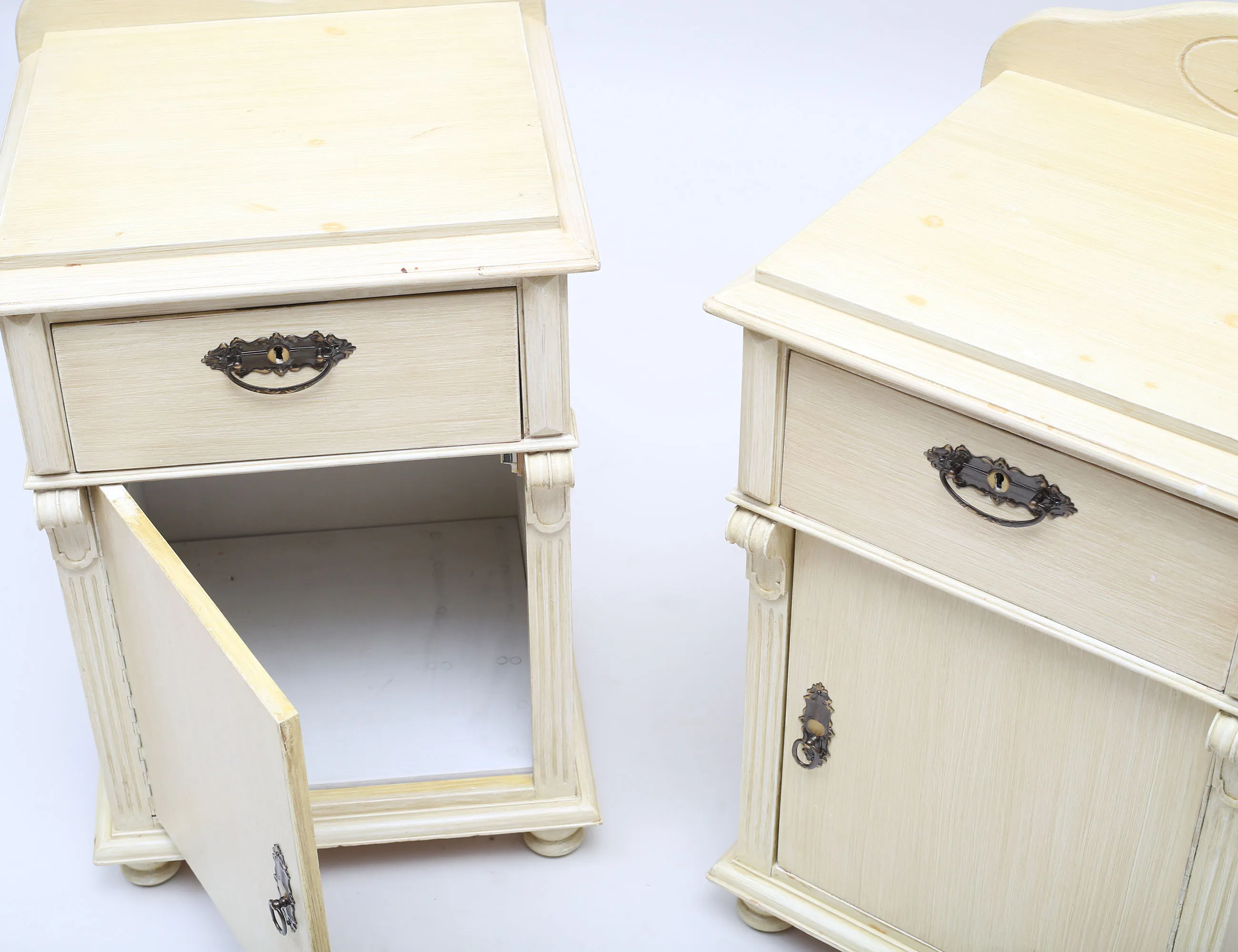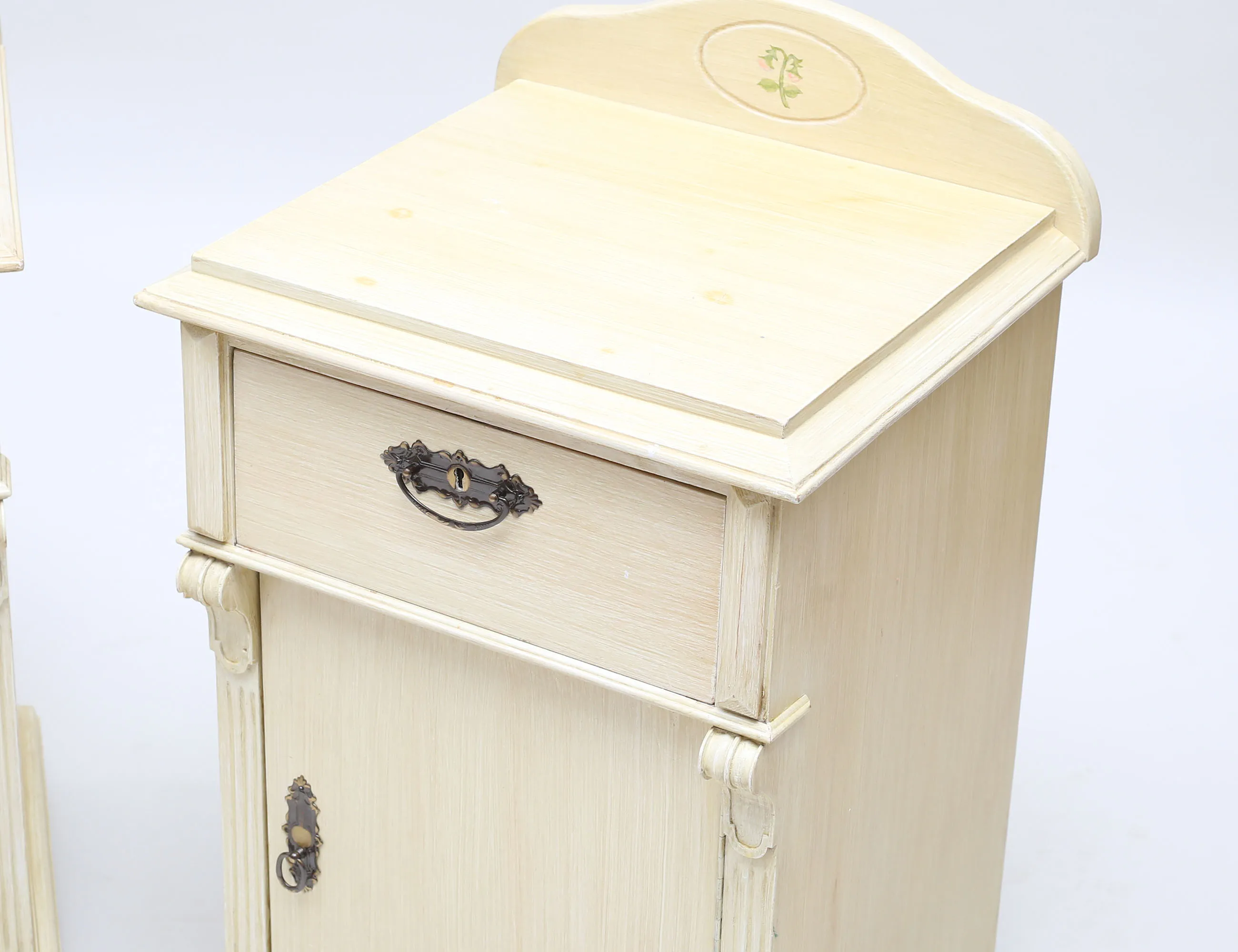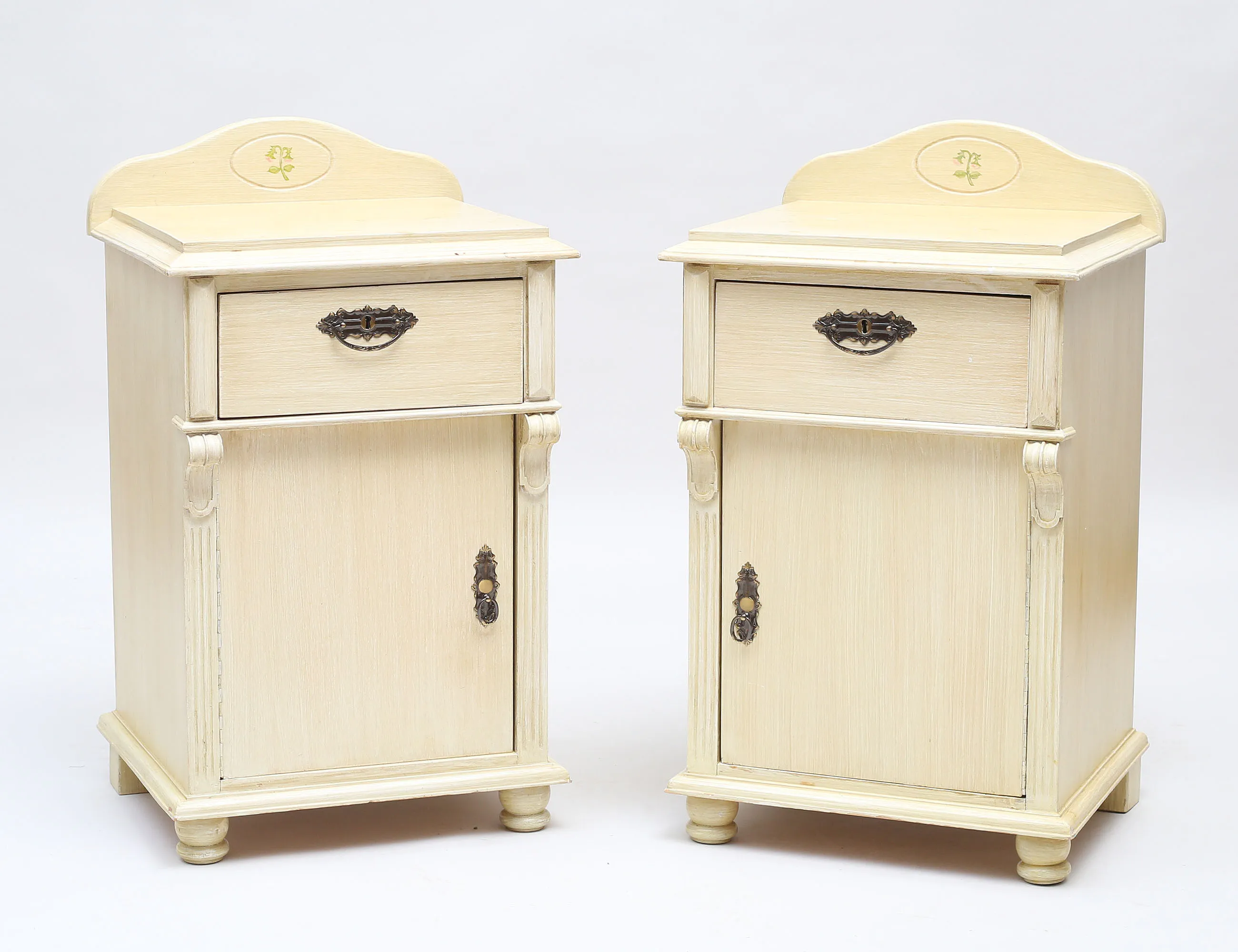 bemålade, beslag i patinerad mässing, höjd 78, bredd 45, djup 41 (fläckar)