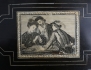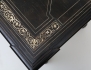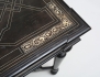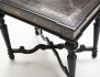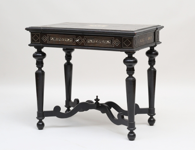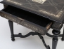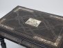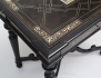 svartlackerat med intarsia av ben, skivans mitt med motiv av kortspelande män, svarvade och kopplade ben, profilerad skiva, en låda i sargen, höjd 73, bredd 81, djup 56 (skivan med smärre intarsiabortfall/retuscher)