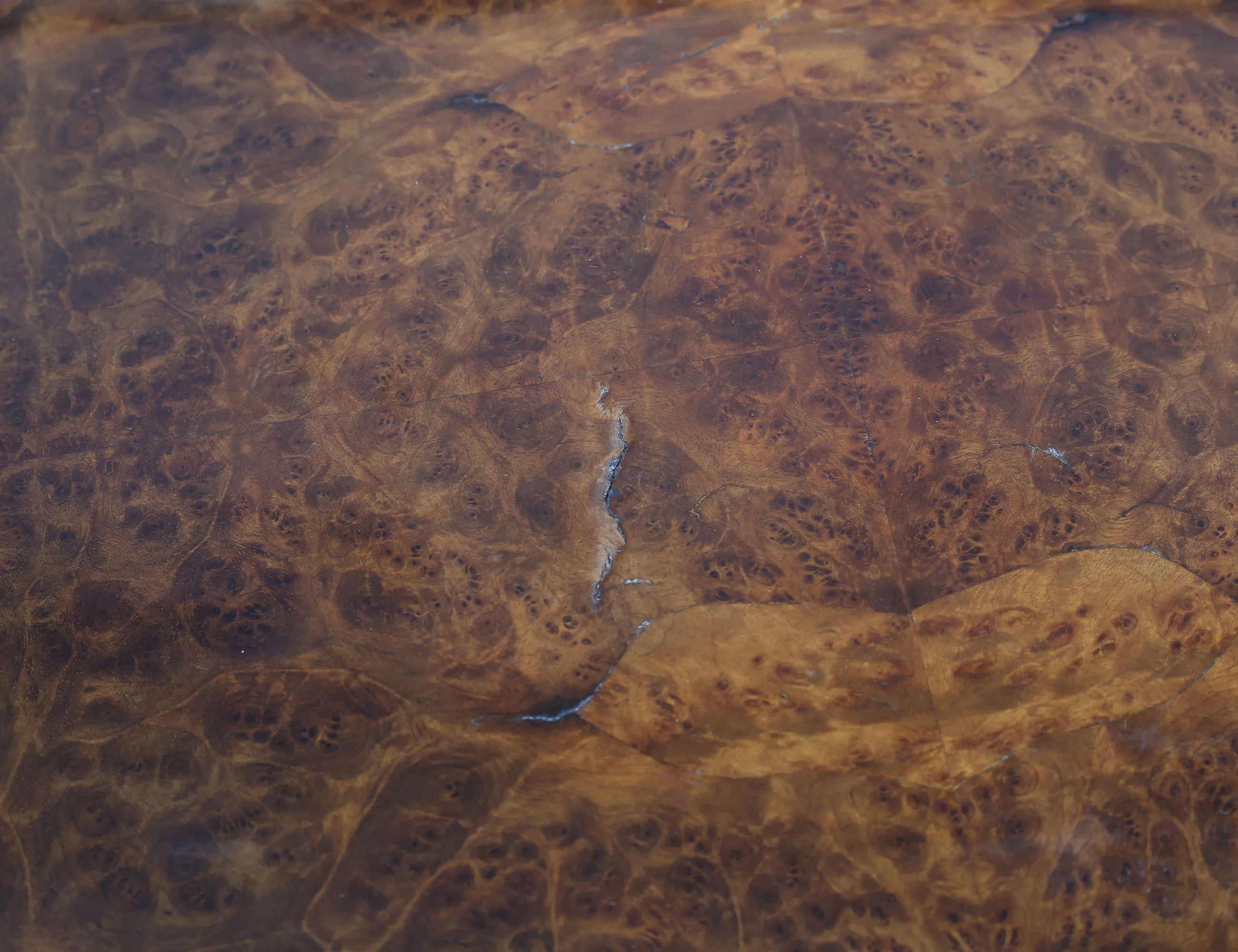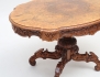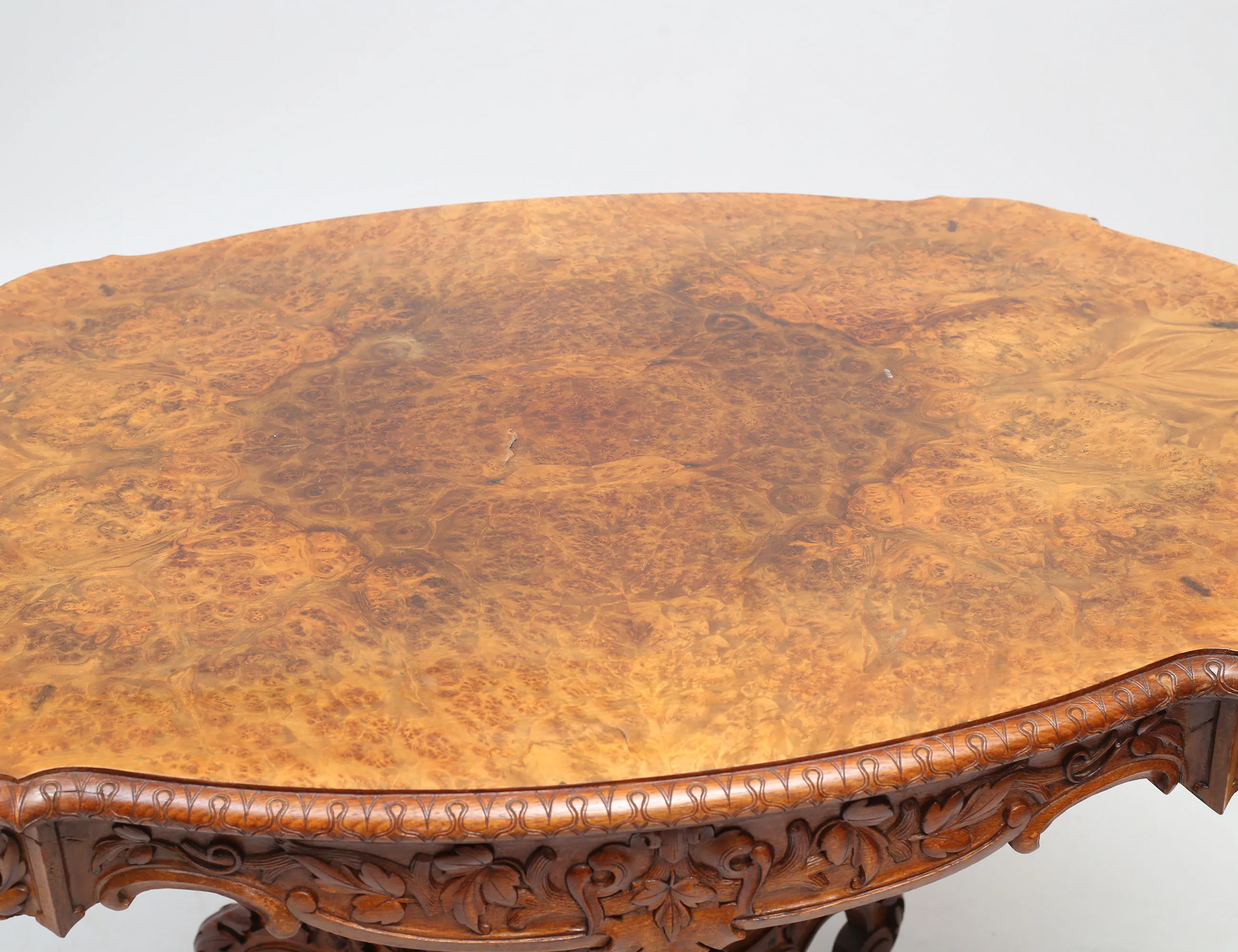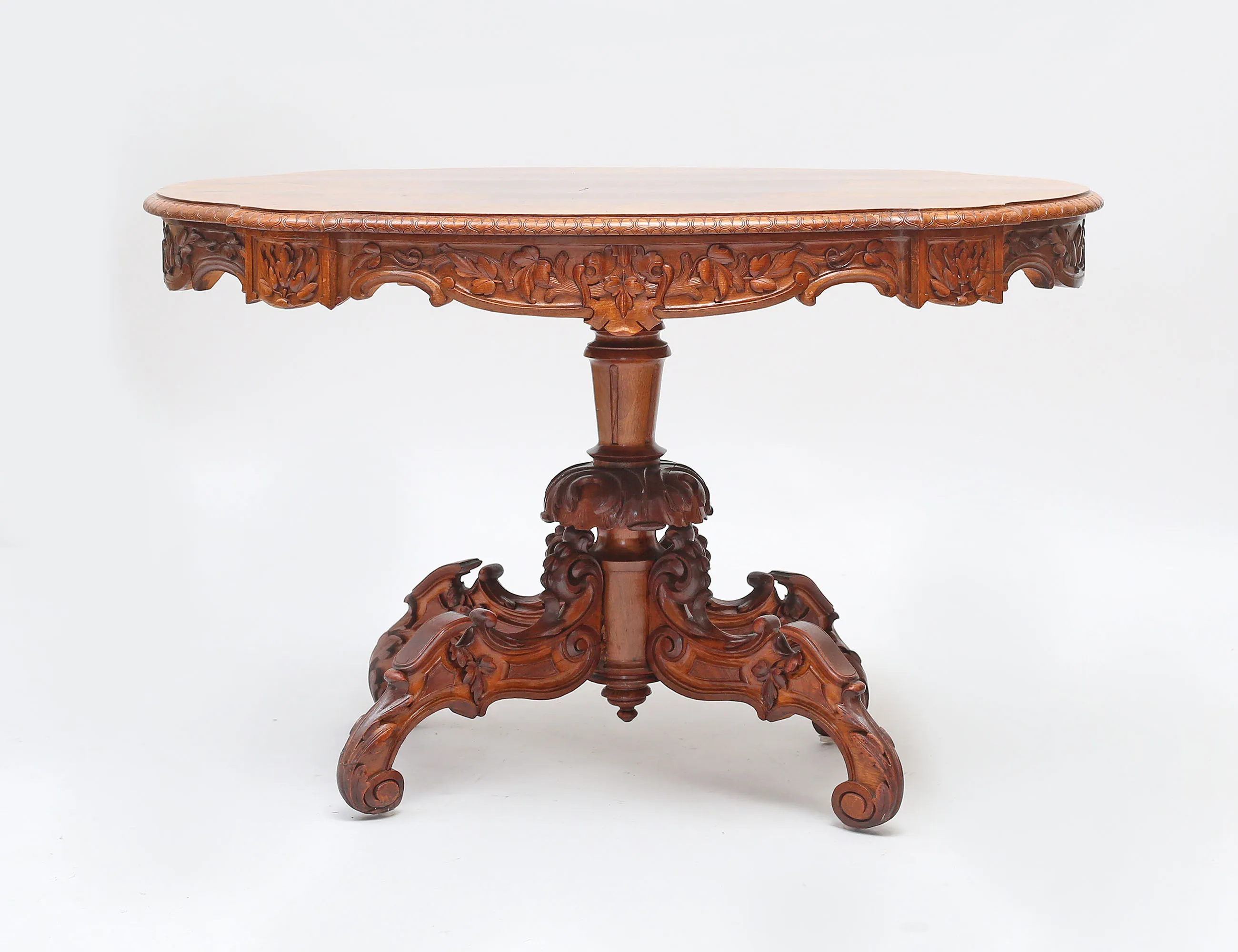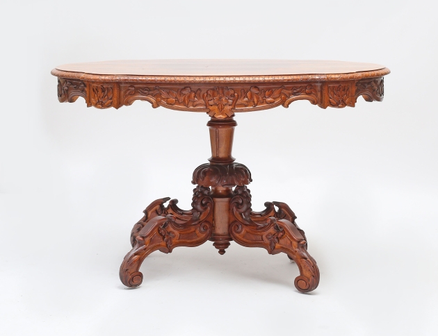 valnöt och valnötsrot, rikt träskuren dekor, fyrgrenad centralfot, konturerad skiva, höjd 76, bredd 118x77