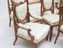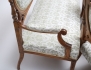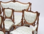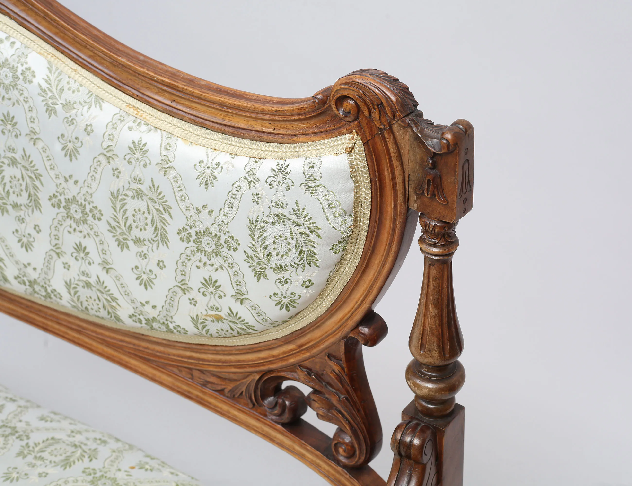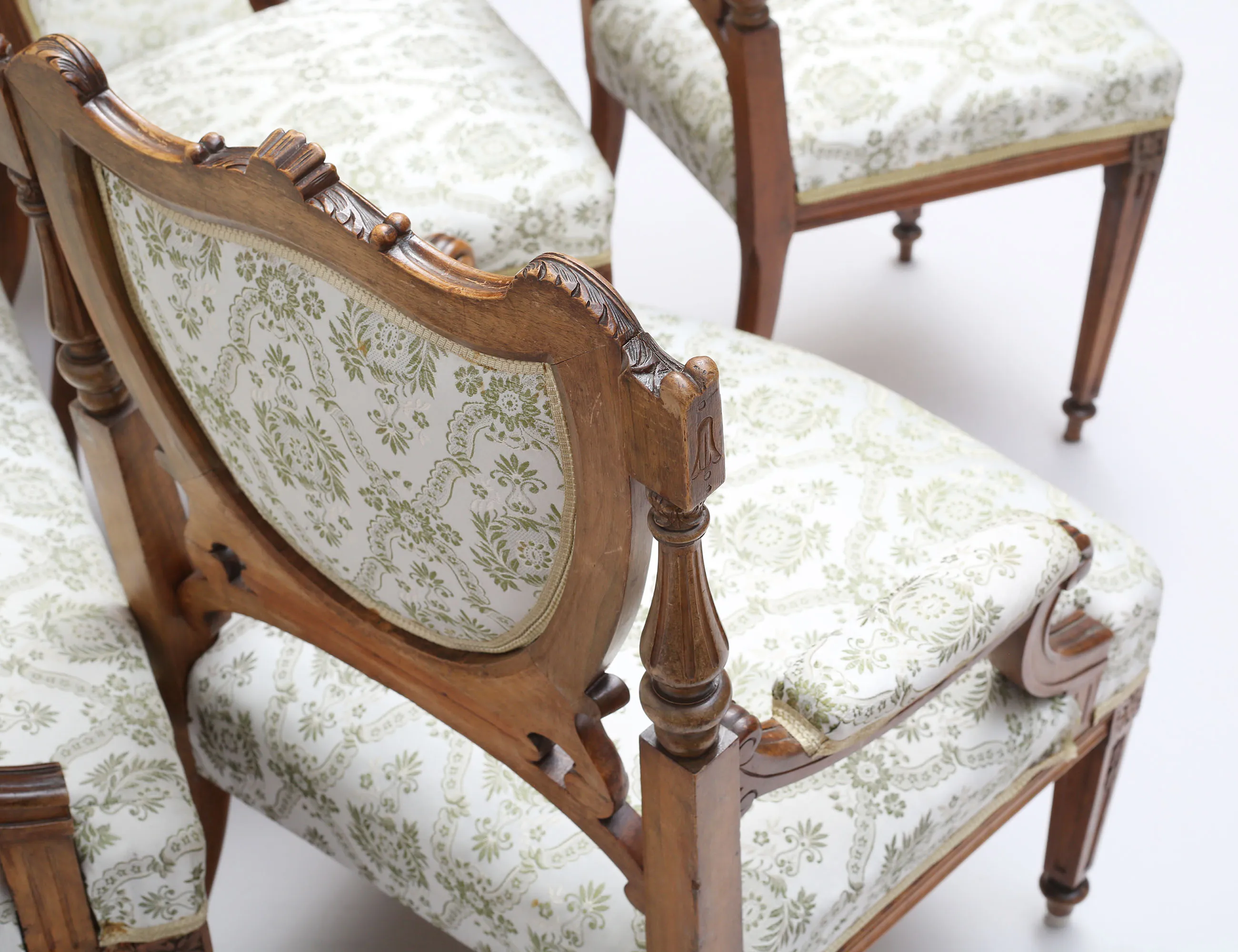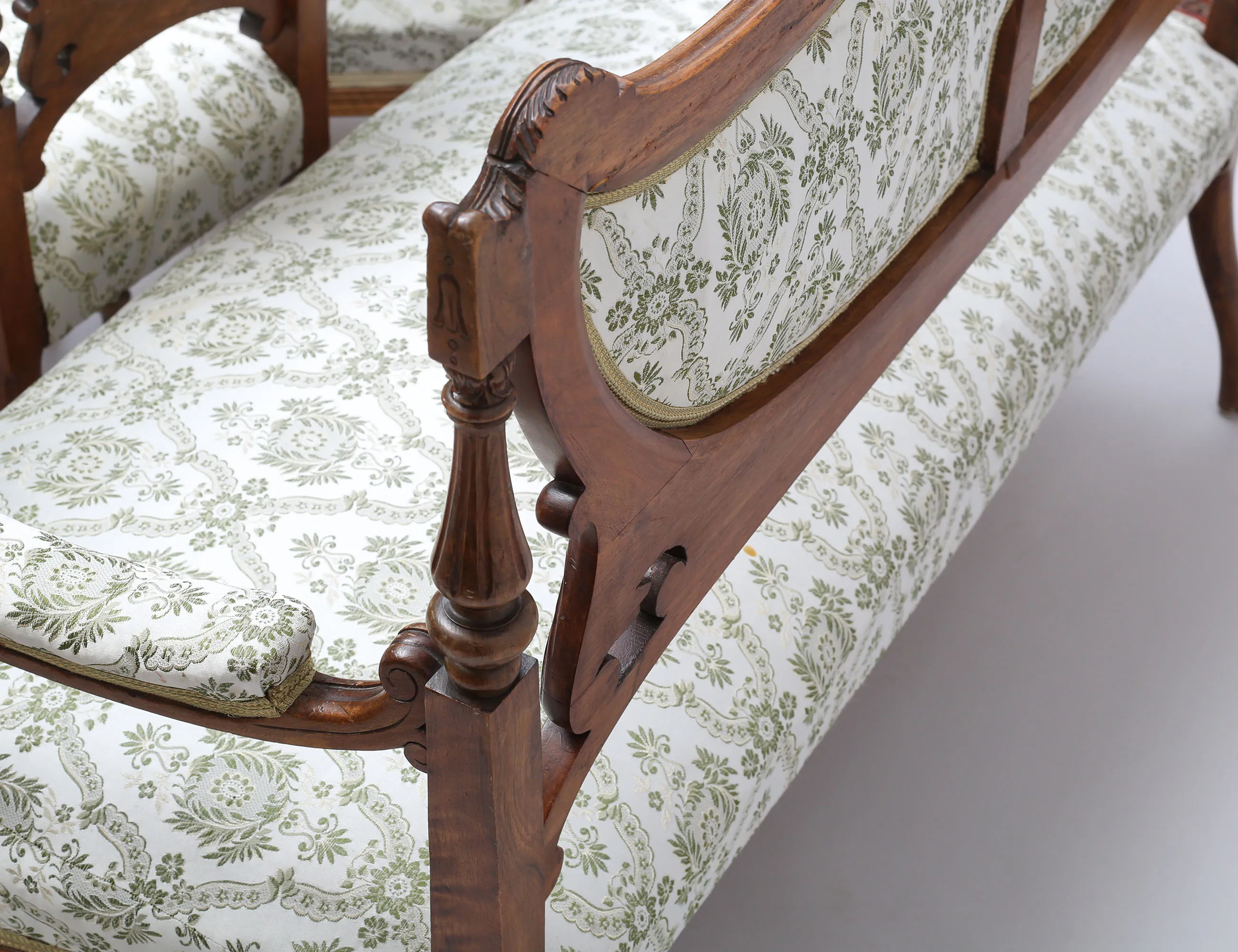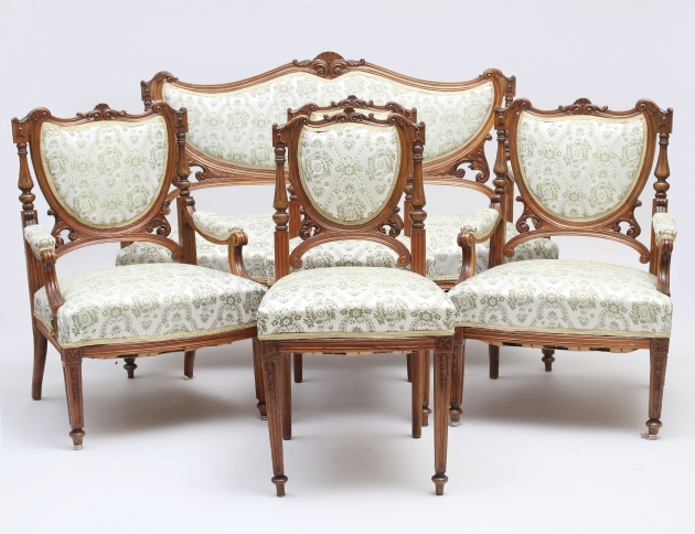 soffa, 2 karmstolar samt 2 stolar, mörkbetsad, rikt träskuren dekor, stoppad sits och rygg, klädd i sidentyg, höjd 98, längd 133, djup 56 (åldersrelaterat slitage) (5)