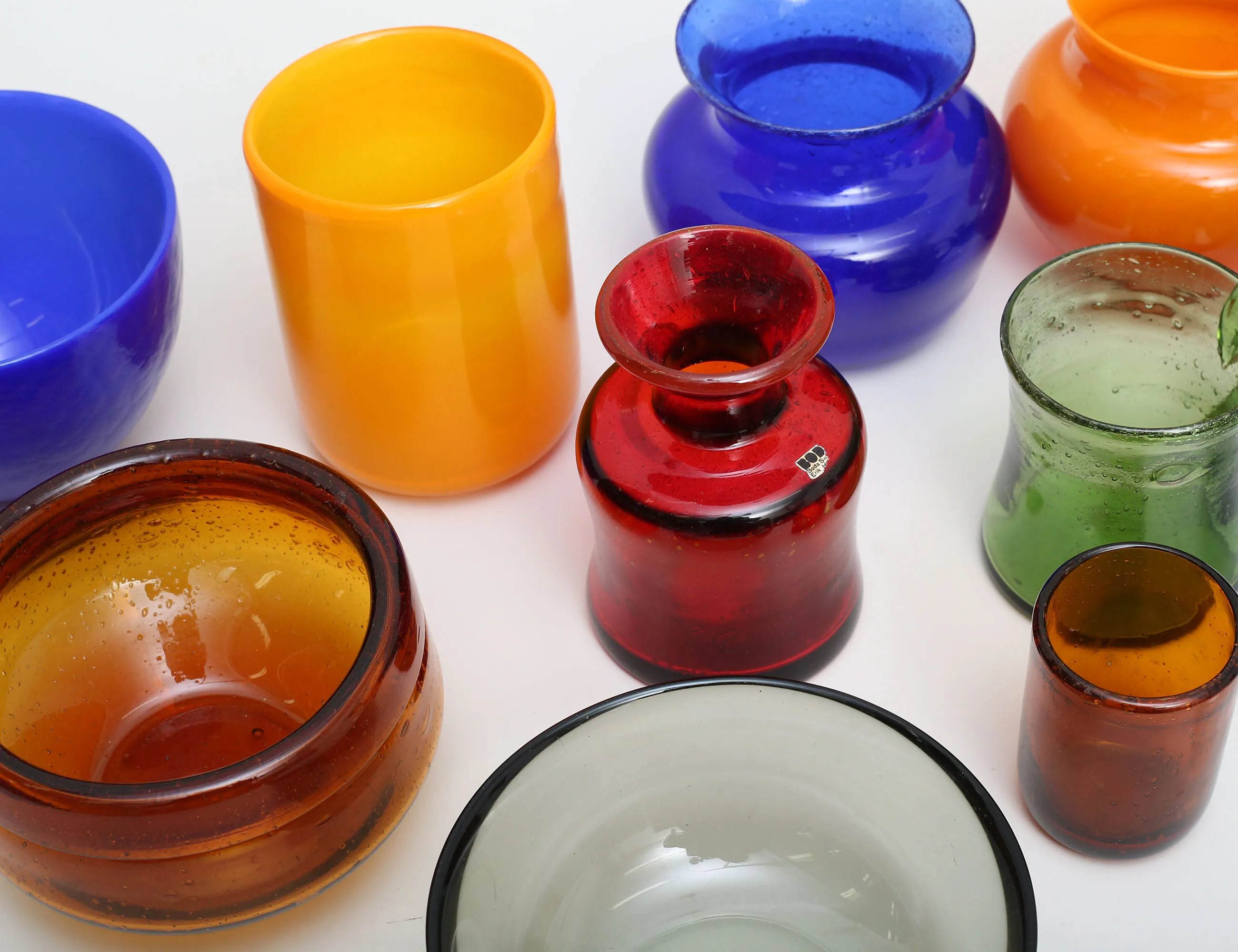 4 skålar "Fuga", Sven Palmqvist Orrefors, höjd 3-7,5, skål "Colora", Eva Englund Målerås, höjd 10, 5 vaser, skål samt sejdel, Erik Höglund Boda, höjd 8,5-14 varav 6 med signatur