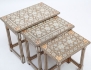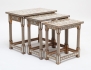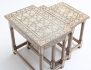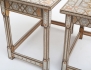 tre fristående delar, heltäckande microintarsia med inläggningar av bla. pärlemor, ben och olika träslag, höjd 42-49, bredd 40-57 (det större bordet med bortfall i intarsian)