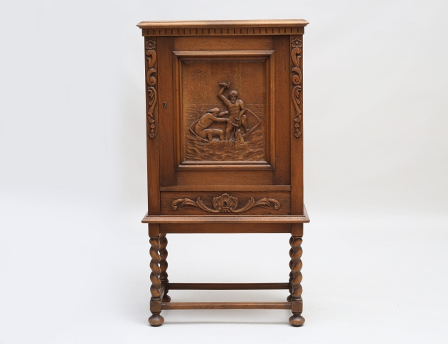 ek, träskuren dekor av bla. blommor, fiskande män, invändigt sju låder, en låda undertill, höjd 128, bredd 69, djup 37 (nyckel saknas)