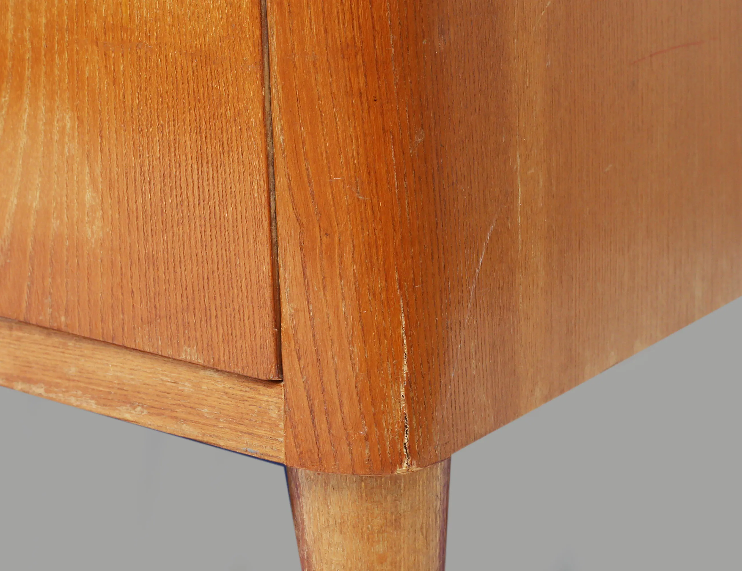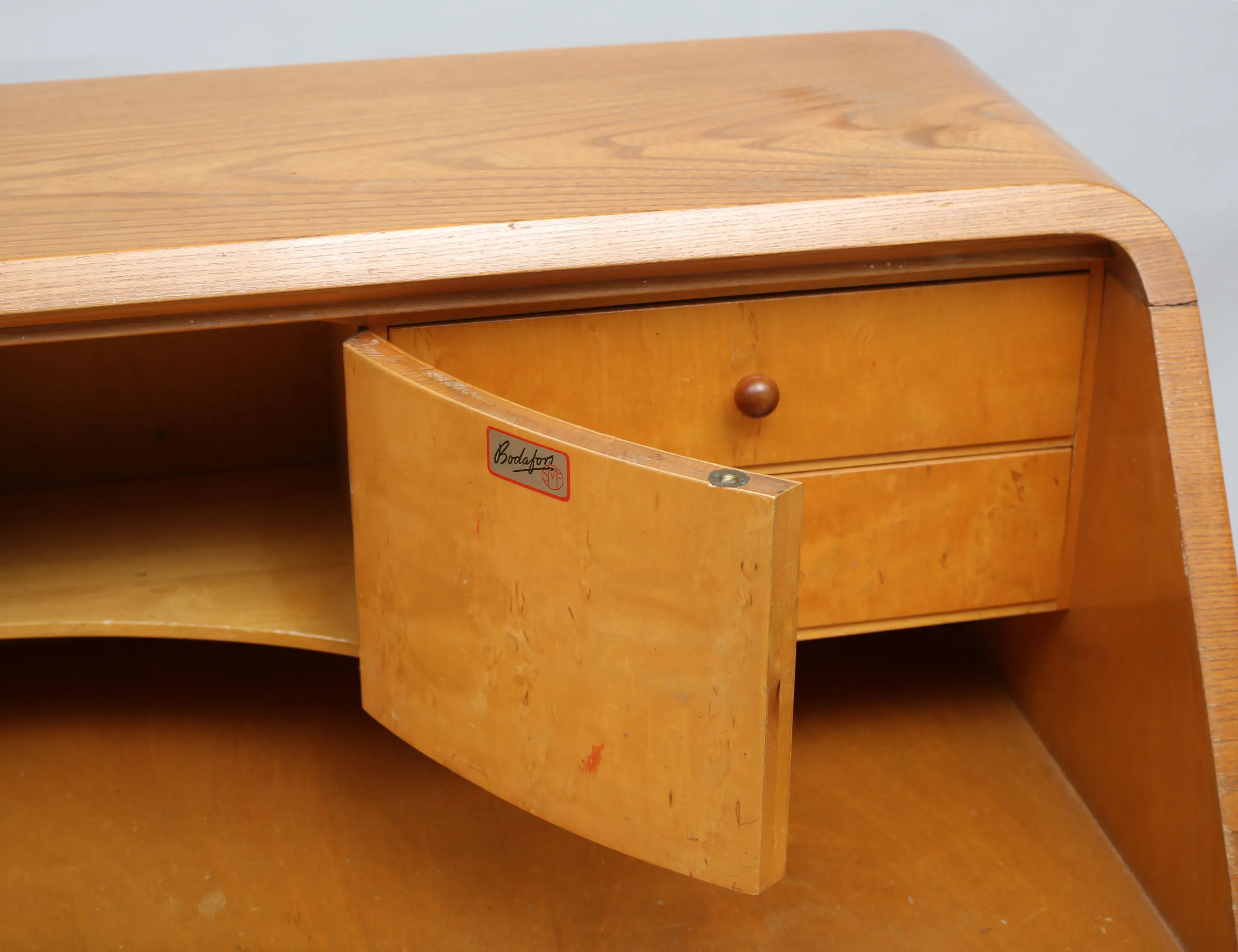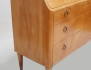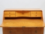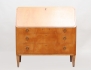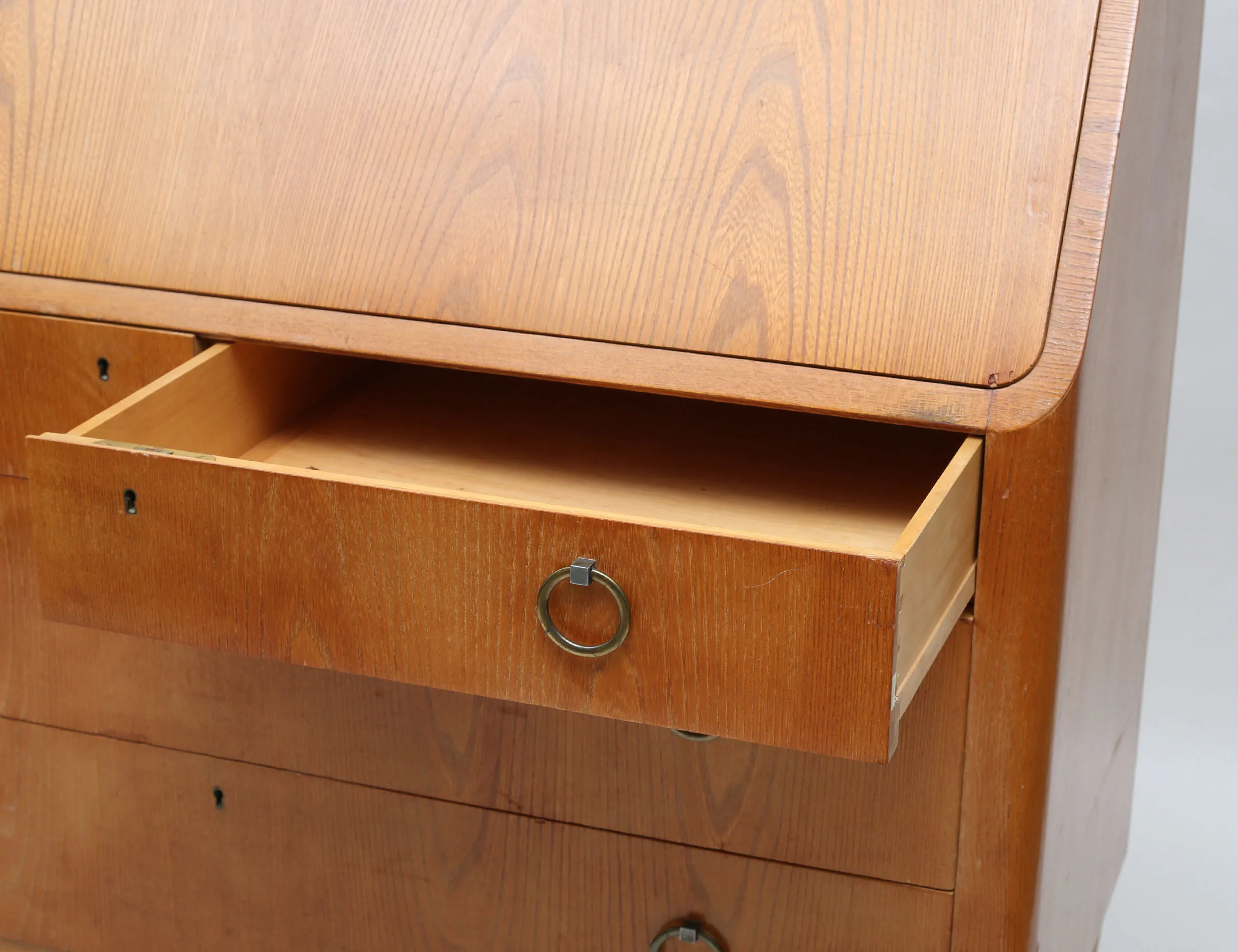 alm, lådinredning bakom klaff, fyra lådor med dragringar i mässing, etikettmärkt, höjd 99, bredd 98, djup 43 (bruksslitage)