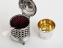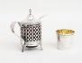 sengustaviansk, Gustaf Hamnqvist Åmål, ametistfärgad glasinsats, höjd 11, sked LL & Co Göteborg 1846, supkopp silver, oidentifierad mästare, Stockholm 1797, kraftig av hög kvalité, invändig förgyllning, höjd 4,5, vikt ca. 180 gram exklusive glasinsats (2)