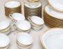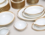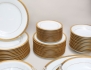Noritake China Japan 1900-talets andra hälft, förgylld dekor, hela dussin av mattallrikar, djupa tallrikar, dessert, assietter, små djupa samt kaffekoppar med fat, såsskål, 4 uppläggningsfat, sockerskål samt gräddsnipa (sockerskål saknar lock) (79)