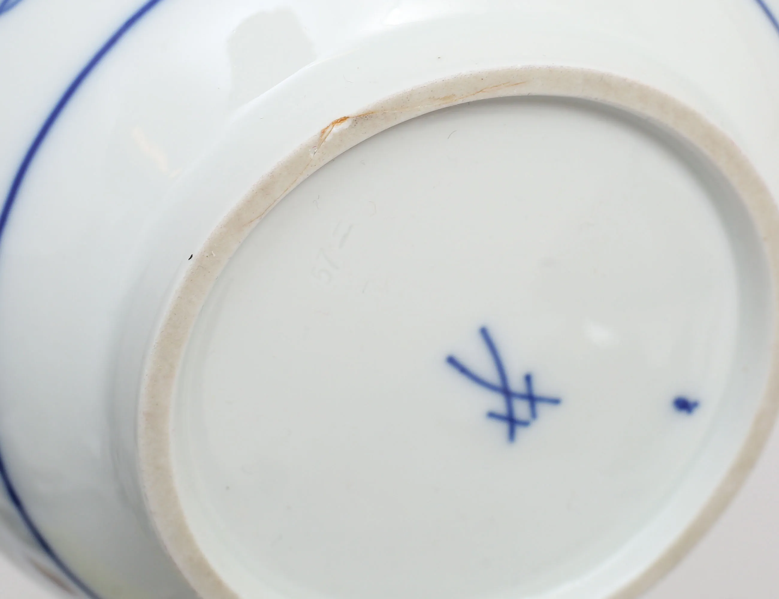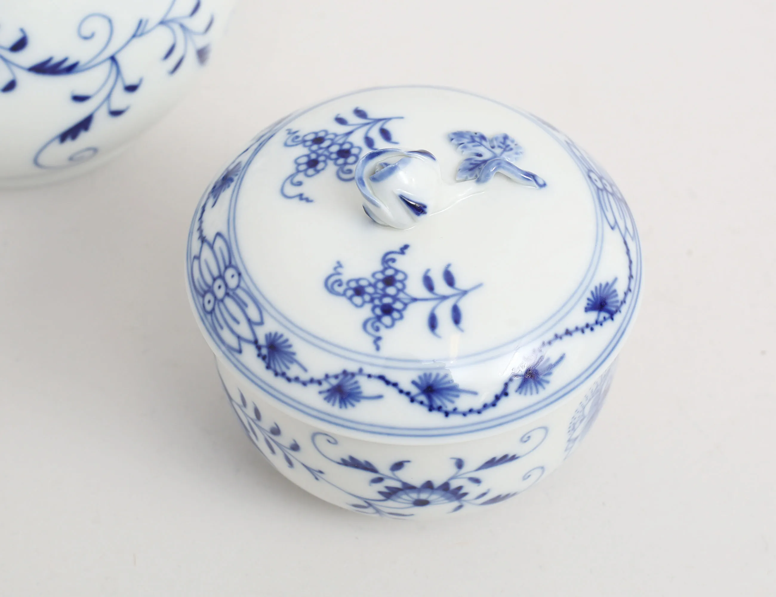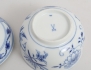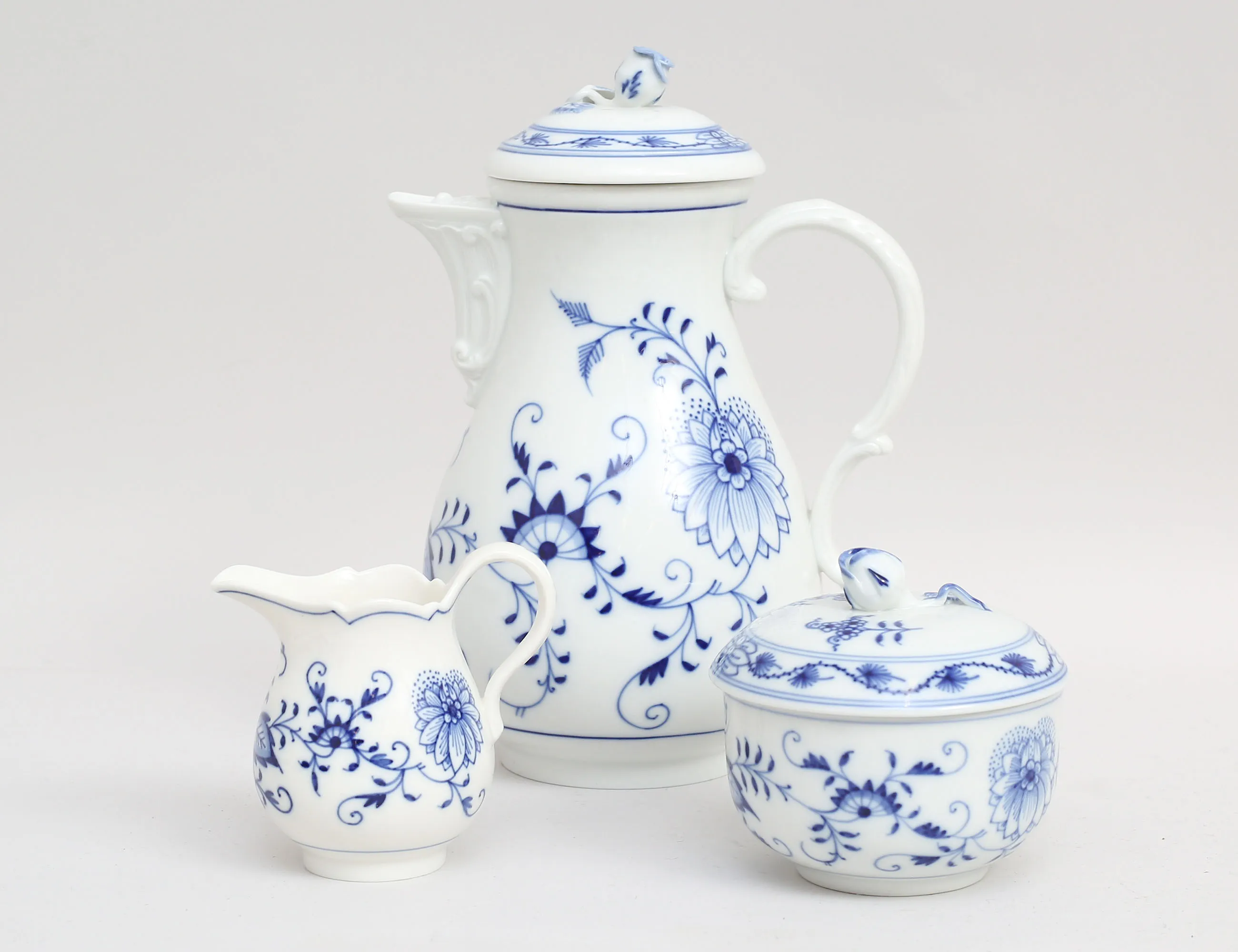 kaffekanna, sockerskål samt gräddkanna, blått lökmönster, 1:a sortering, höjd 10/24 (kaffekannan med smärre fotnagg) (3)
