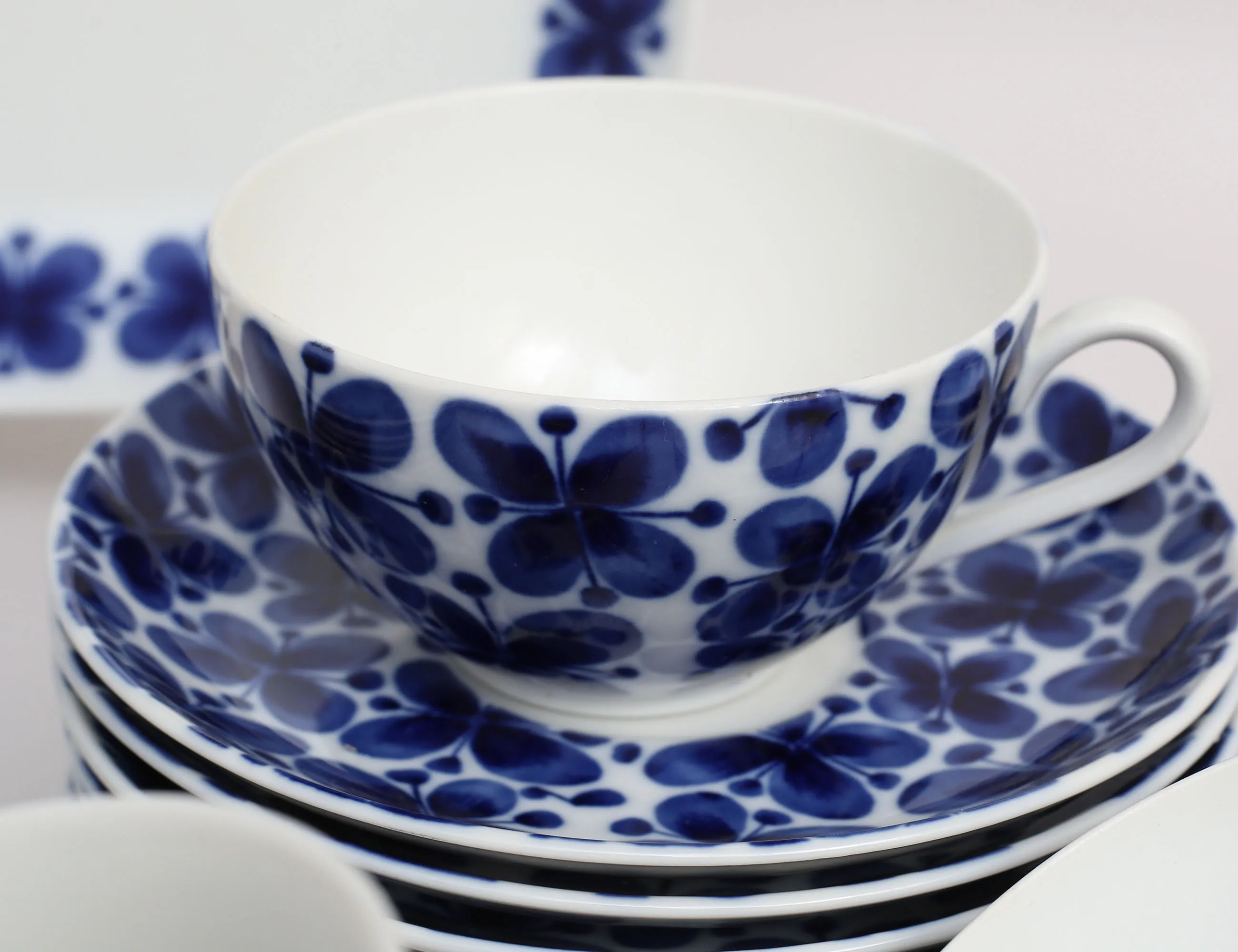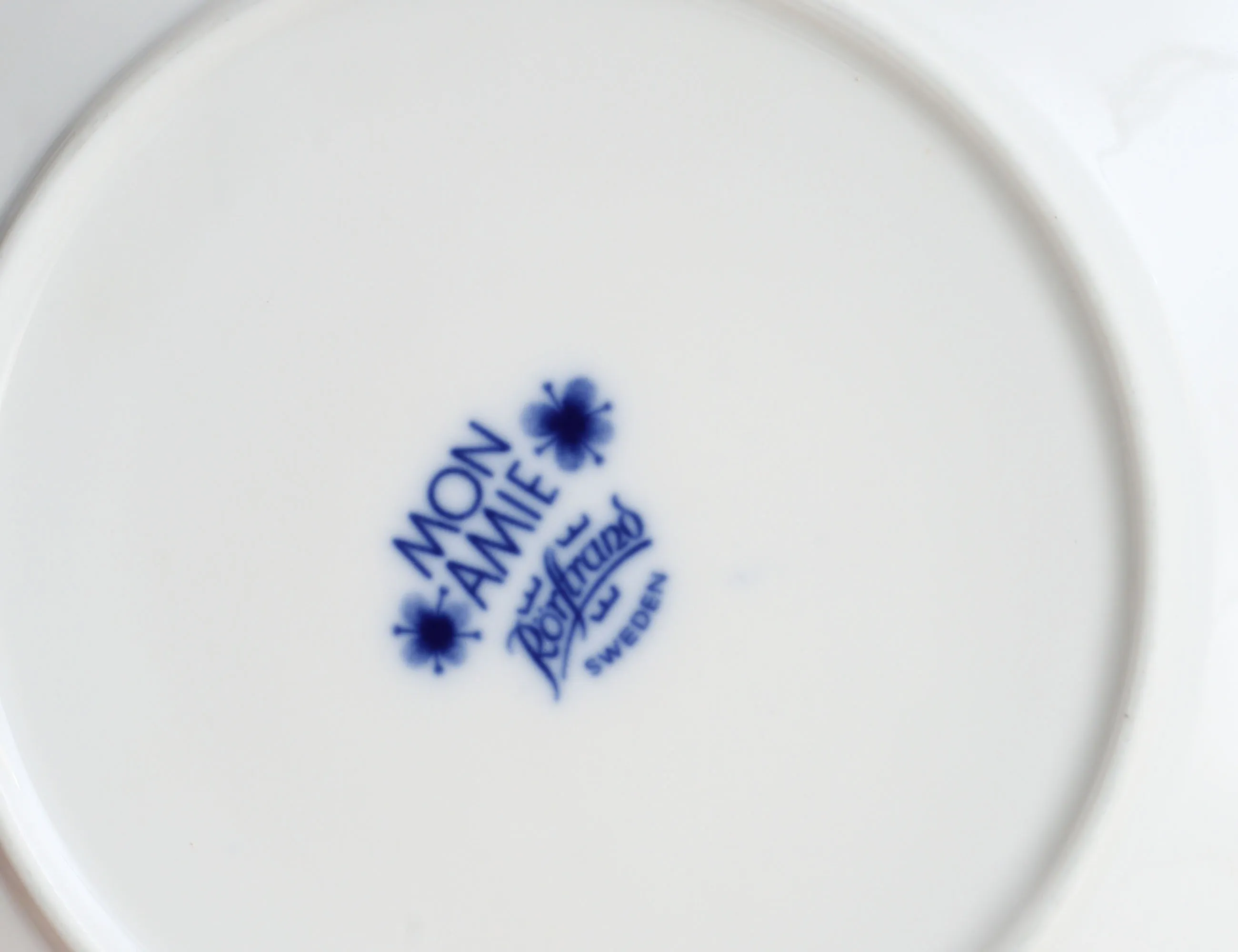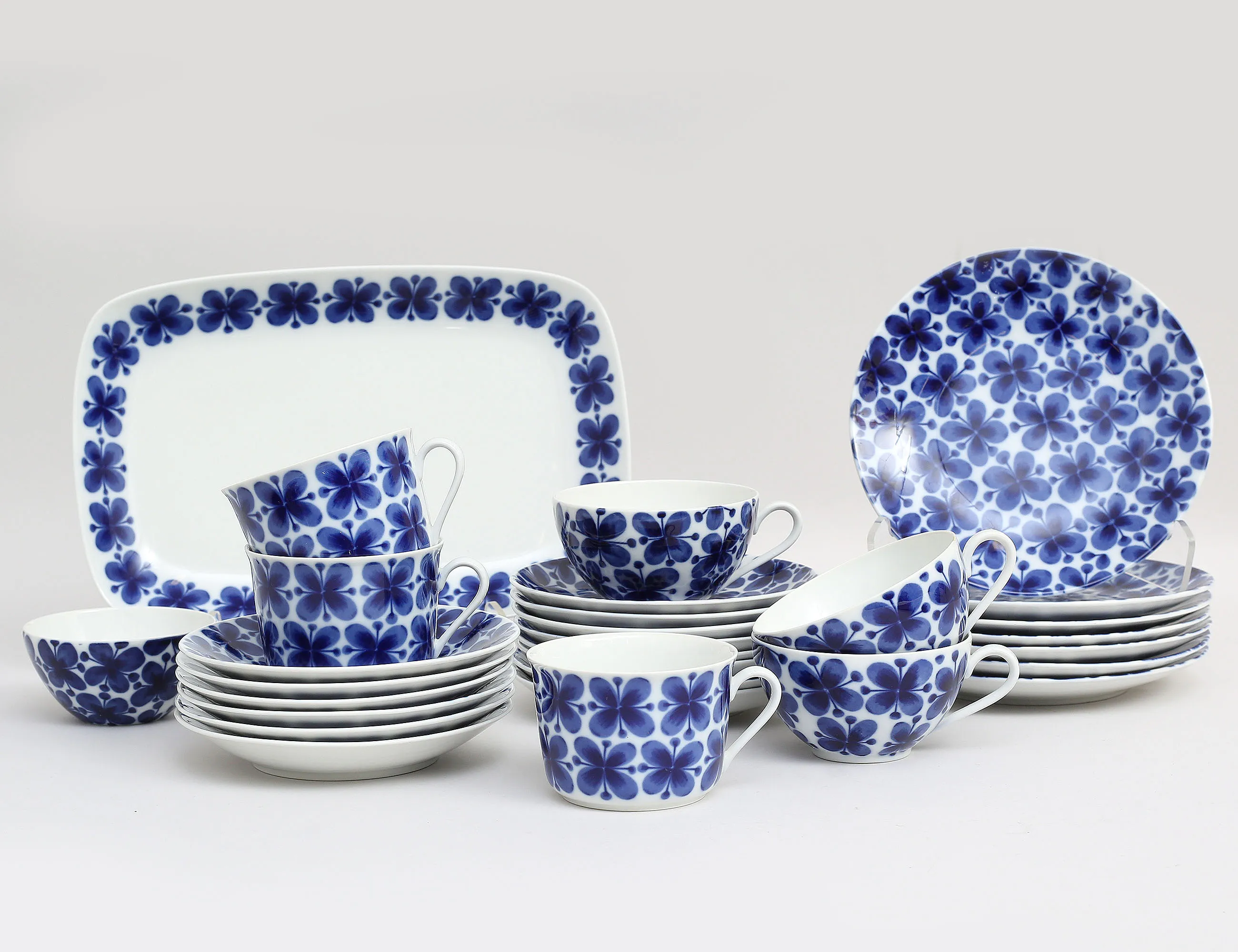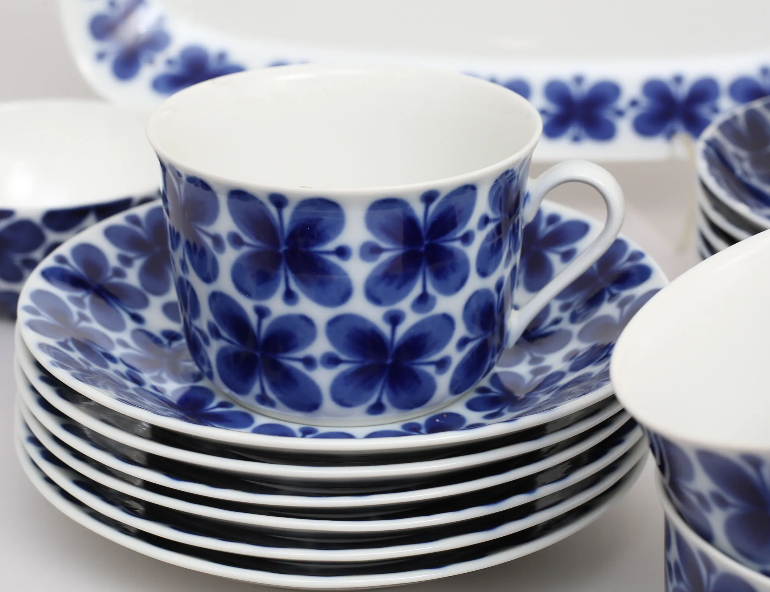 Marianne Westman Rörstrand, 3+3 tekoppar med fat, 7 assietter, sockerskål samt uppläggningsfat, höjd 6/7, diameter 19, bredd 30x20 (15)