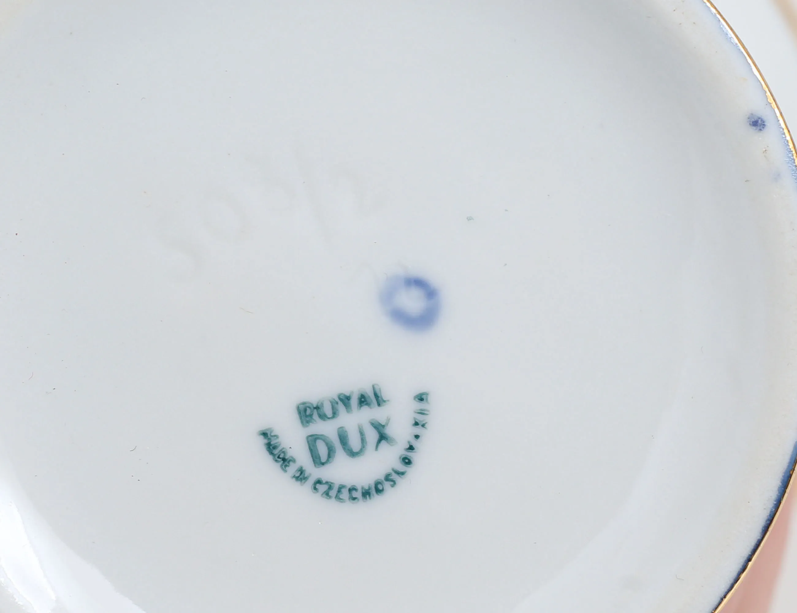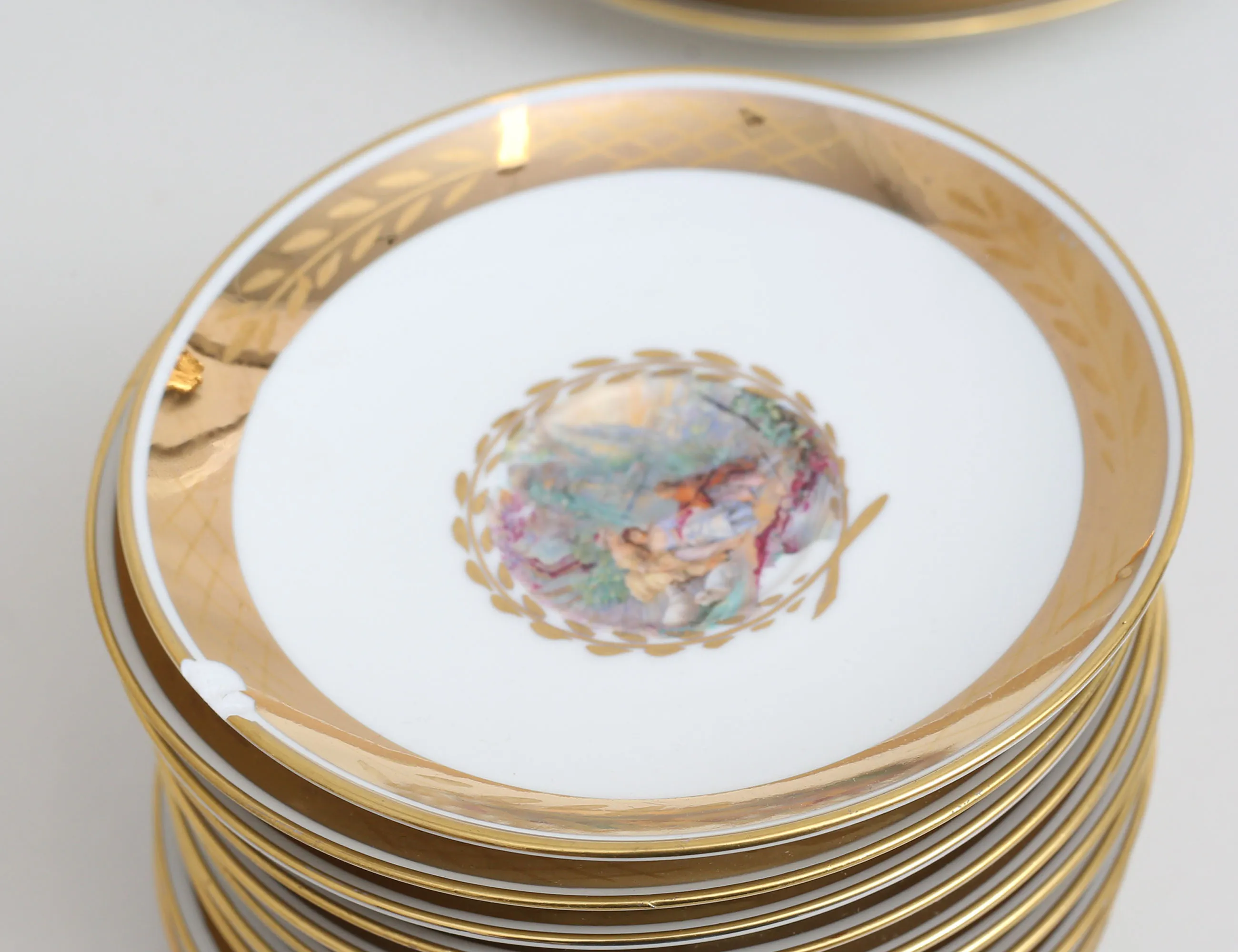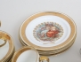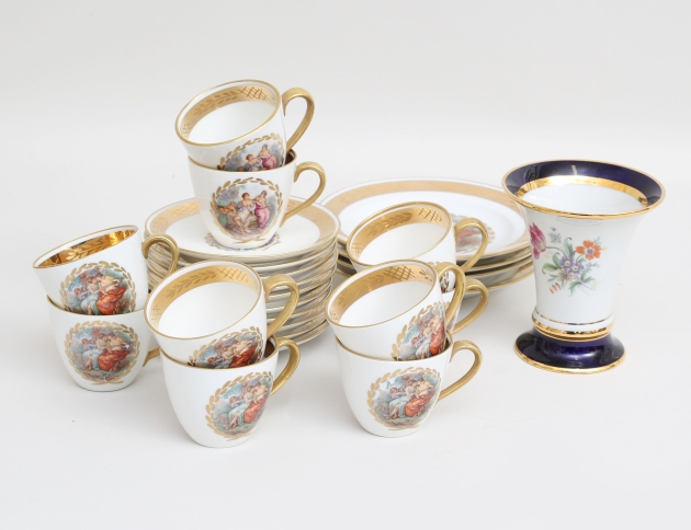 10 kaffekoppar med fat samt 4 assietter, polykrom dekor av allegoriska motiv samt förgyllning, höjd 5,5, (ett kaffefat med nagg), vas Royal Dux Tjeckoslovakien, höjd 11,5
