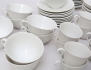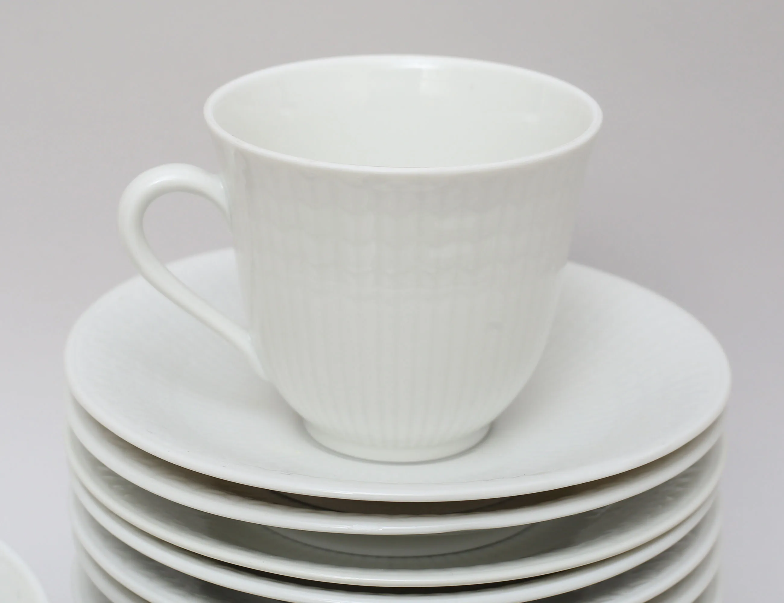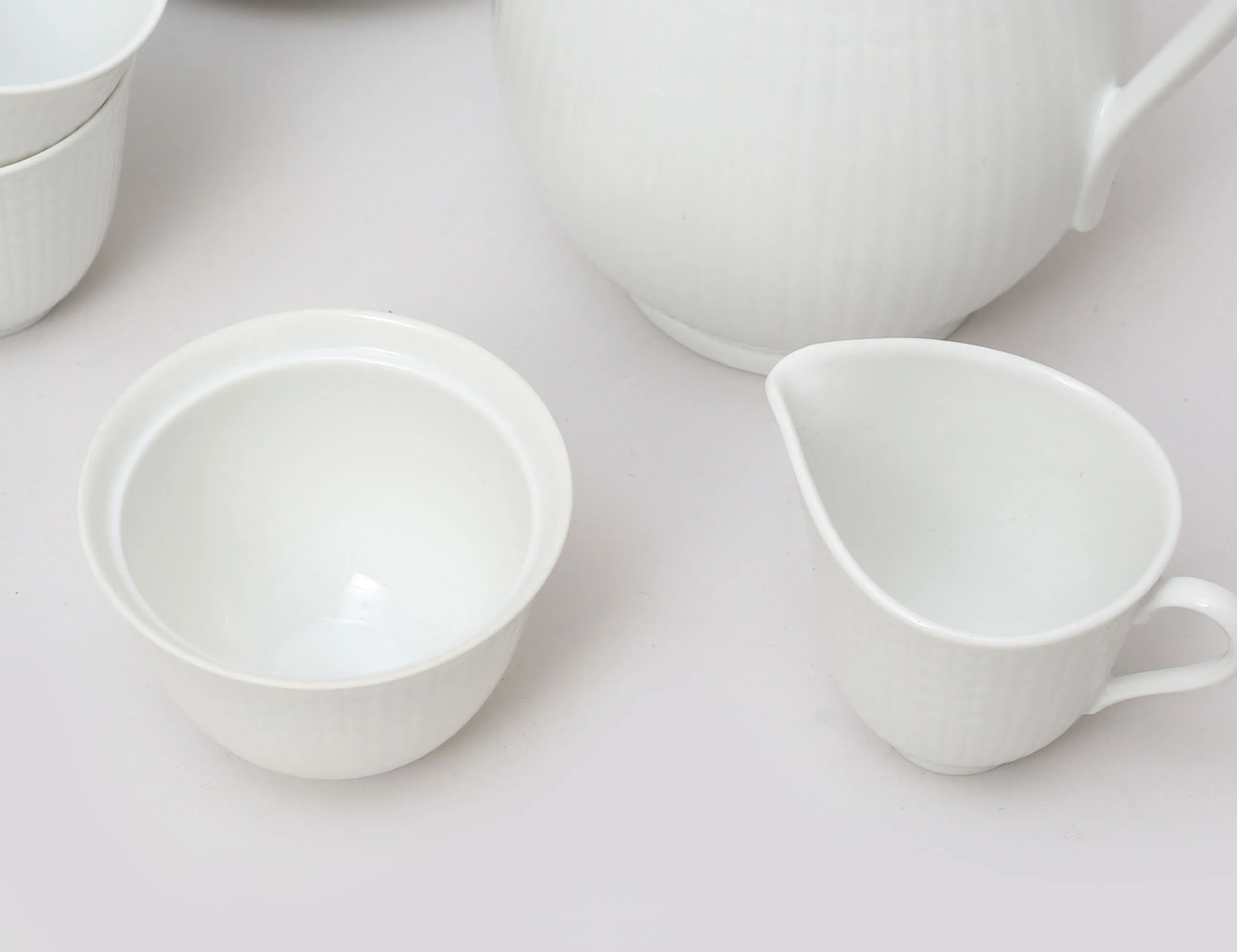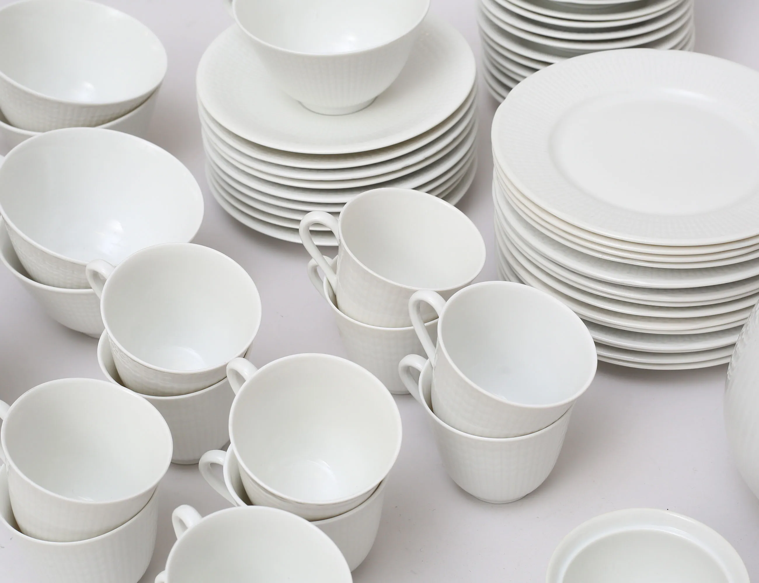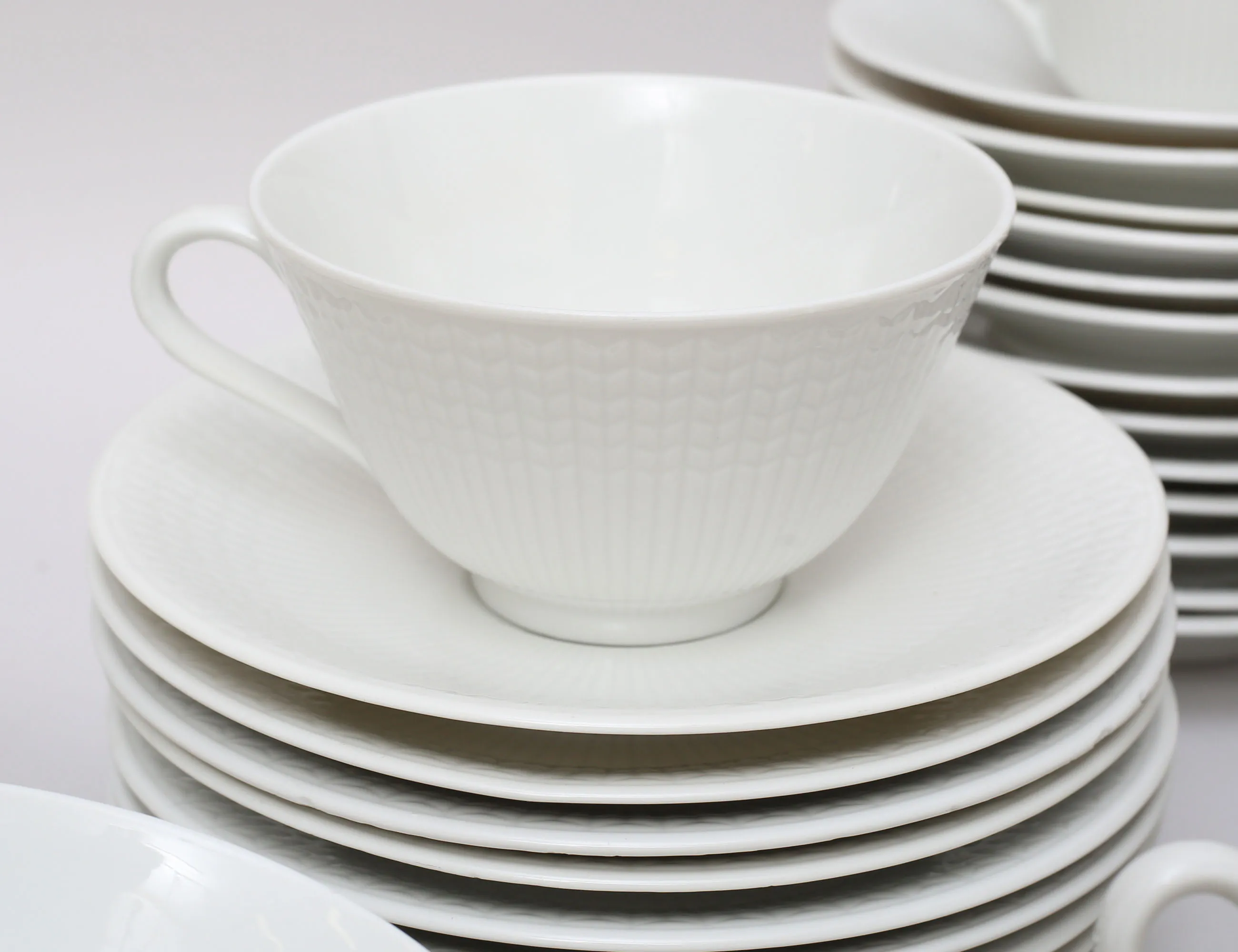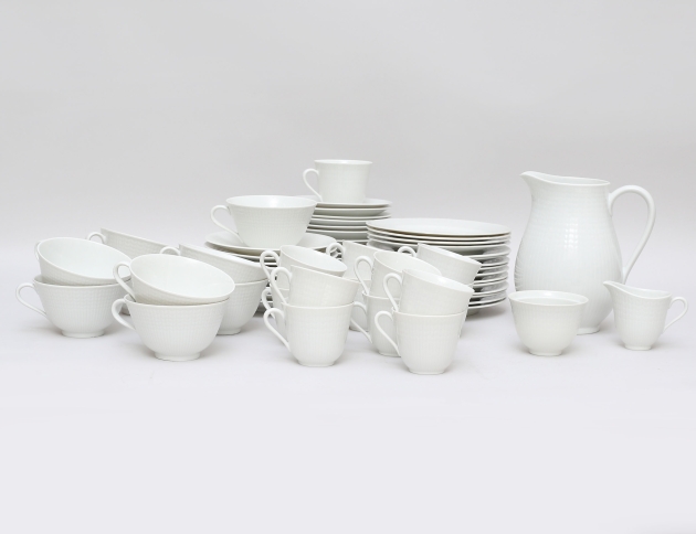 Louise Adelborg Rörstrand, 13 kaffekoppar med fat, 9 tekoppar med fat, 15 assietter, kanna, sockerskål samt gräddkanna, 2:a sortering (ett tefat och ett kaffefat med nagg, sockerskålens lock saknas) (40)