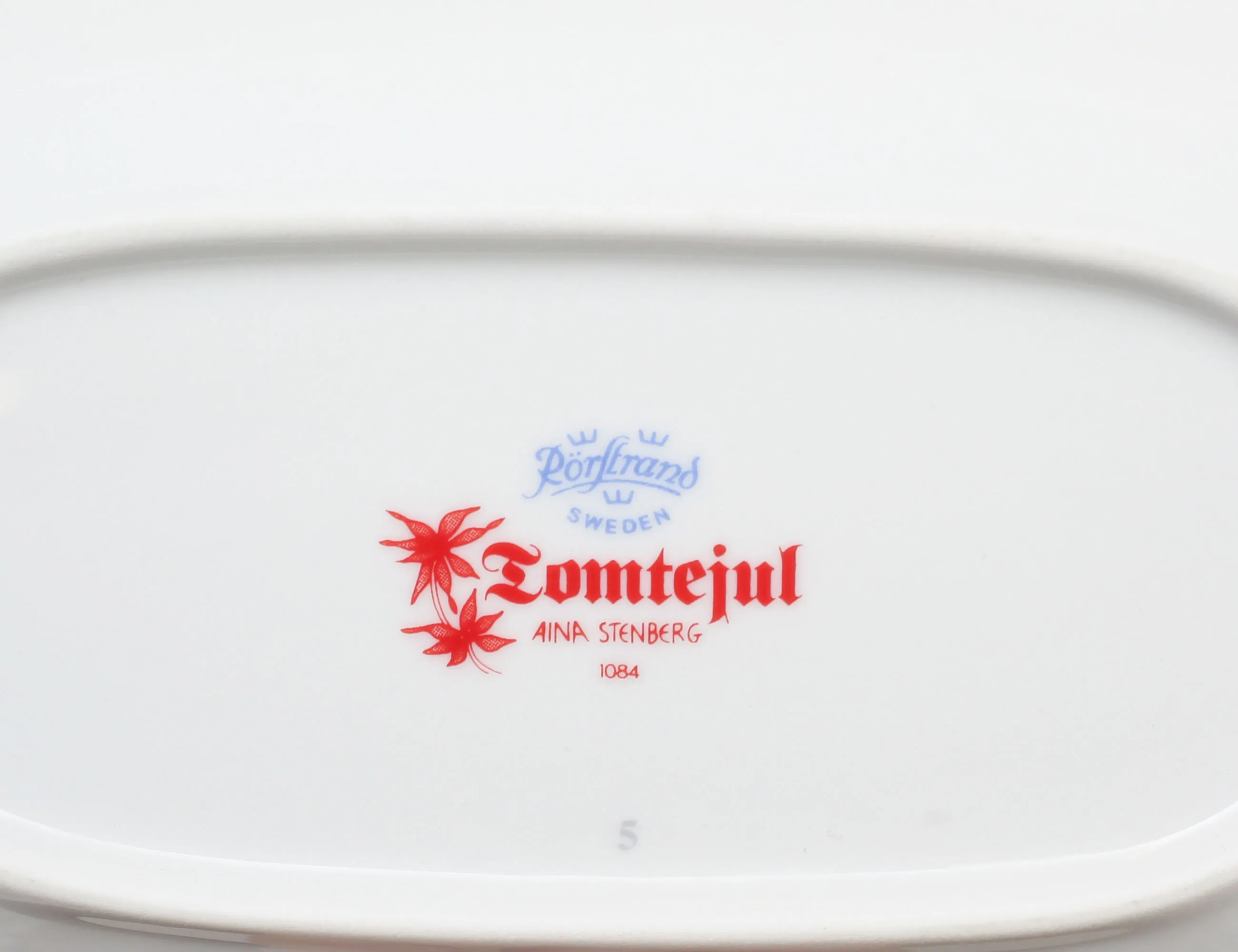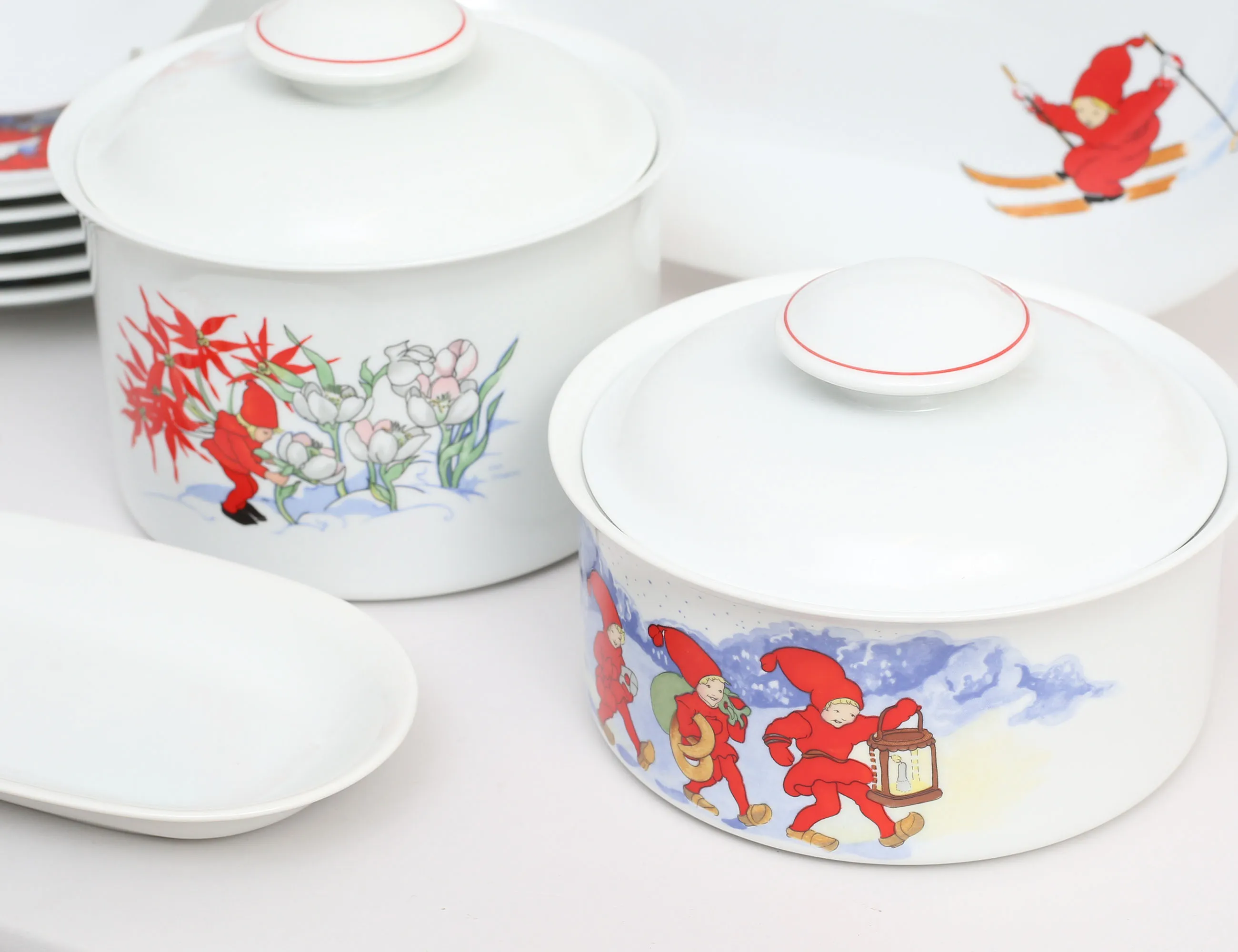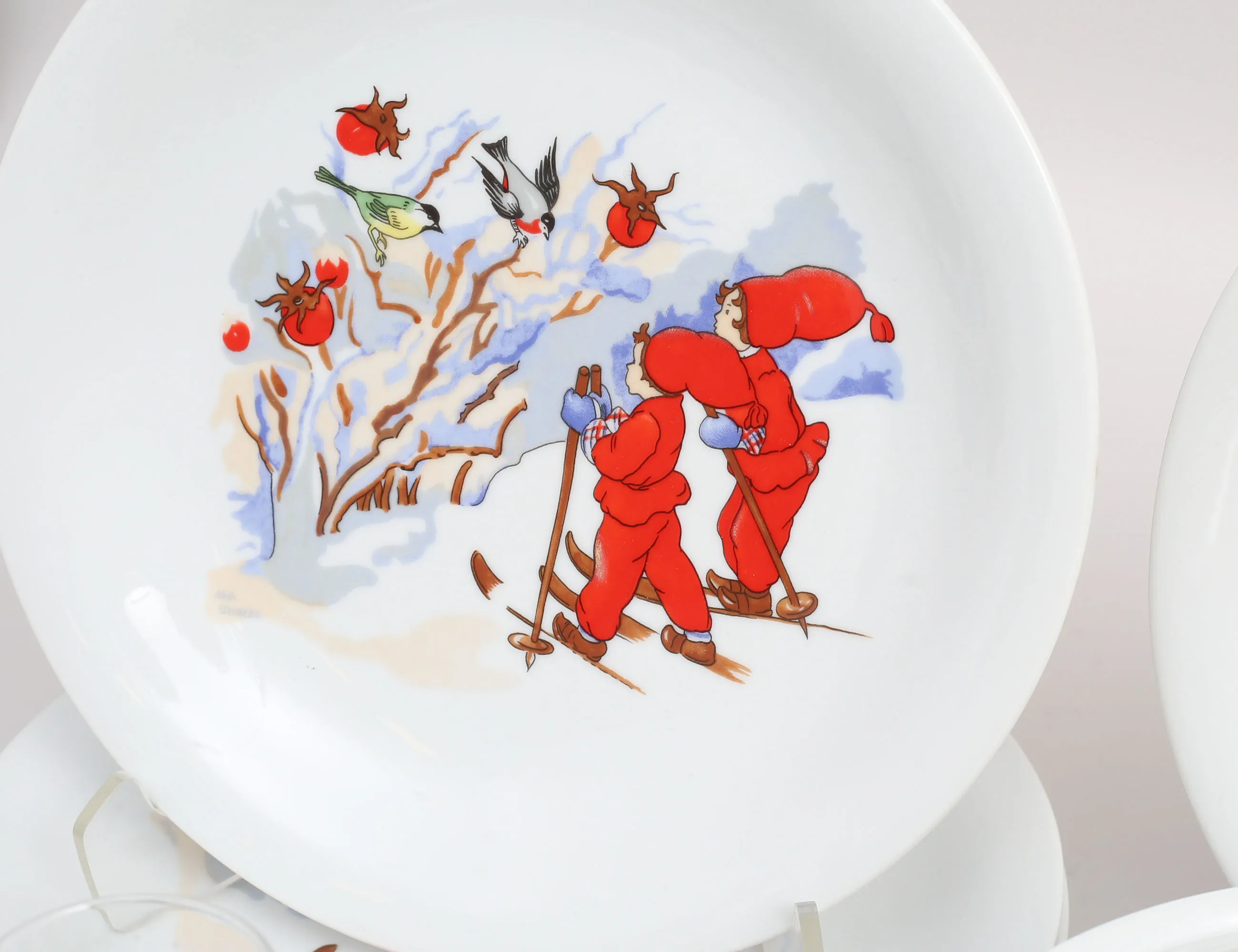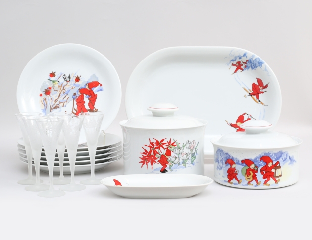 Aina Stenberg Rörstrand, 6 tallrikar, 2 karotter samt 2 uppläggningsfat, diameter 24, 6 snapsglas med juldekor, signerade, höjd 14,5 (16)