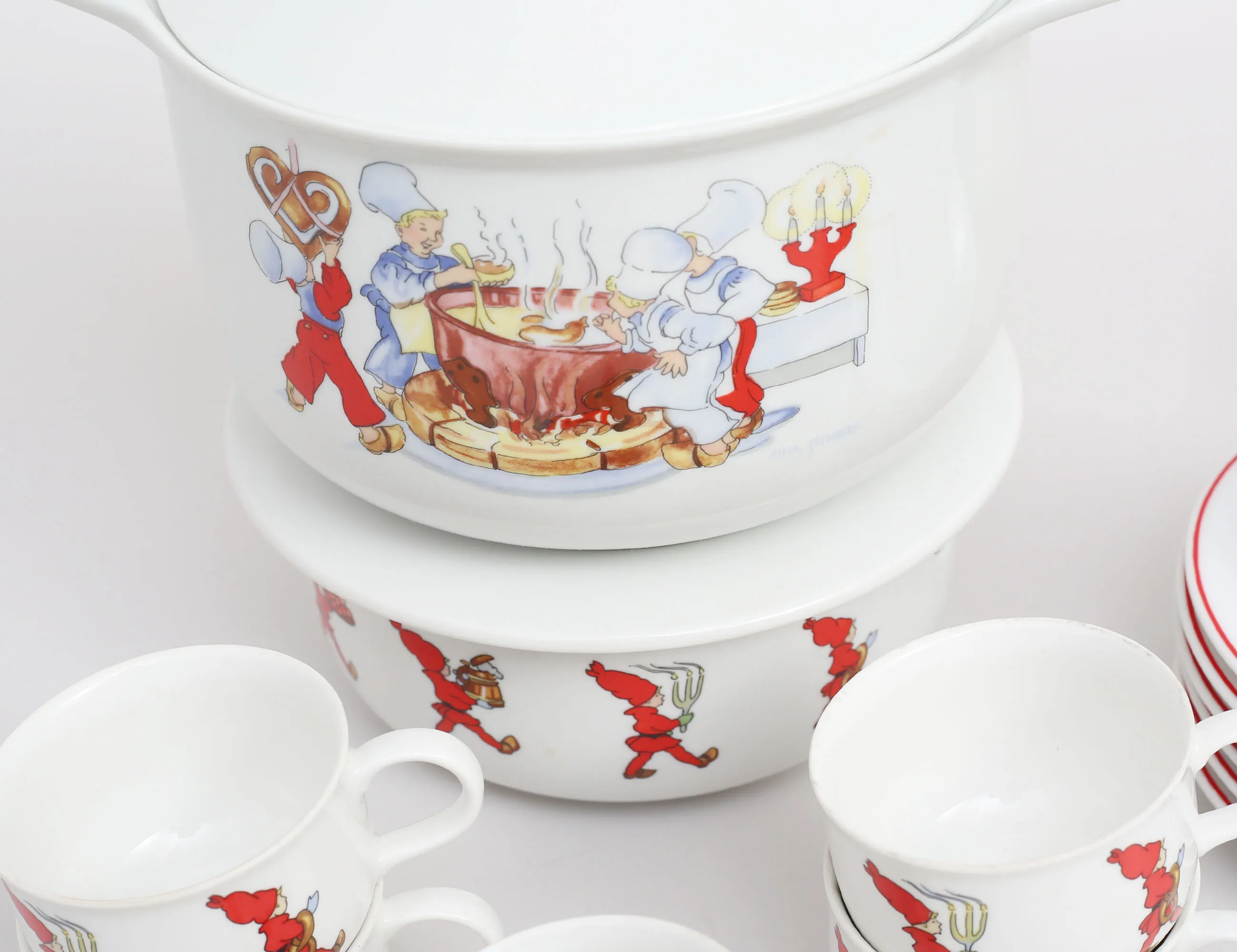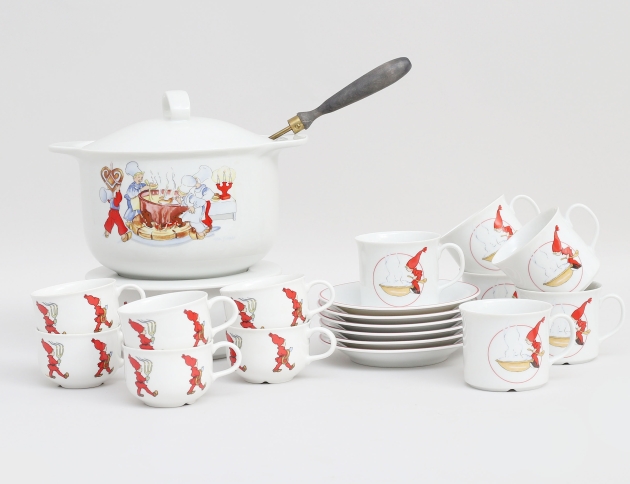 Aina Stenberg Rörstrand, glöggryta med värmeställ och slev, 6 glöggkoppar, 6 kaffekoppar med fat, höjd 4,5/6 (13)