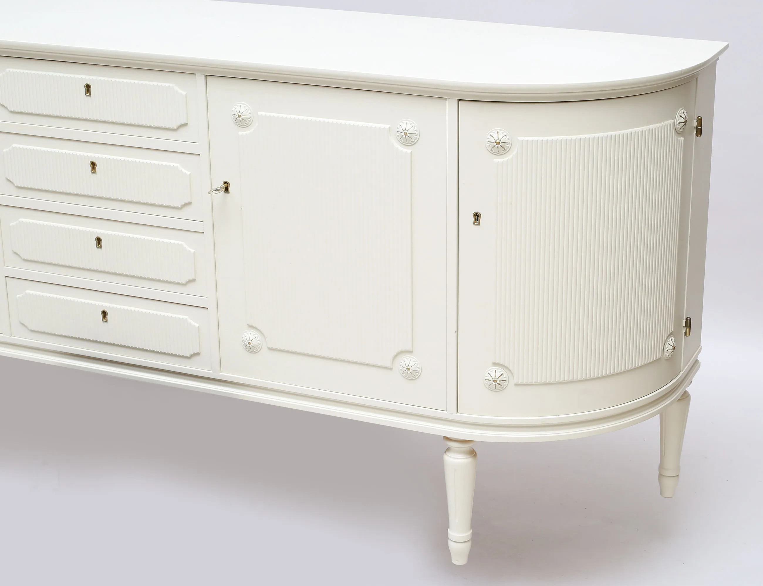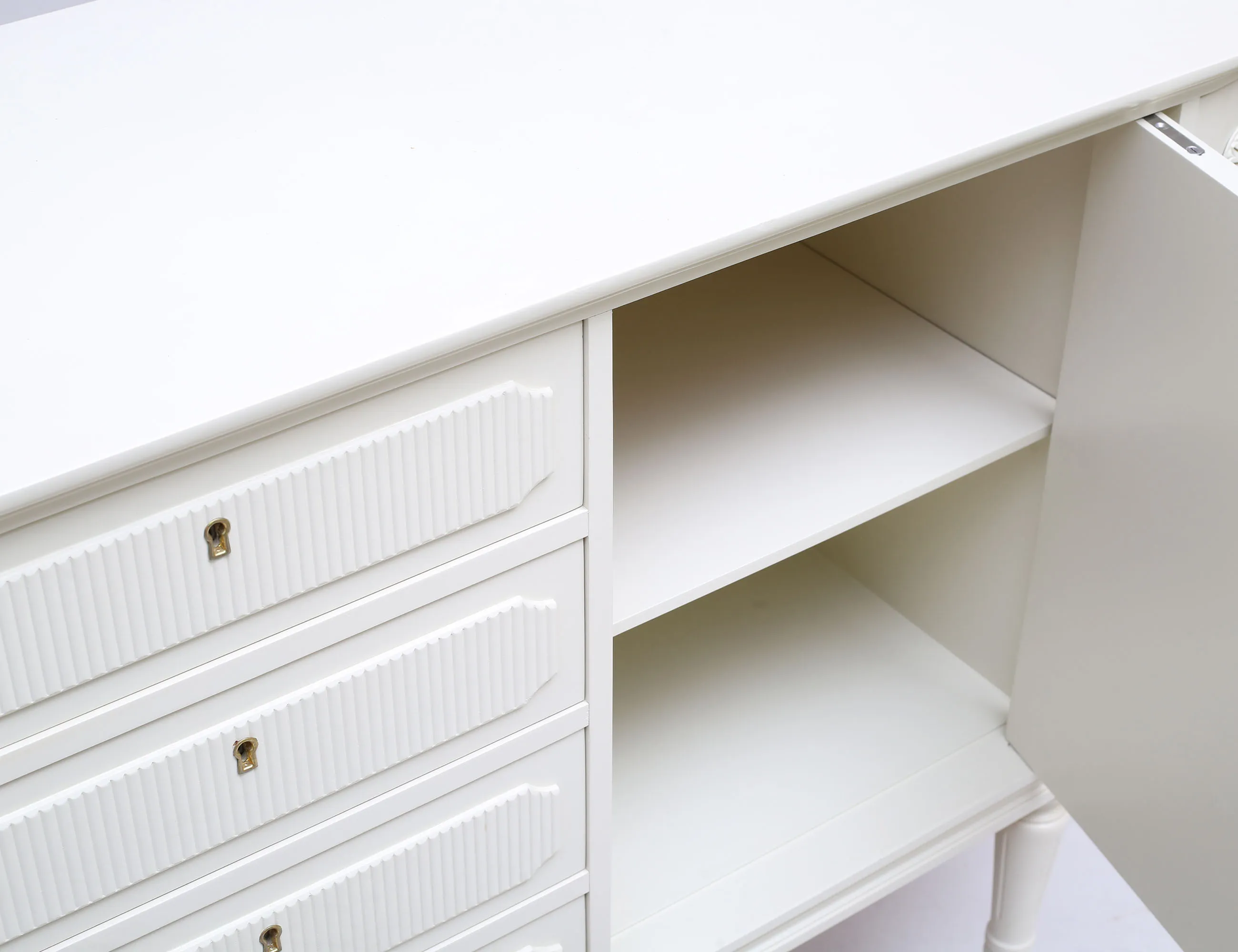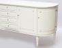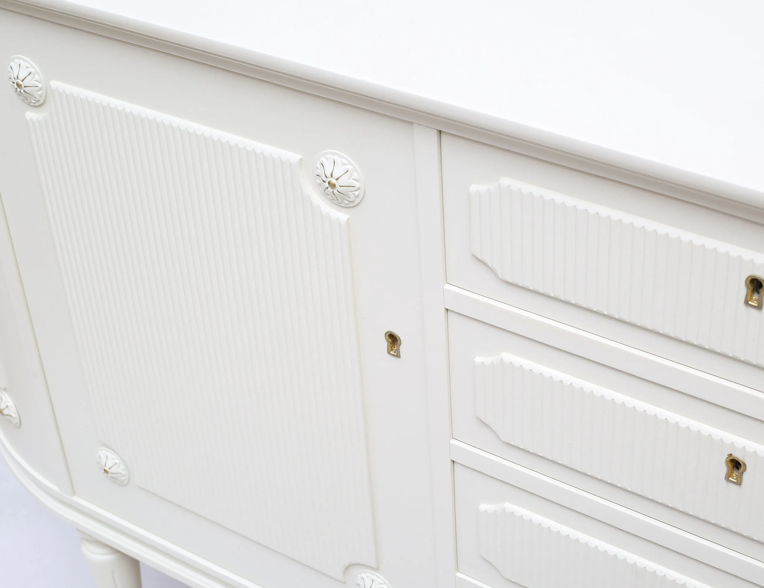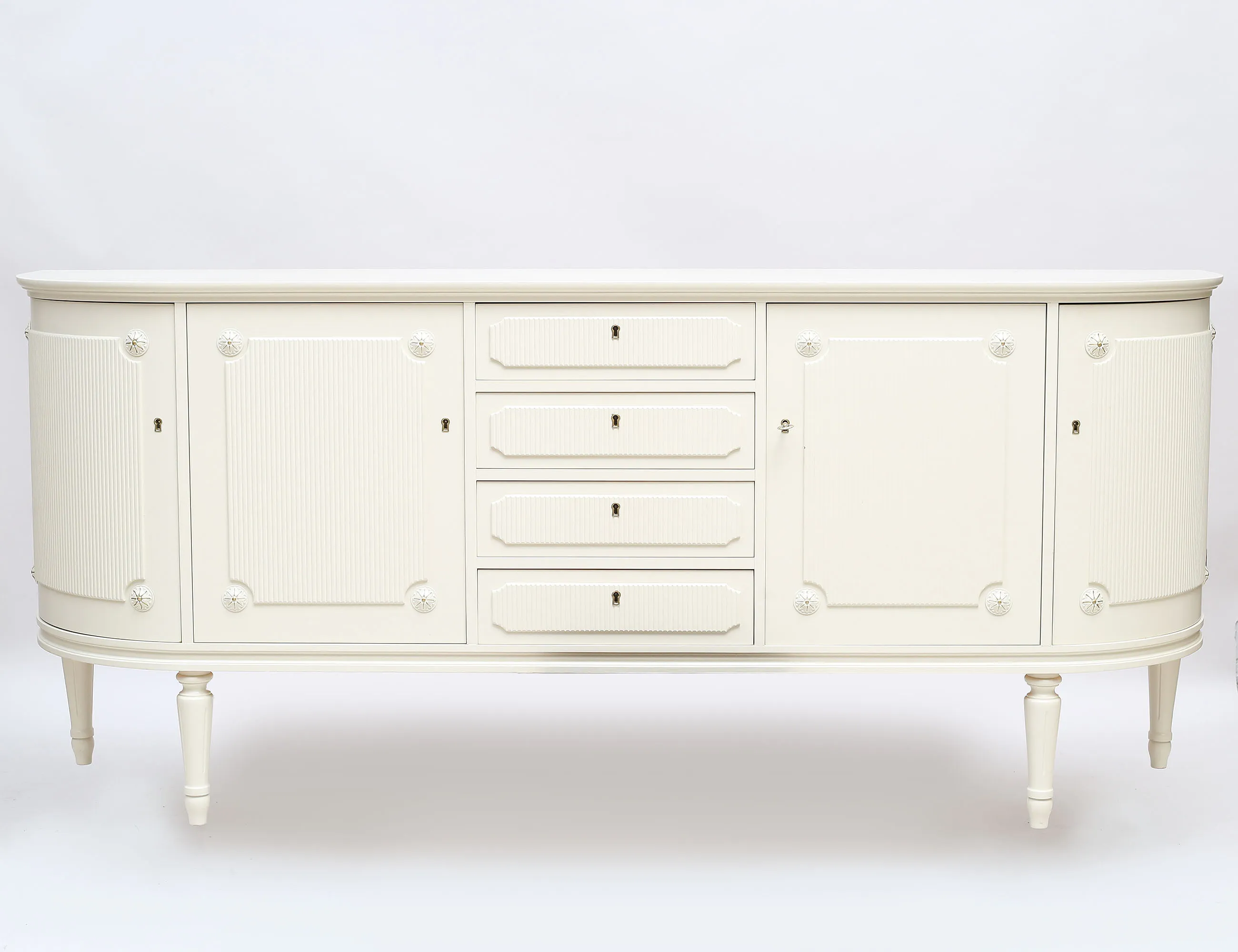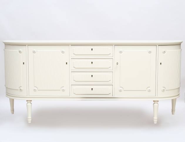 bemålad, mittparti med fyra lådor, vardera sida med två skåpsdörrar, hyllplan, höjd 79, bredd 183, djup 43