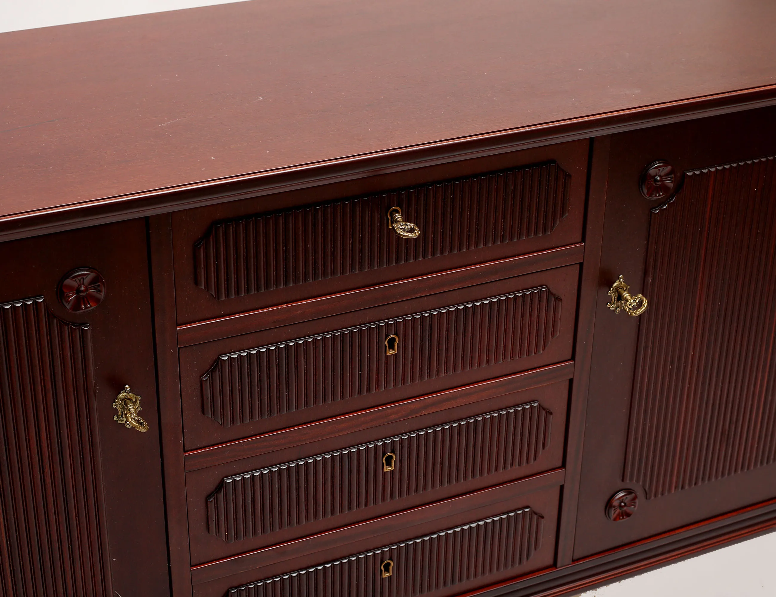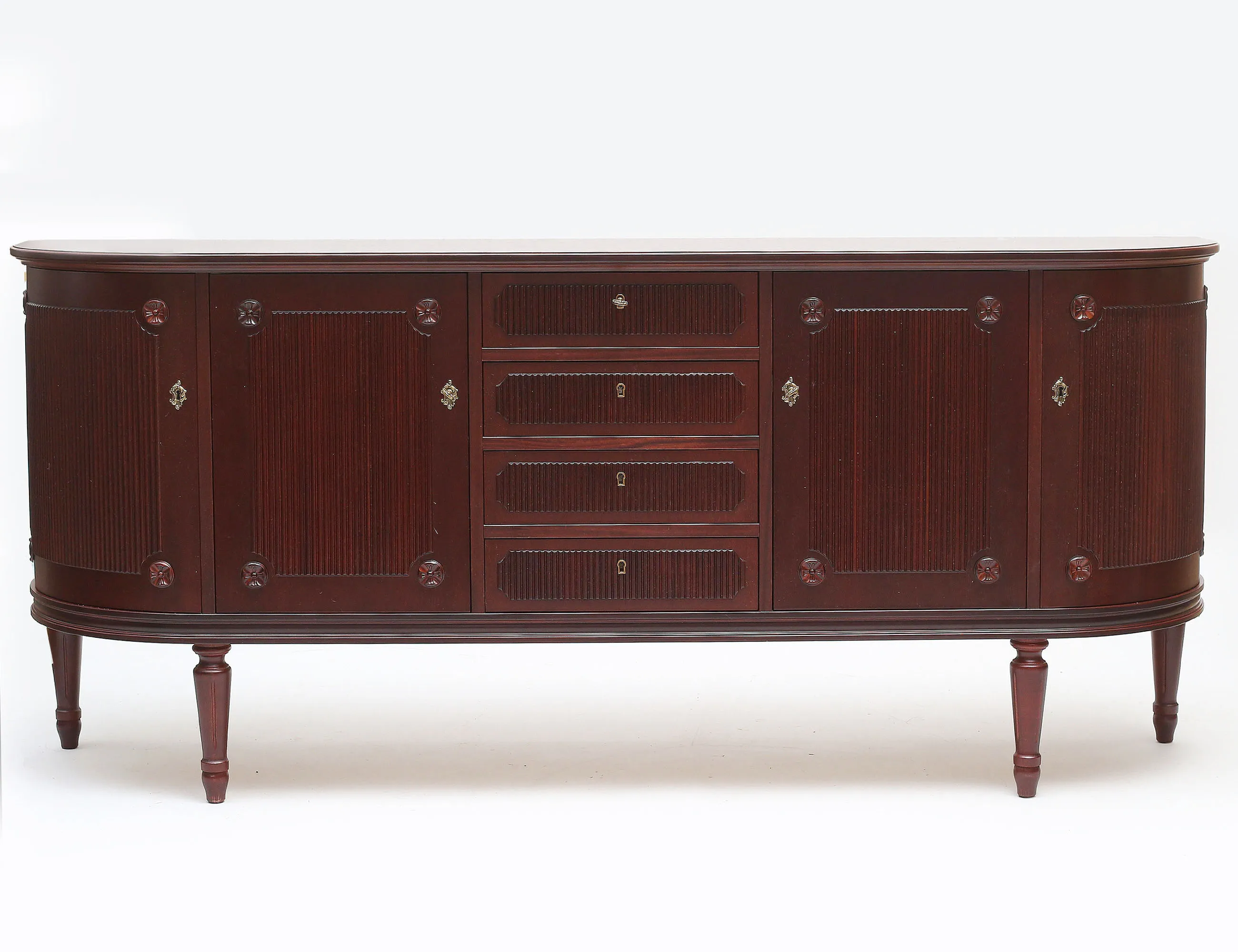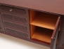 1900-talets andra hälft, mörkbetsat trä, mittparti med fyra lådor, sidopartier med två dörrpar vardera, hyllplan, räfflad dekor, beslag i mässing, höjd 81, bredd 185, djup 42 (retuscher)