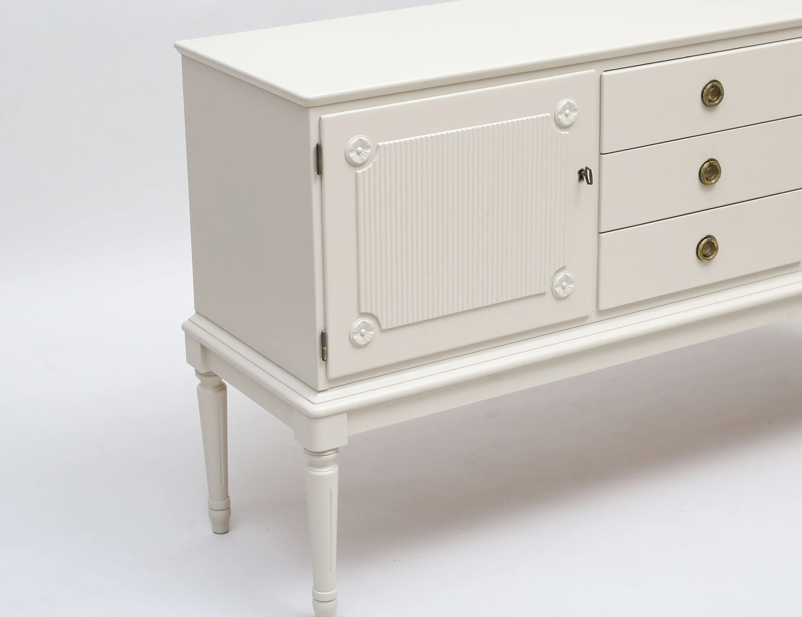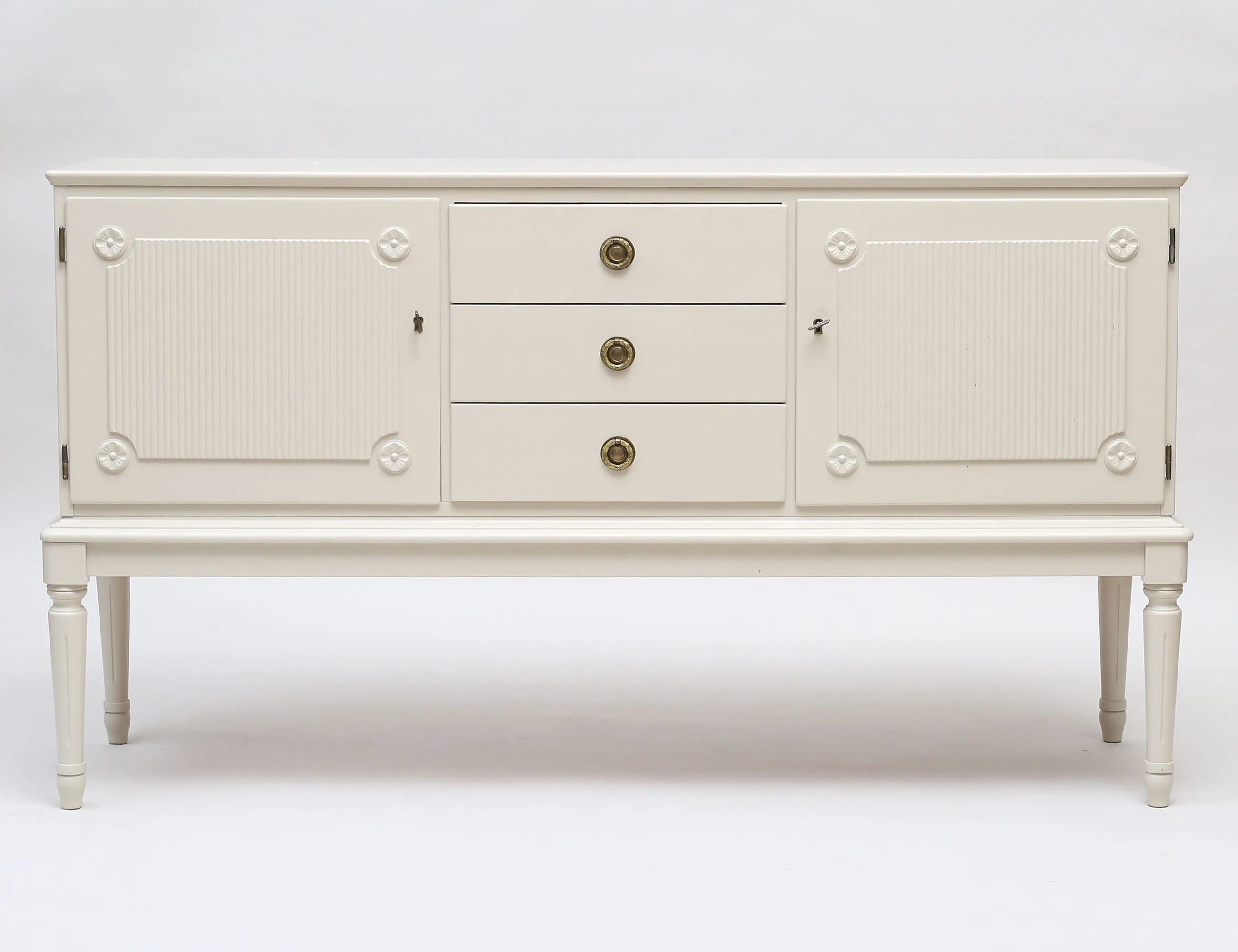 bemålad ,träskuren och räfflad dekor, mittparti med tre lådor, två dörrblad med bakomliggande hyllplan, beslag i mässing, höjd 79, bredd 140, djup 40
