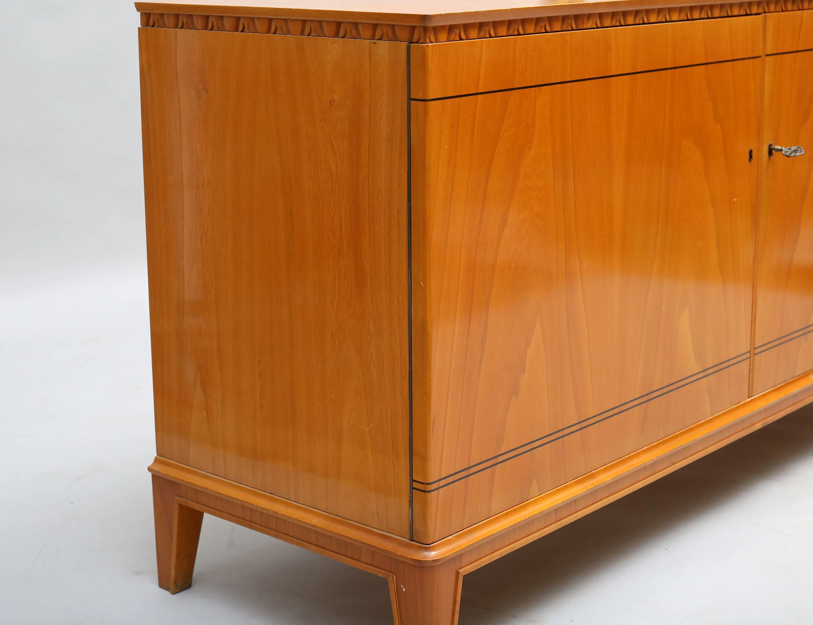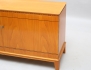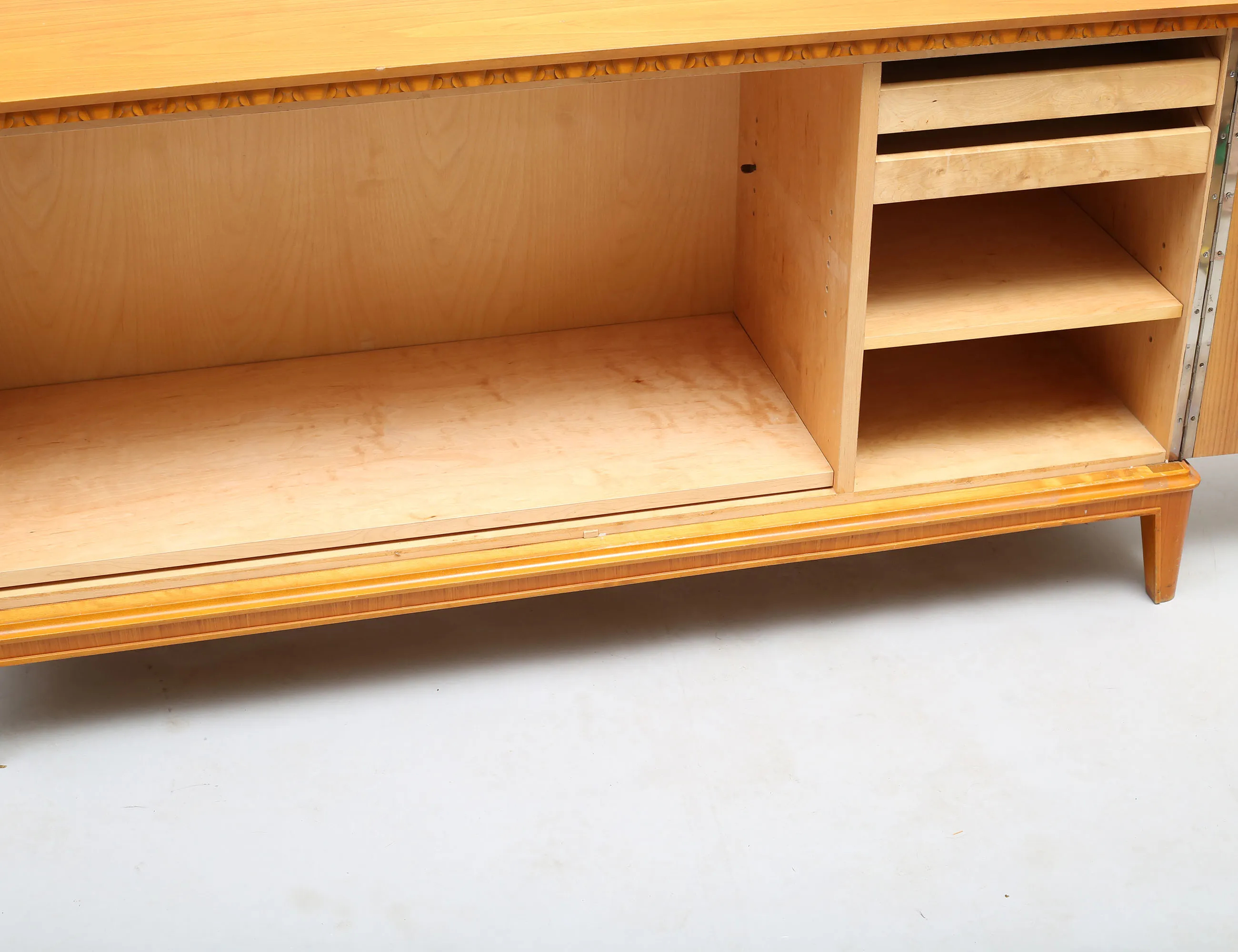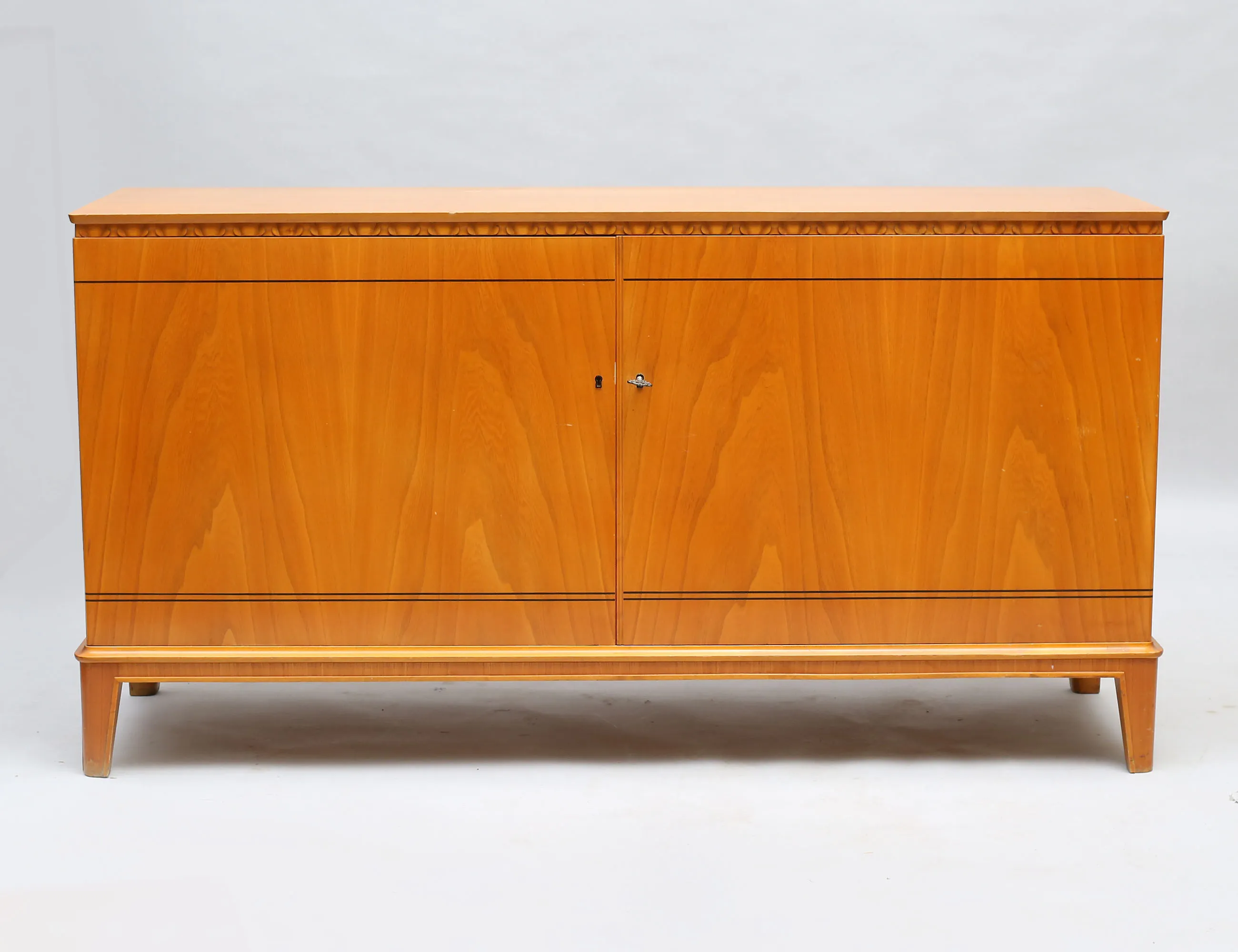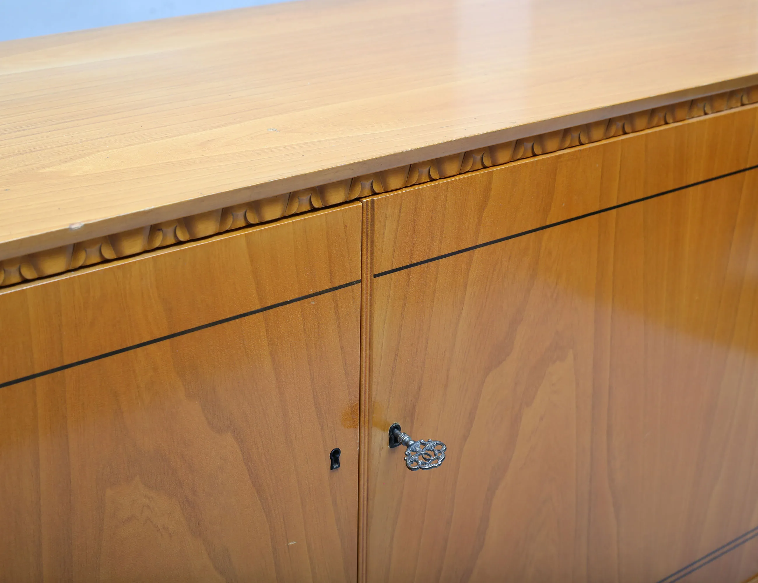 alm med mörk bandintarsia, träskuren dekor, inredning med två lådor och två hyllplan, höjd 74, bredd 141, djup 46 (bruksslitage/stötmärken)
