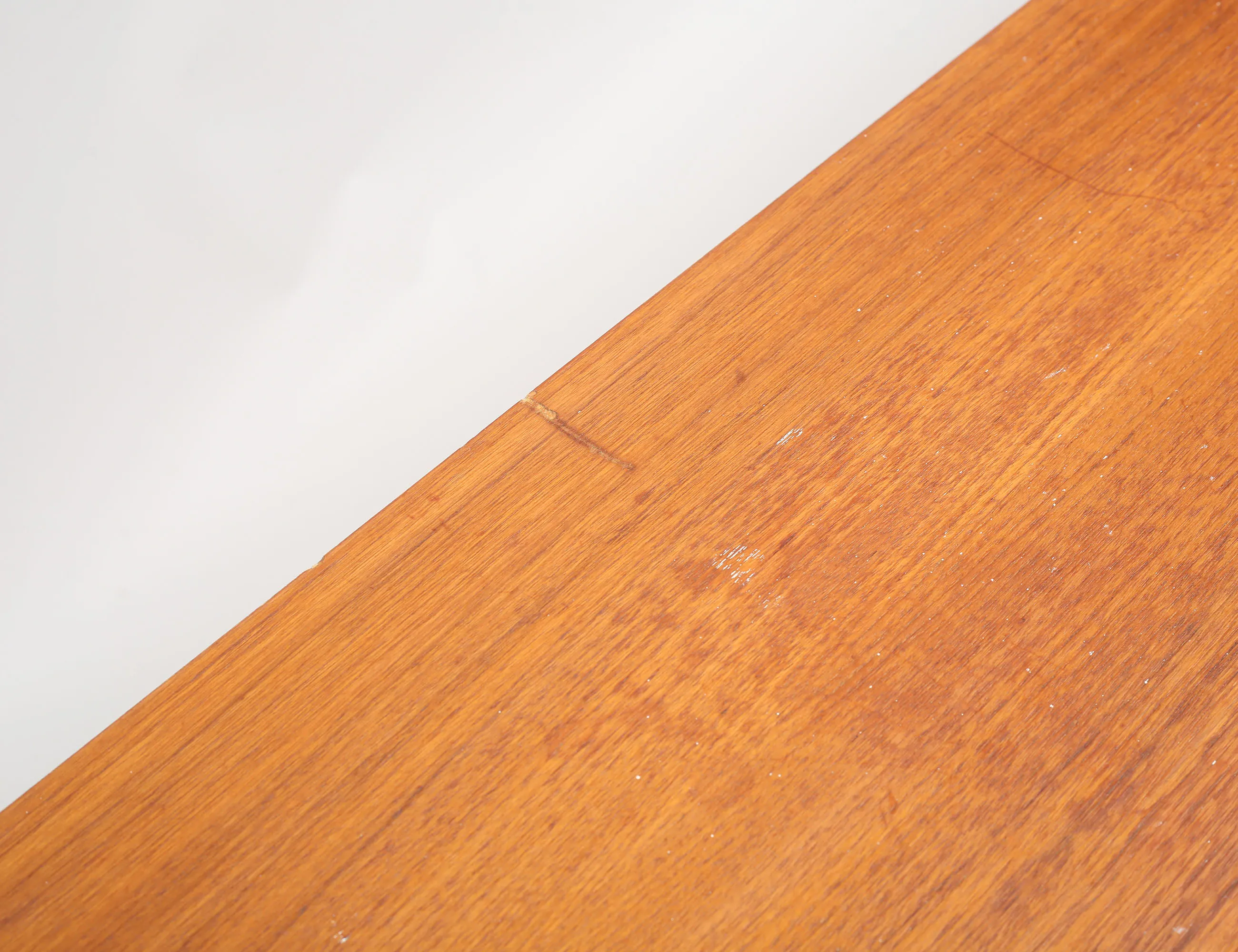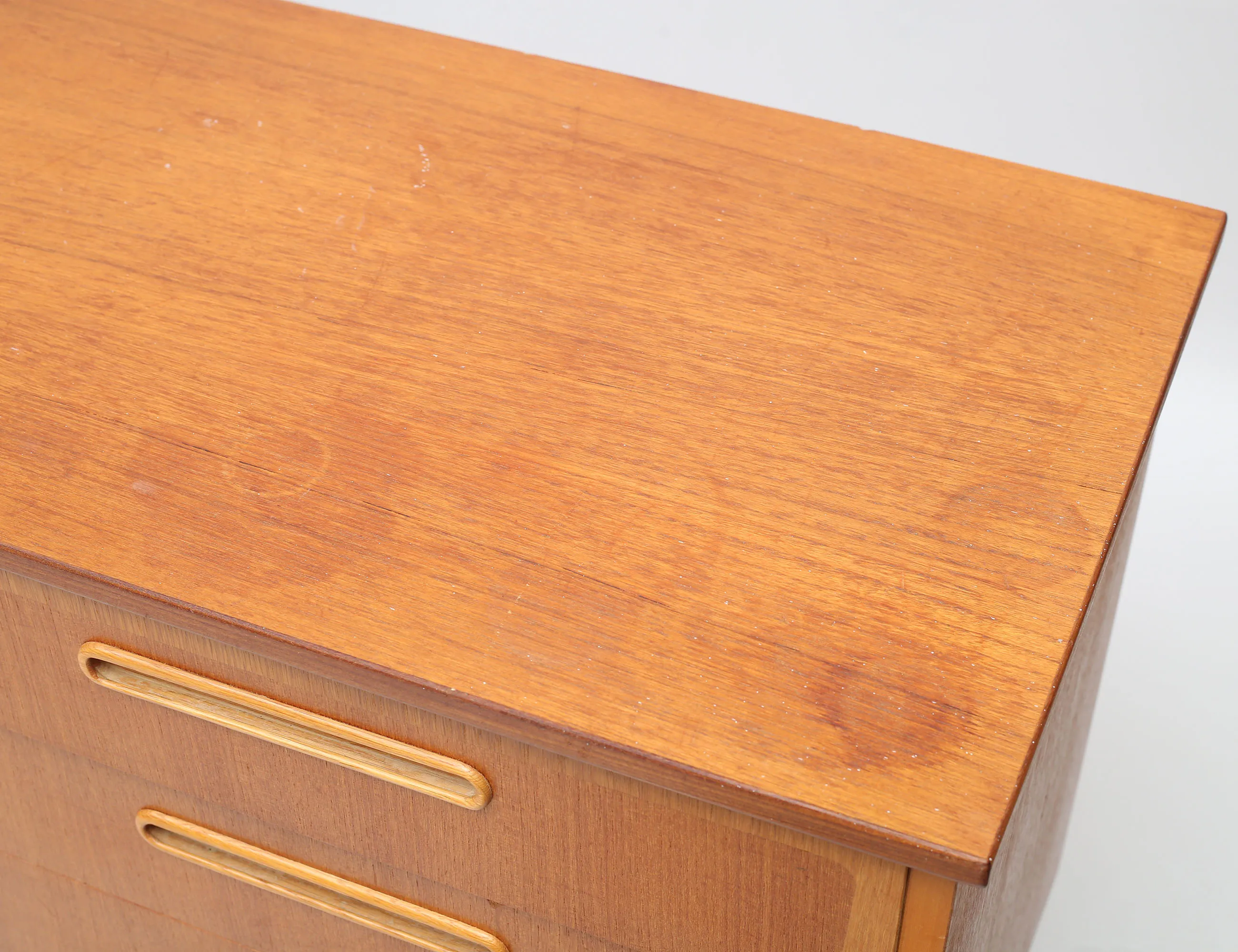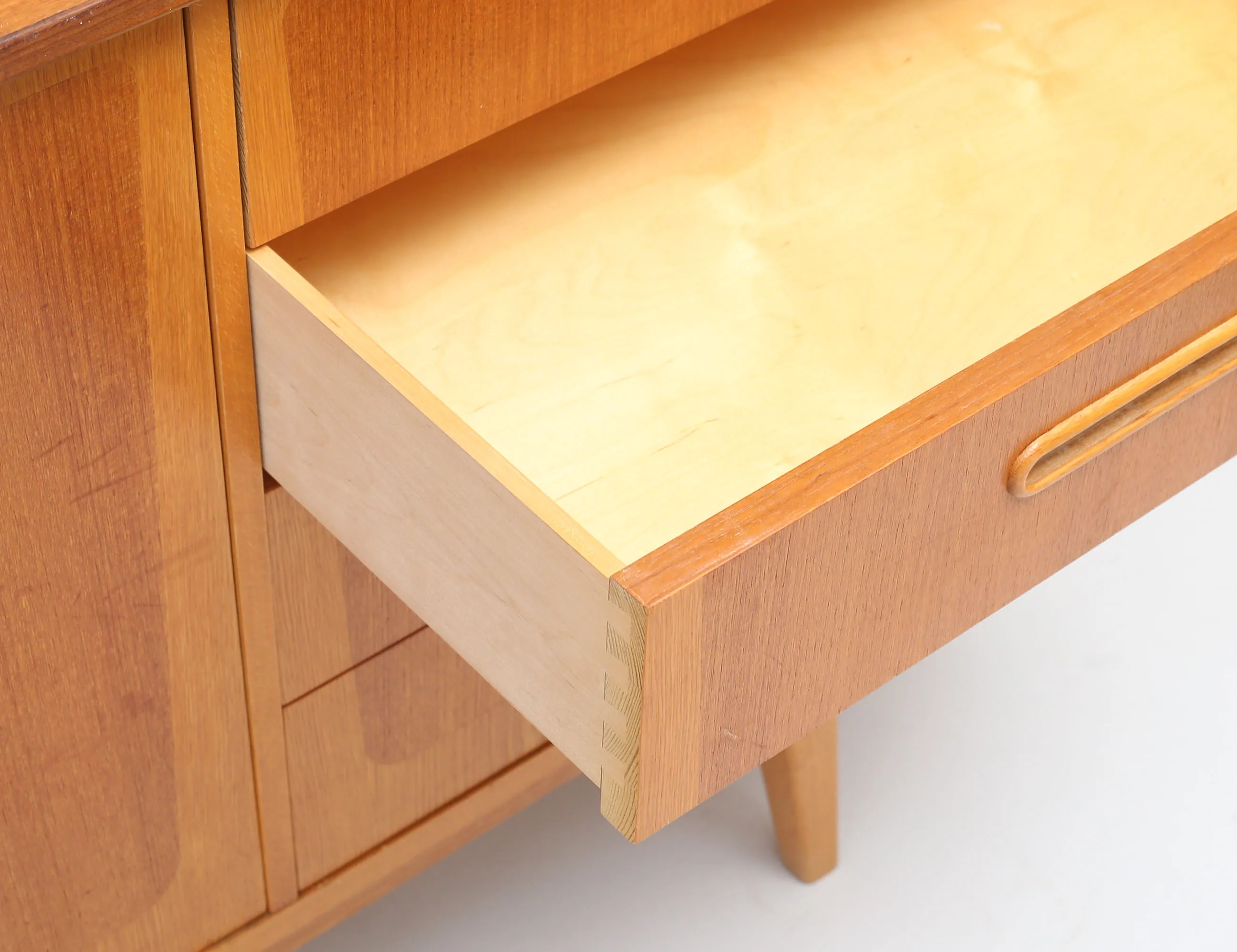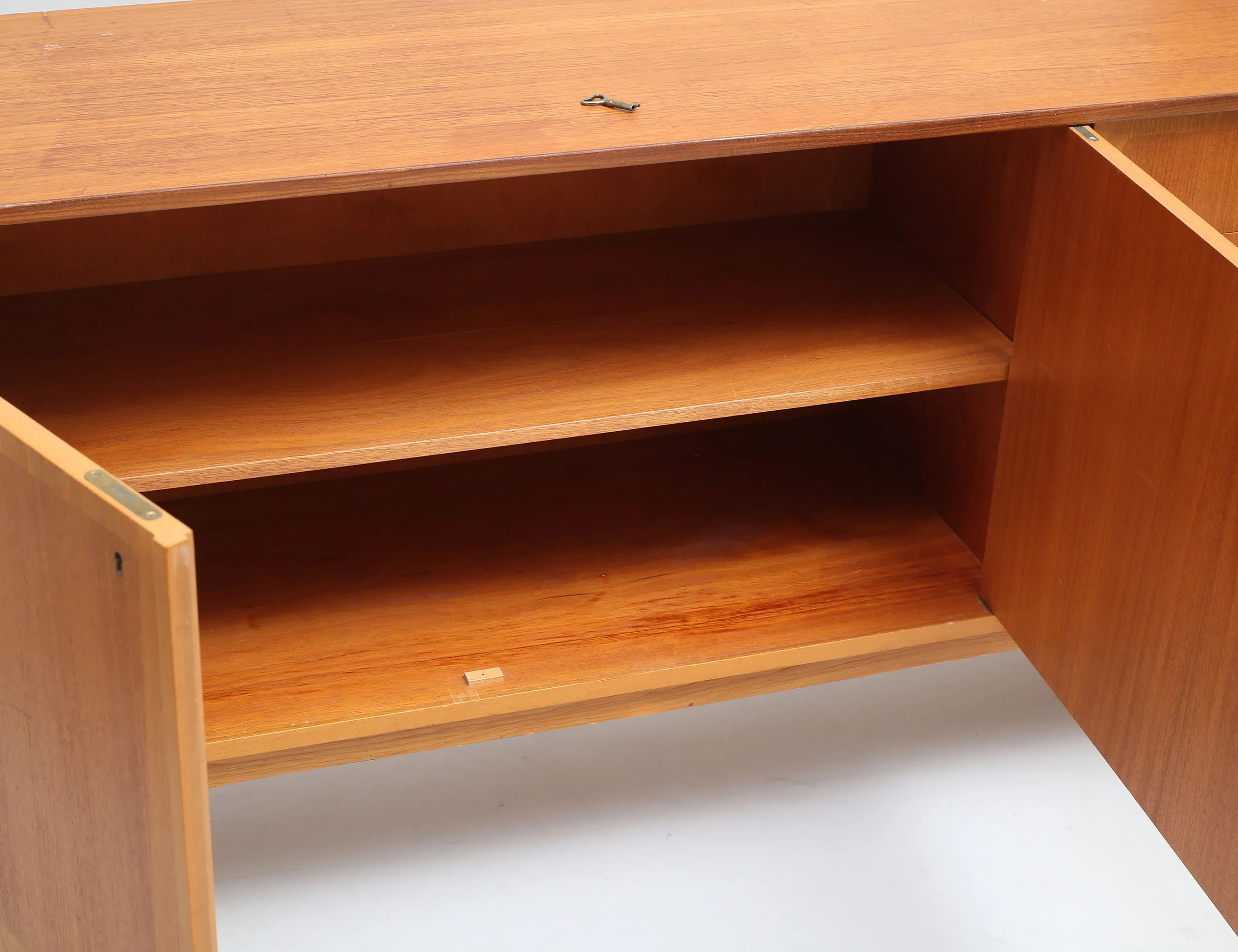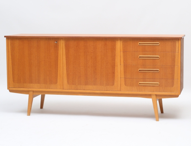 oidentifierad formgivare, teak och ek, fyra lådor, skåpsdörrar med bakomliggande hyllplan, höjd 80, bredd 173, djup 43 (smärre bruksslitage, fläckar/ringmärken på ovansidan)