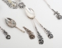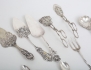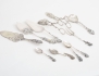 2 kaktänger, 3 tårtspadar, 3+1 kaffeskedar, konfektsked, gaffel, vikt 275 gram (en kaffesked med bräckage)