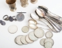 3 bägare, 8+5 kaffeskedar modell svensk spets, Markström Uppsala 1930-tal, mynt/medalj 400-830/1000 m.m., vikt 454 gram