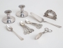 1 par ljusstakar Ceson Göteborg 1976, höjd 6,5, 11 kaffeskedar sterling, motiv svenska slott 1976, kaktång, tårtspade, servettställ, tesked, vikt 317 gram exklusive ljusstakar med fyllda bottnar