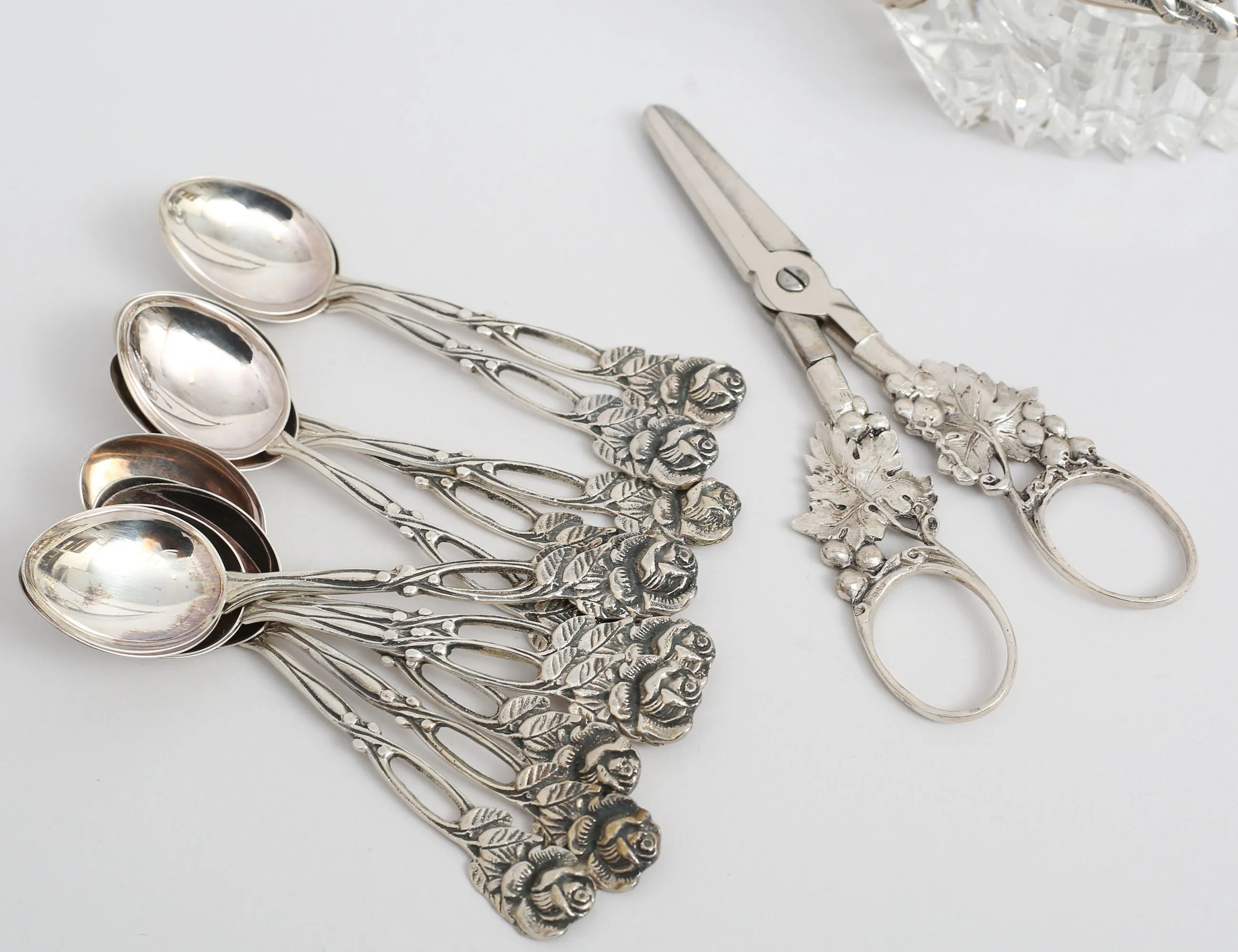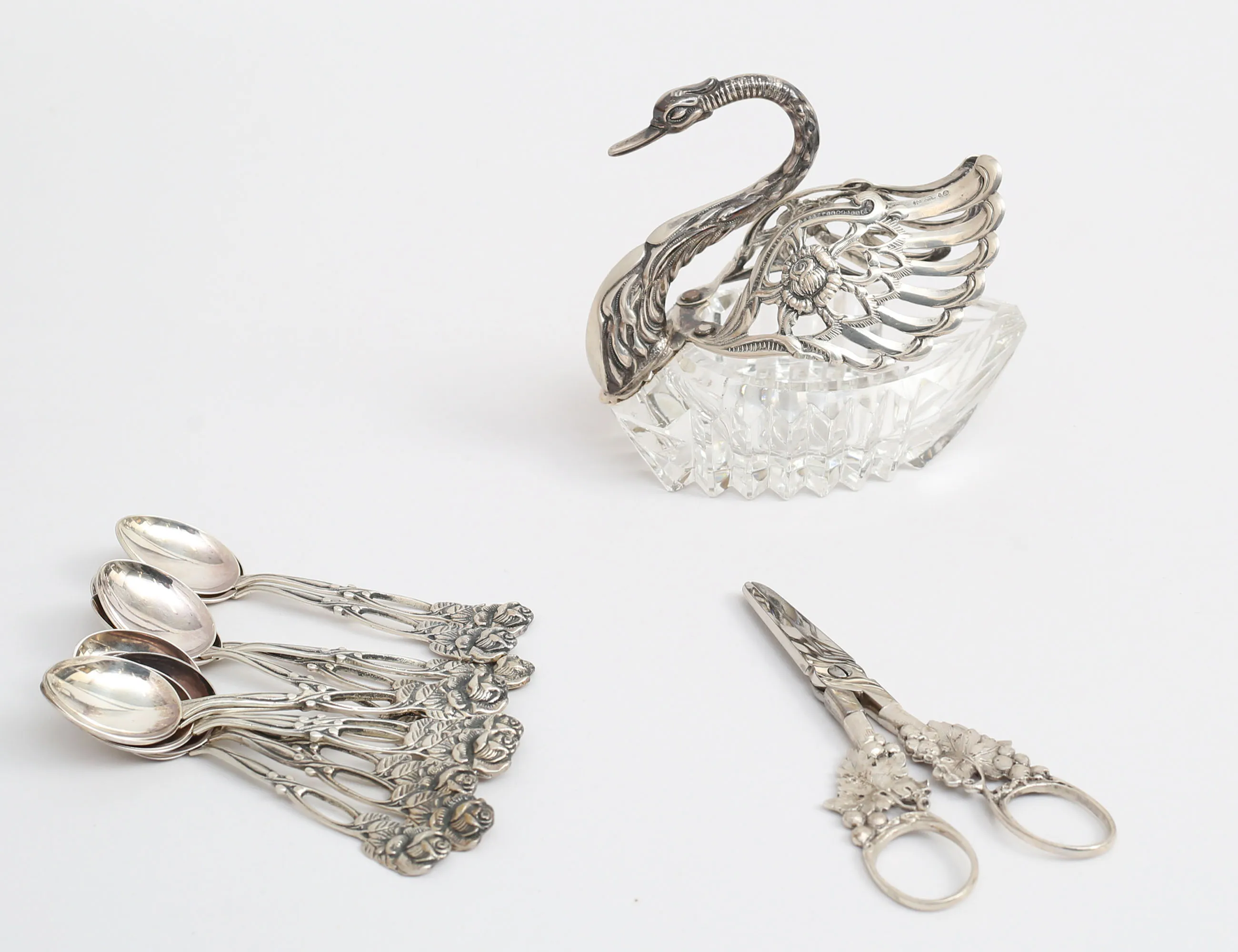 12 kaffeskedar modell Rosen, druvsax, saltkar i form av svan, kristallskål, höjd 10, längd 10, vikt 110 gram exklusive druvsax och saltkar