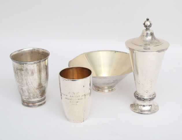 bägare med lock CG Hallberg Stockholm 1931, höjd 22, 2 bägare höjd 10,5/12, skål CG Hallberg Stockholm 1930-tal, vikt 580 gram (inskriptioner, skål med bucklor)