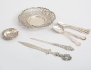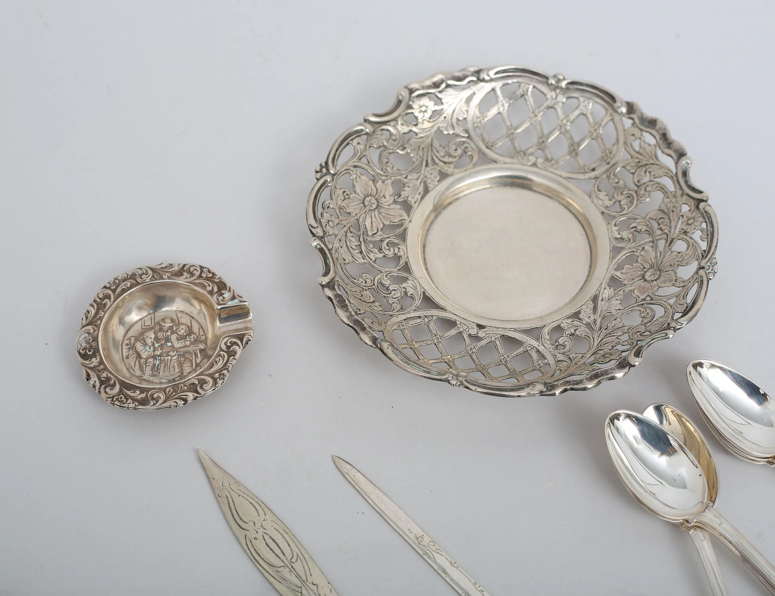 6 kaffeskedar modell Olga, GAB 1989 (ocirkulerade), fat genombruten dekor, Holland, diameter 14, 2 brevknivar , 1 par småfat, vikt 289 gram