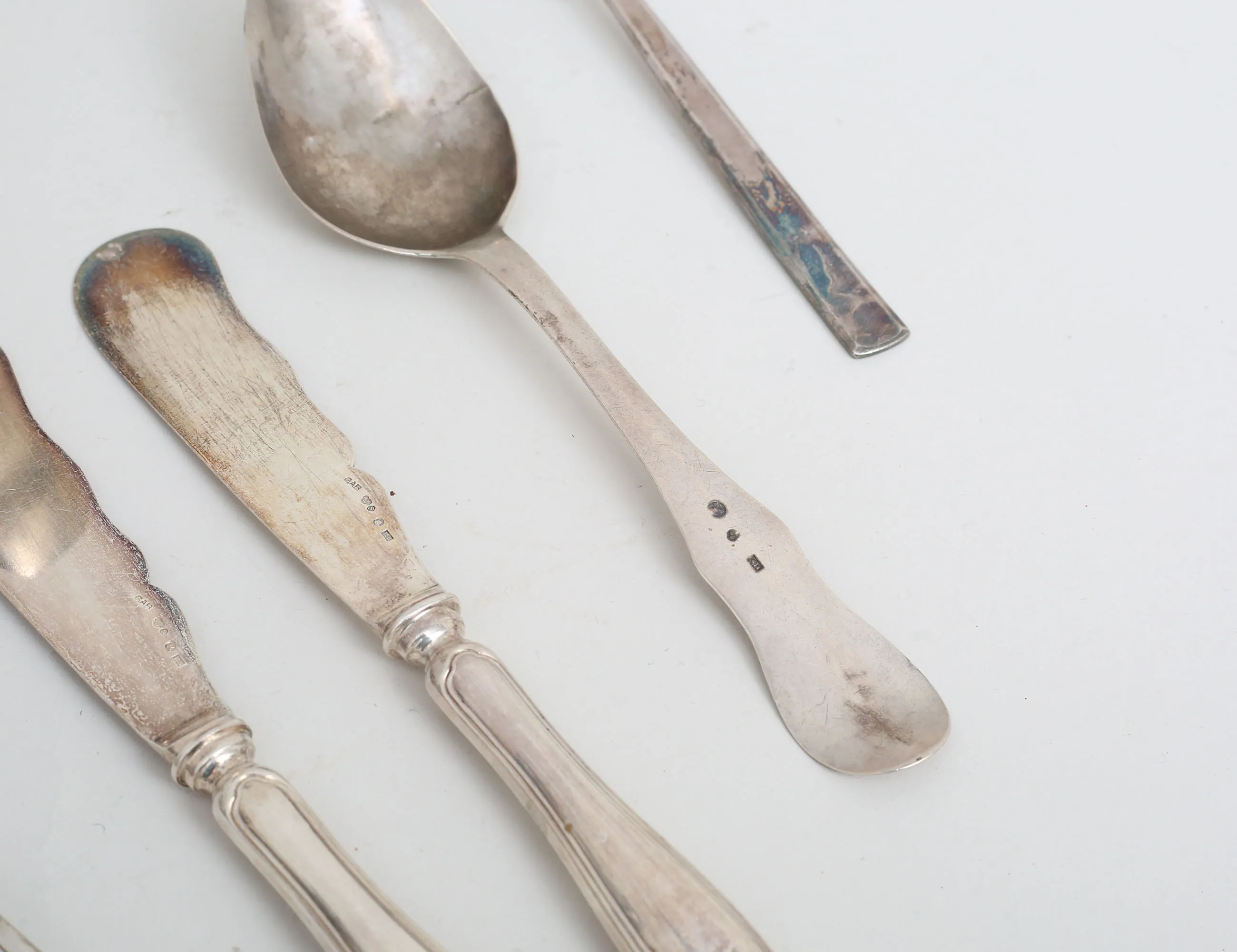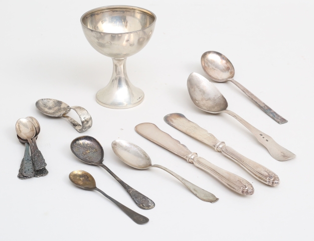 matsked Svante Hultgren Eskilstuna (1821-1841), pokal höjd 10, 6 kaffeskedar Norge, sked Ryssland, medicinsked, 3 skedar, smörknivar 1 par modell Vasa, vikt 384 gram