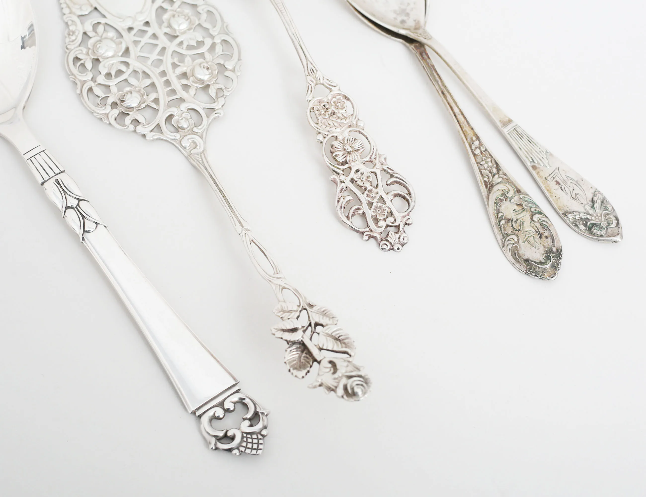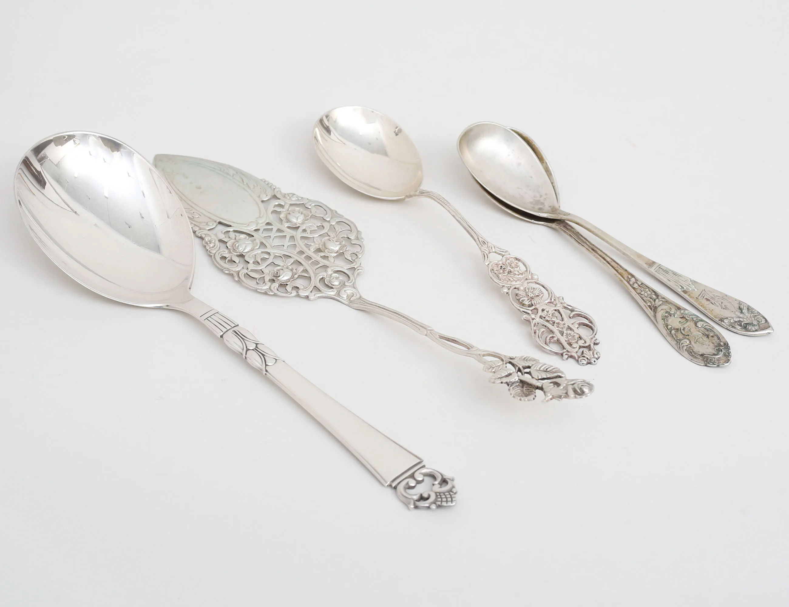 tårtspade "Rosen", kompottsked PF Köpenhamn 1955, längd 22, sked Danmark 1933, sked Gewe Malmö 1955, sked Ryssland längd 14,5, vikt 203 gram