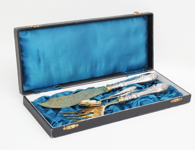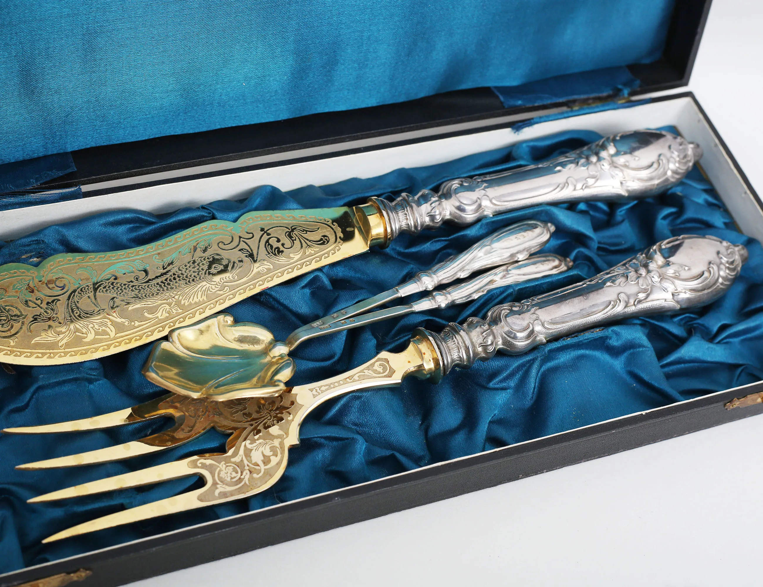 1 par trancherbestick rokokostil, handtag i silver, tenar och knivblad i förgylld metall, 1 par konfektskedar, N.L. Dahlström Örebro 1870, vikt 28 gram exklusive trancherbestick