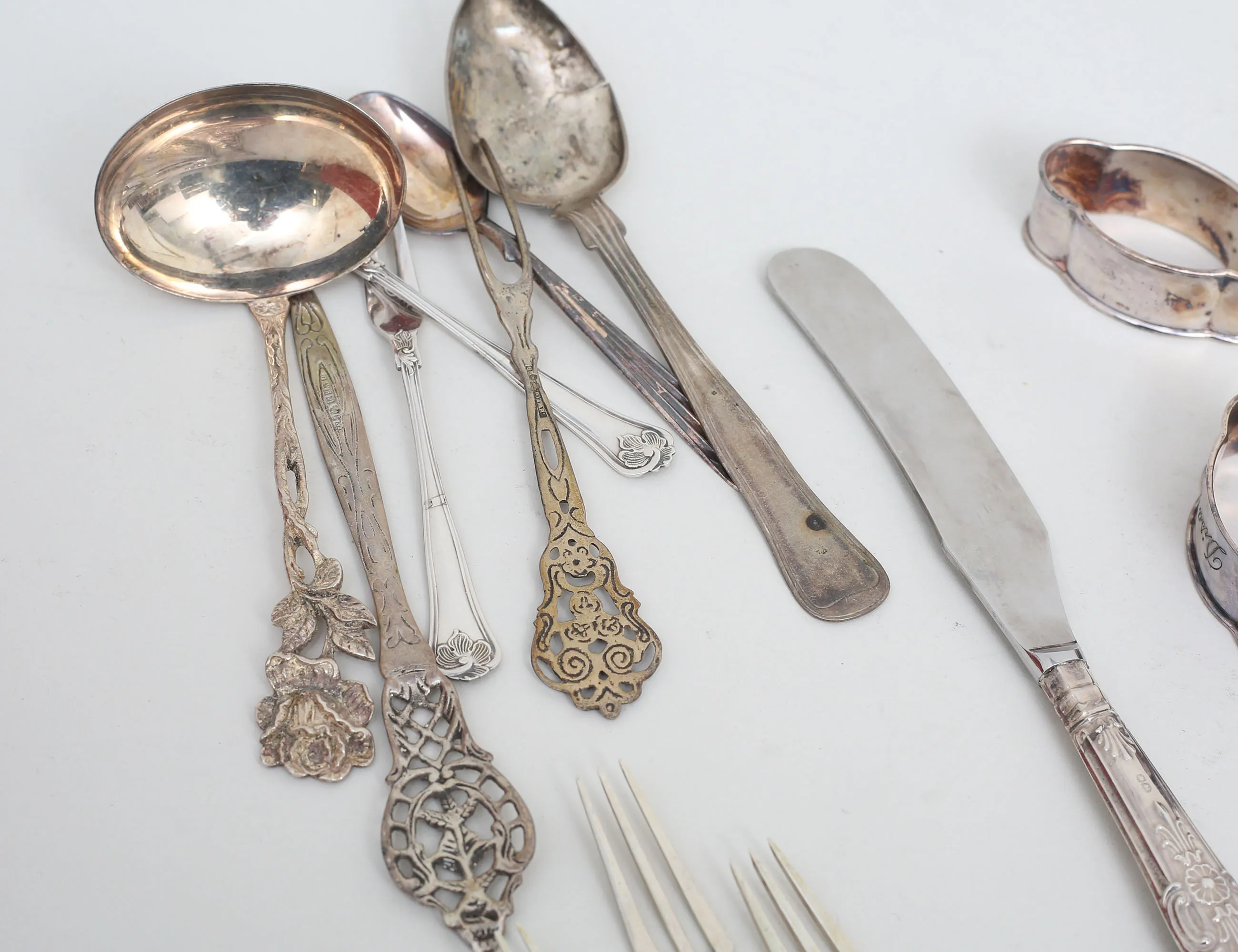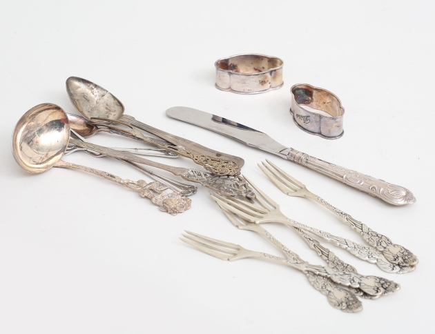 såsslev modell Rosen, 1 par servettringar, 2 små gafflar, modell Sachsisk, brevkniv, 5 smörgåsgafflar 800/1000, kaffesked, liten gaffel, sked Danmark (skador), kniv London England , vikt 238 gram exklusive kniv