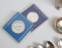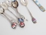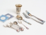 sked med emalj "Oslo", sterling, Norge, 1 par bordsgafflar modell gammaldansk, Cohr, 8 kaffeskedar , bägare, 2 mynt 100kr respektive 200kr, vikt 260 gram
