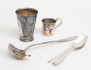 bägare 1940-tal, höjd 12, dopmugg höjd 7,5, 3 matskedar modell svensk spets, soppslev längd 33, ring, vikt 567 gram (inskriptioner)