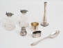 glaskannor 1 par för olja/vinäger, lock - England Birmingham 1920, höjd 11, dessertsked modell gammalfransk, 1800-tal, bägare, vas, servettring, och ströare, vikt 91 gram exklusive ströare, vas och kannor