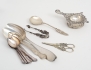 matskedar 2 stycken, Johan H Sjöman Vimmerby (1818-1829), 6 kaffeskedar modell Chippendale, GAB Stockholm 1959, tesked modell Olga 1874, tesil, druvsax, sockertång, 2 skedar, vikt 340 gram