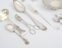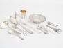 matsked Isak Gustaf Sundström Söderköping 1862, matgaffel modell Disa, skålfat genombruten dekor, 3 skedar, sockertång, kaktång modell Rosen, bägare (inskription) höjd 6, 4 kaffeskedar empir 1800-tal, såsslev m.m., vikt 504 gram exklusive druvsax