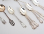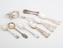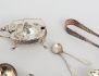 8 kaffeskedar modell Olga 1952, saltkar Birmingham England, blå glasinsats, saltkar 1 par England, sockertång, 2 kaffeskedar 1800.tal, sked Norge, miniatyrtång, vikt 232 gram exklusive glasinsats