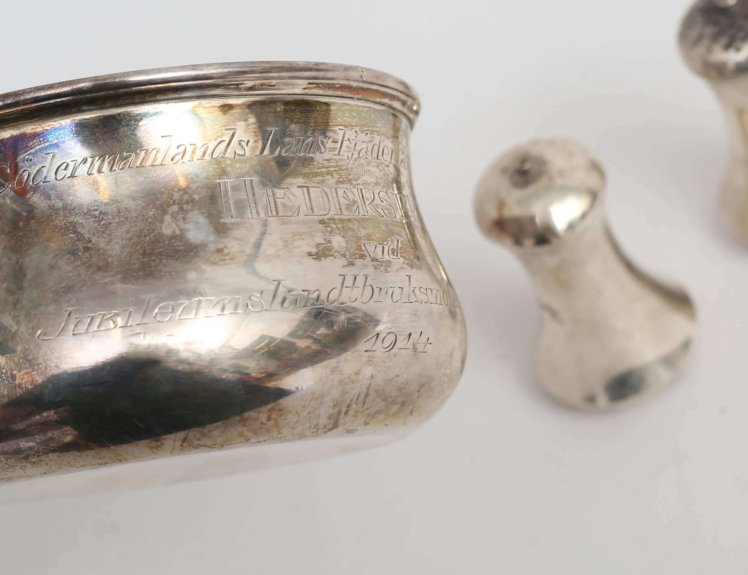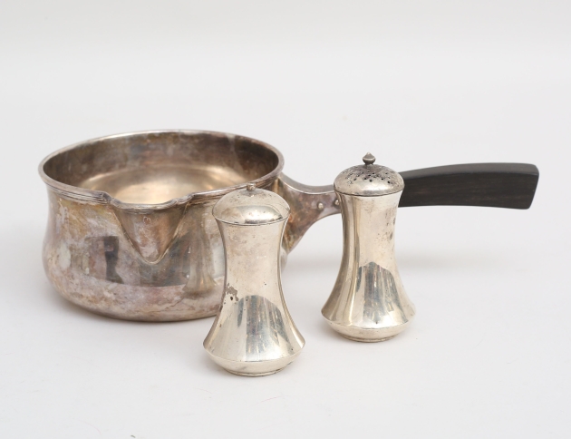 ströare 1 par, London England 1909, höjd 8, såskanna med trähandtag, Stockholm 1914, längd 23 (inskription), vikt 294 gram inklusive såskanna med trähandtag (3)