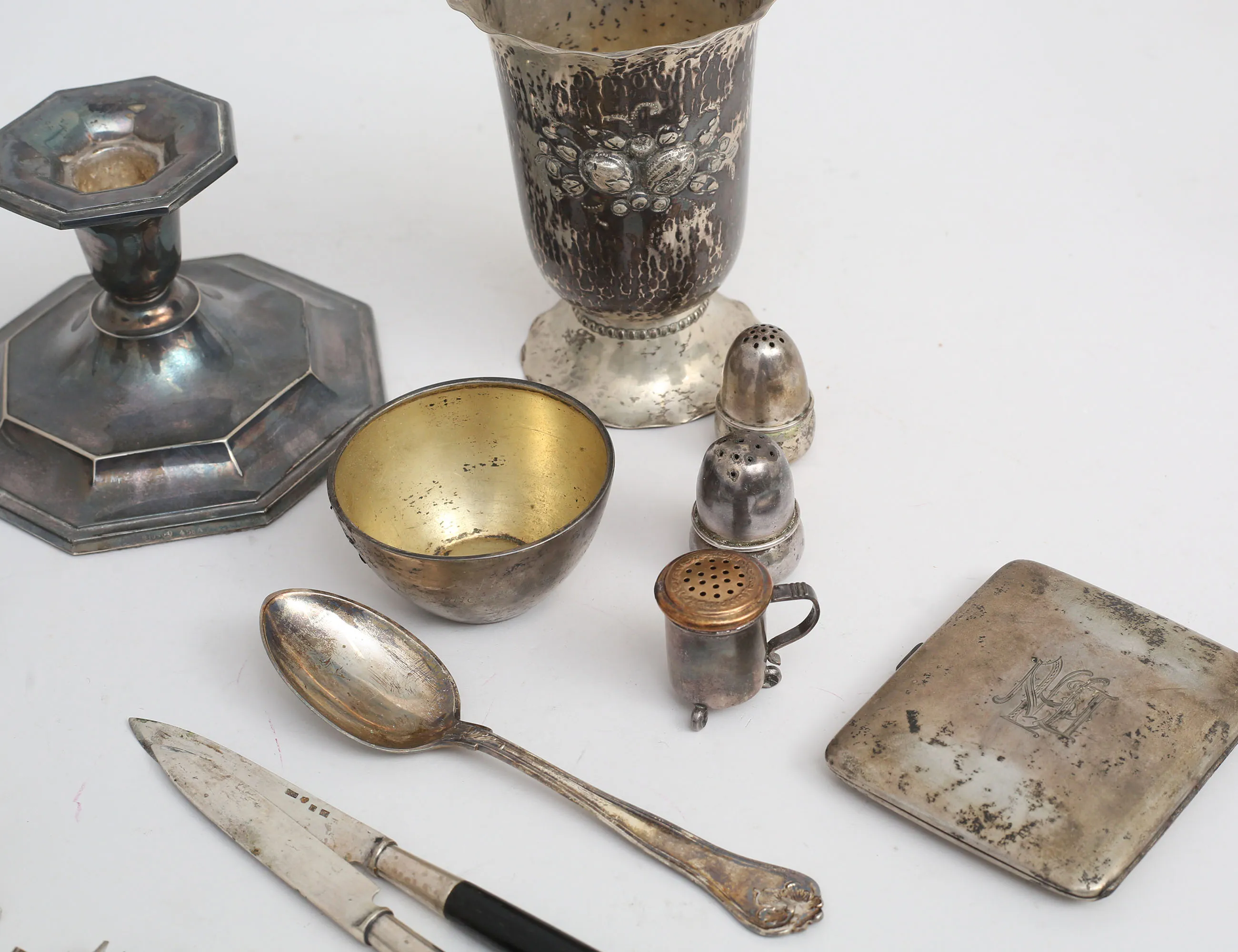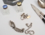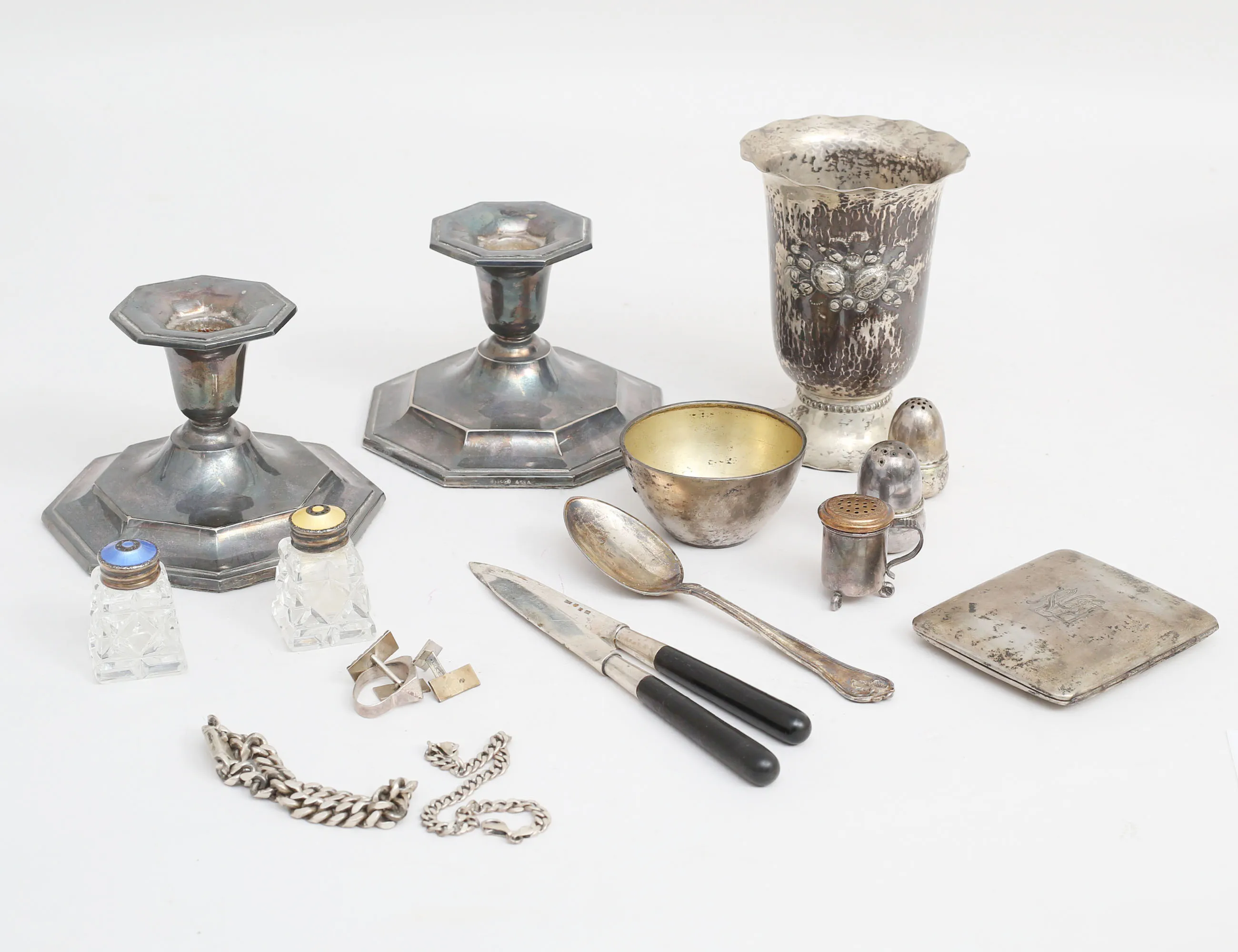 1 par ljusstakar höjd 9, bägare höjd 12, etui, dessertsked modell Sachsisk, 1 par fruktknivar med träskaft, 1 par ströare kristall och emalj/sterling, 2+1 ströare, 2 armband Bismarck sterling, skål, manschettknappar, ring, vikt 362 gram exklusive ljusstakar och knivar (fyllda bottnar)