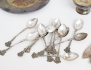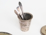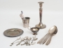 6 matskedar modell gammal spets, 2 bägare, 12 kaffeskedar, 2+1+1 kaffeskedar, punchmuggar, fat, ljusstake Befa Göteborg 1968, inskription, höjd 19,5, vikt 738 gram exklusive ljusstake