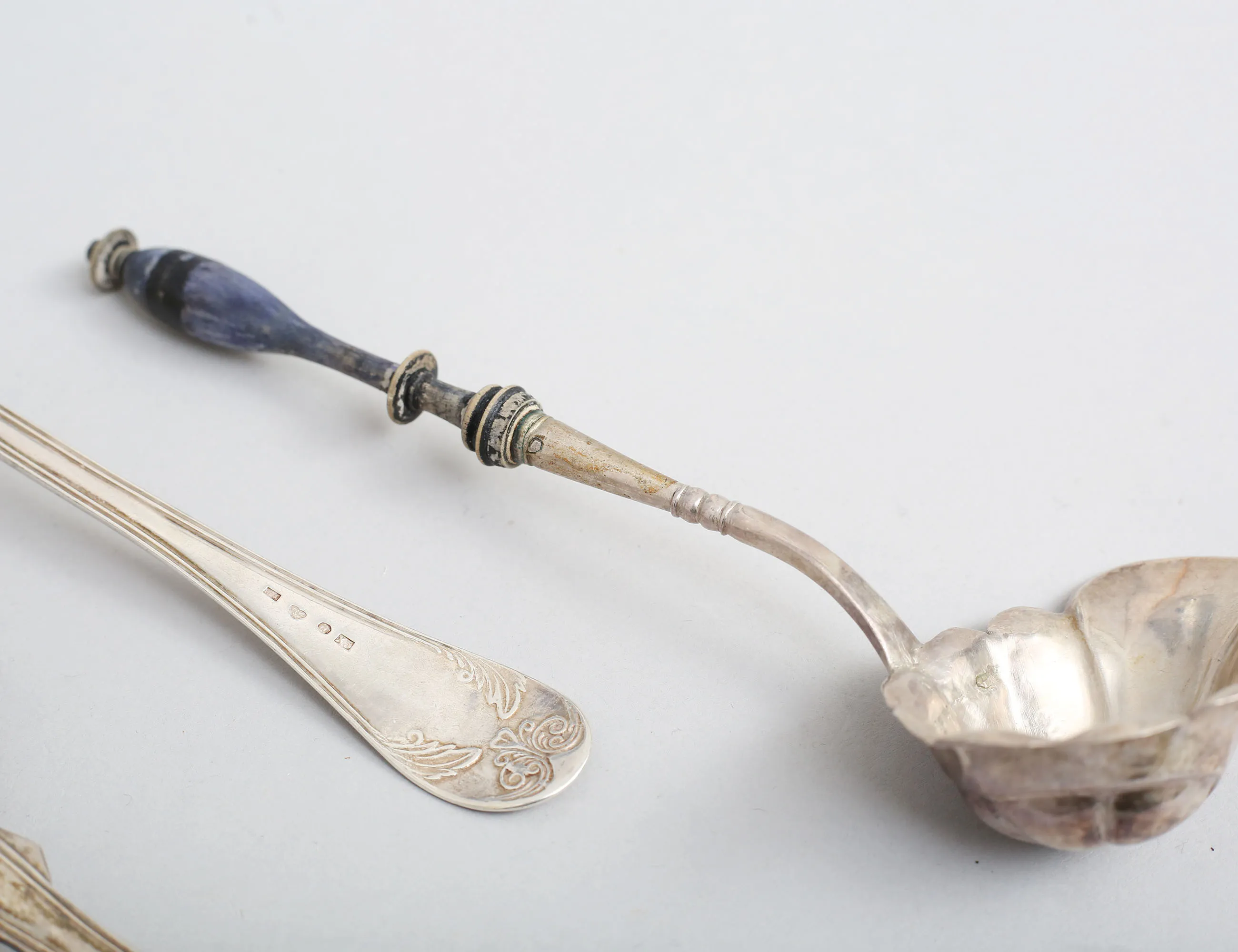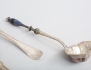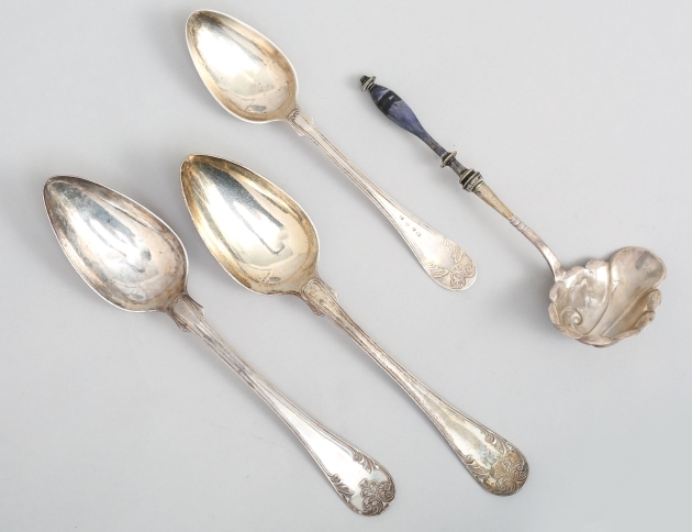 1 par matskedar modell gammal fransk, CP Hedin Jönköping 1874, såsslev med trähandtag 1800-tal, bordssked modell gammal fransk, Ahnström Växjö 1876, vikt 157 gram inklusive såsslev