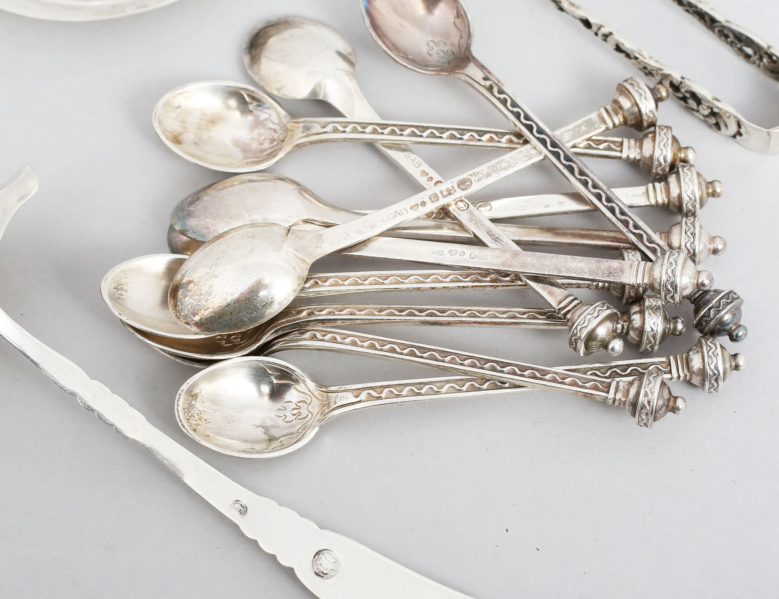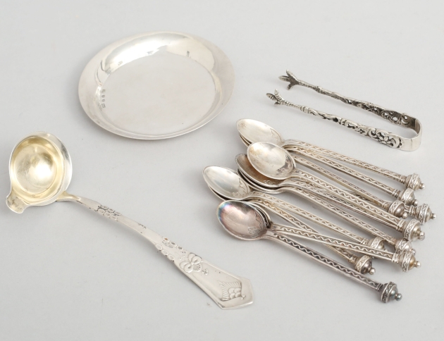 11 kaffeskedar liten modell, vågbandsdekor, GAB Stockholm 1944, fat Zackrisson Jönköping 1923, diameter 7, såsslev Danmark längd 12, sockertång längd 7,5, vikt 163 gram