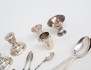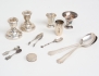 1 par ljusstakar Birmingham England 1929, höjd 6, fyllda bottnar, bordsskedar 1 par, 3 bägare, dosa, salktskedar 1 par, sked, sockertång, vikt 216 gram exklusive ljusstakar
