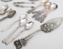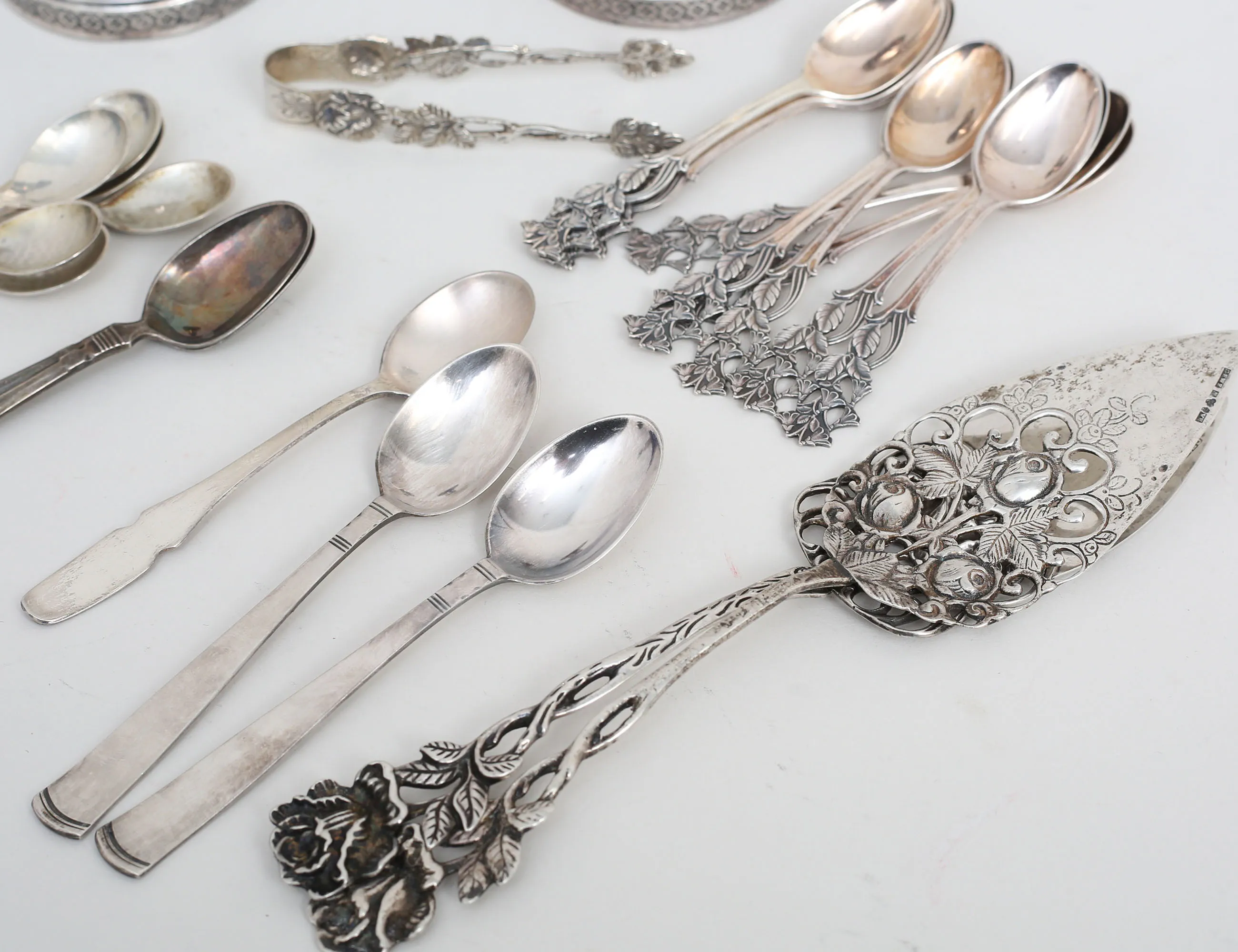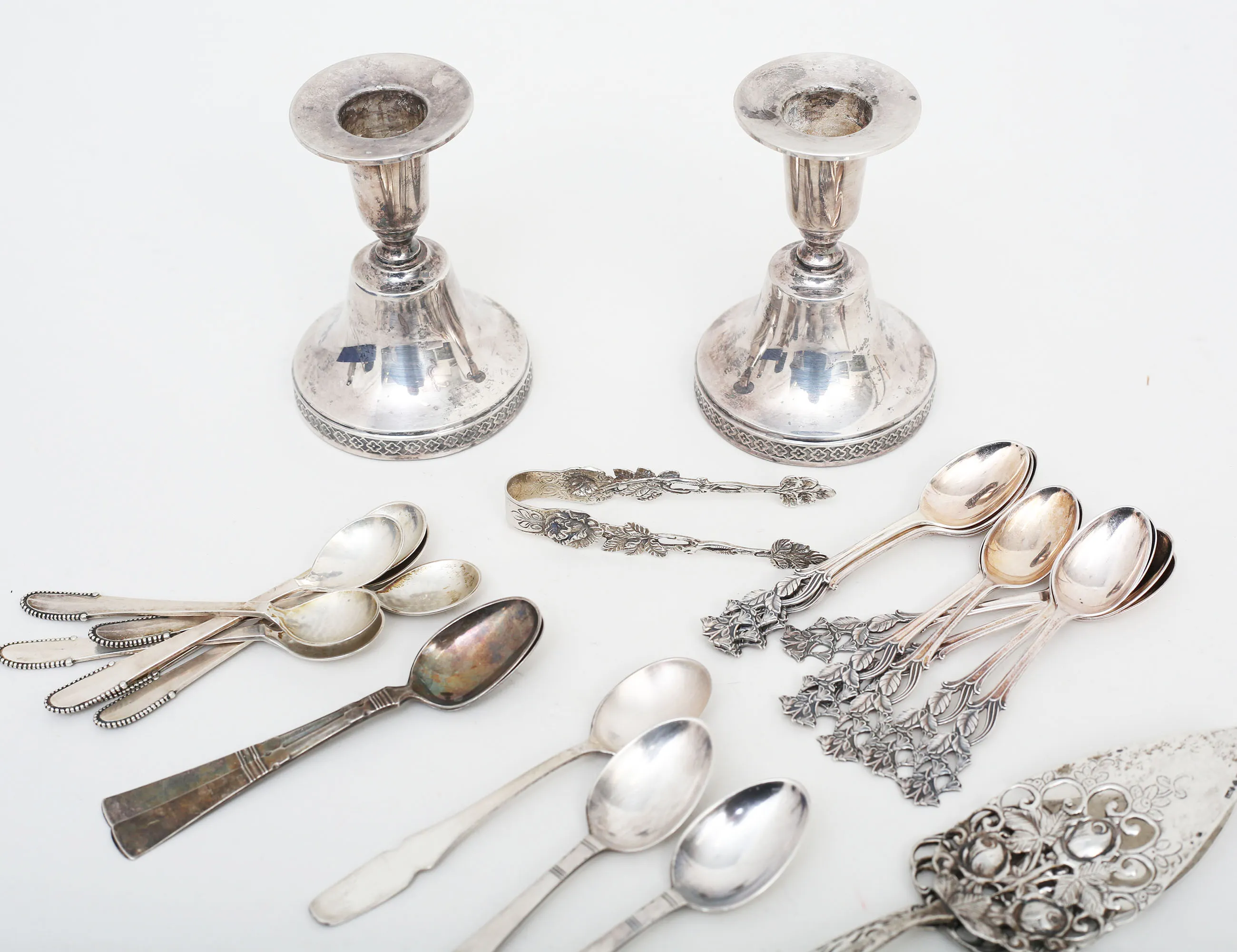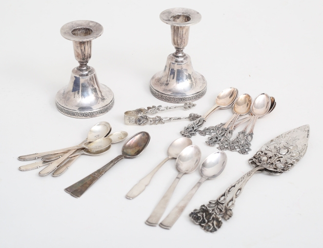 1 par ljusstakar Ceson Göteborg 1979, höjd 9,5, fyllda bottnar, 2 kakspadar och sockertång modell "Rosen", Gewe Malmö, kaffeskedar 1 par modell "Rosenholm", 6 kaffeskedar Danmark, kaffeskedar 10+2 Norge, kaffesked, vikt 269 gram exklusive ljusstakar