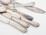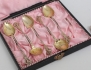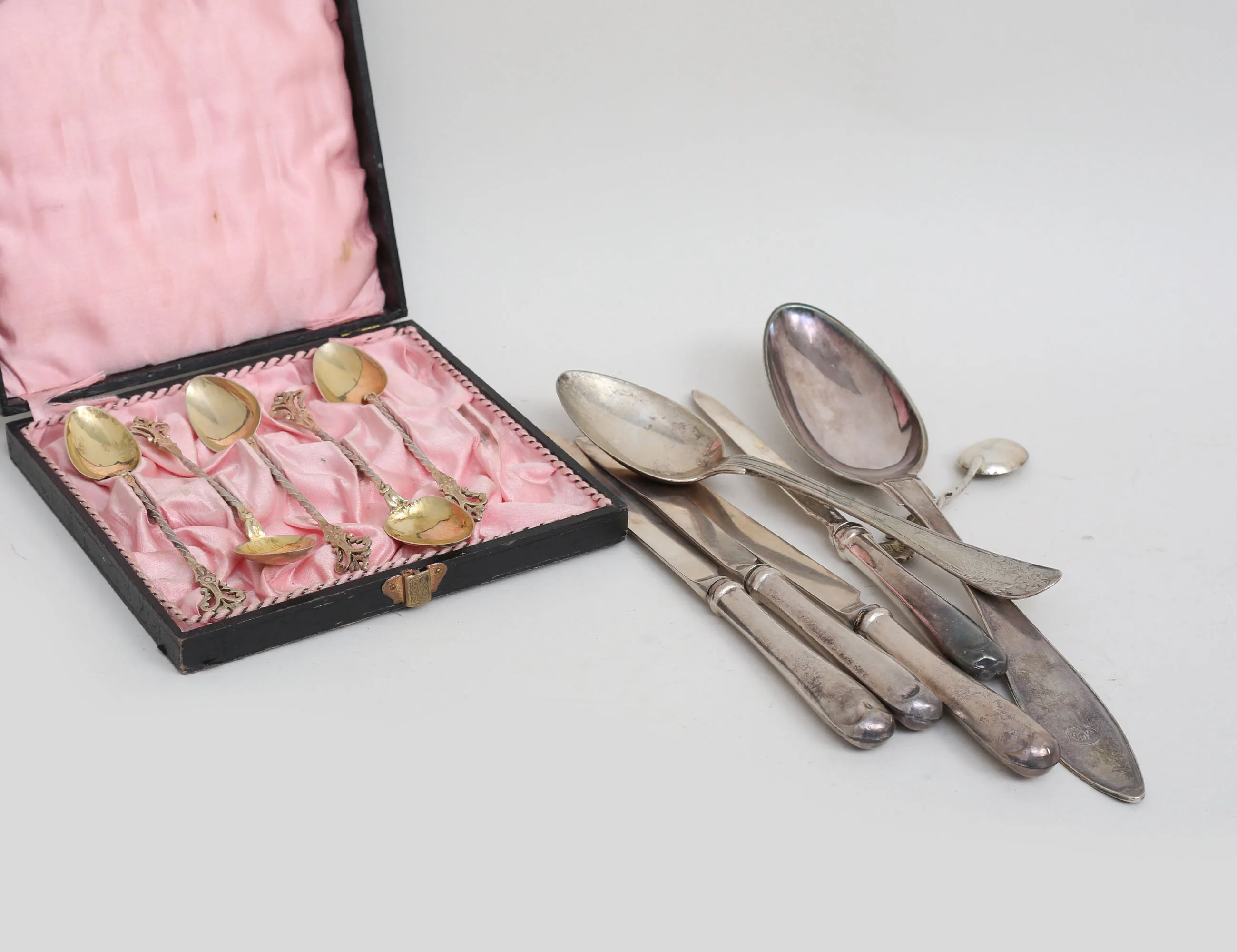 matsked Laurentius Eriksson Uddevalla 1828, 5 kaffeskedar J.G. Hentzell Kalmar 1899, förgyllda, dessertsked 1800-tal, modell "gammalfransk", 4 fruktknivar modell "rosen", vikt 286 gram