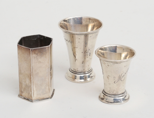 2 bägare silver, vikt 50 gram, höjd 5/6,5 (inskripton), vas hexagonal form, sterling, HBÖ Vetlanda (?) 2006, vikt 80 gram, höjd 6 (3)
