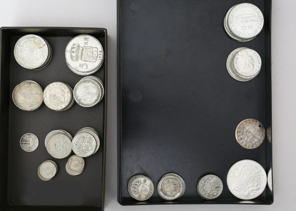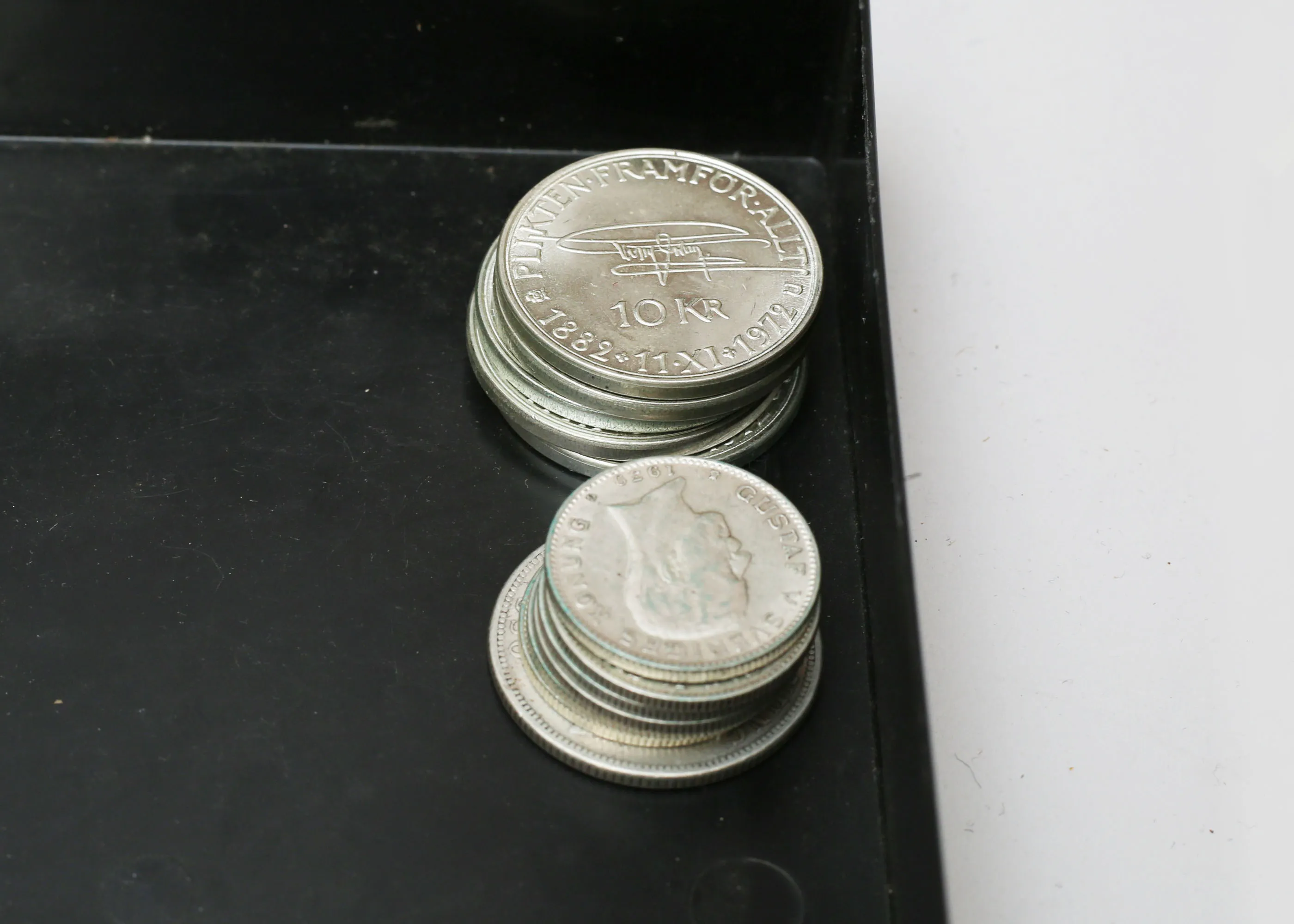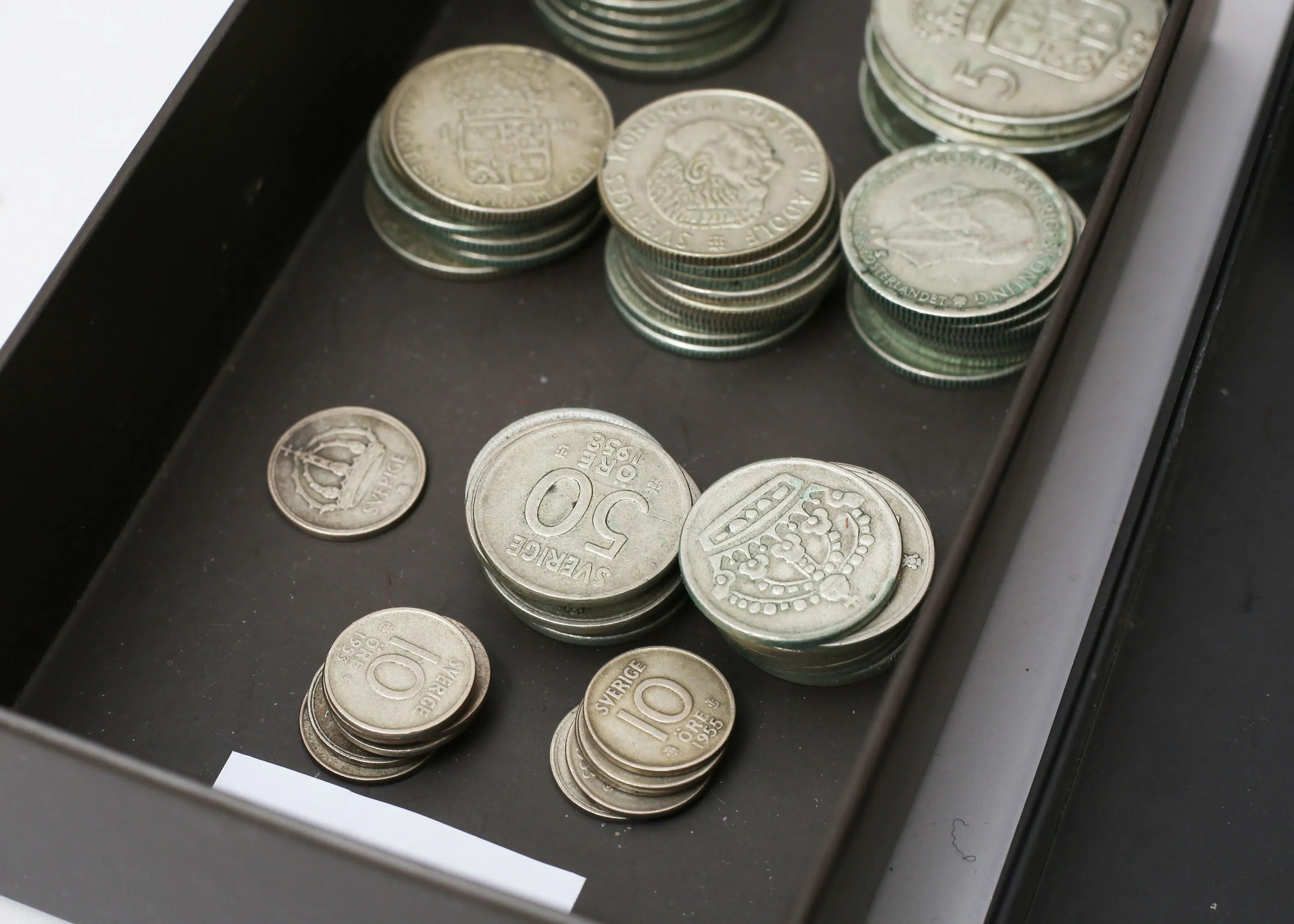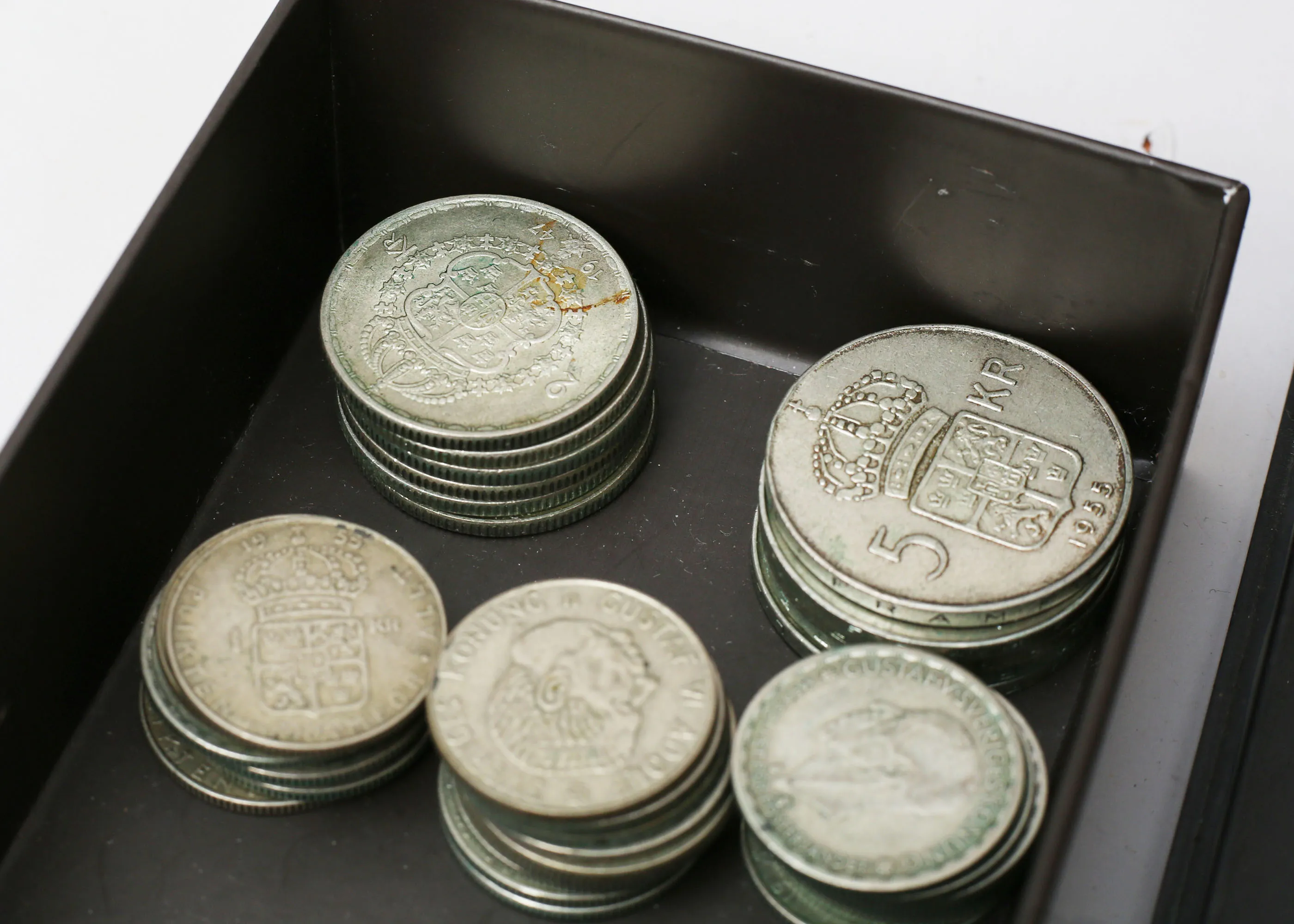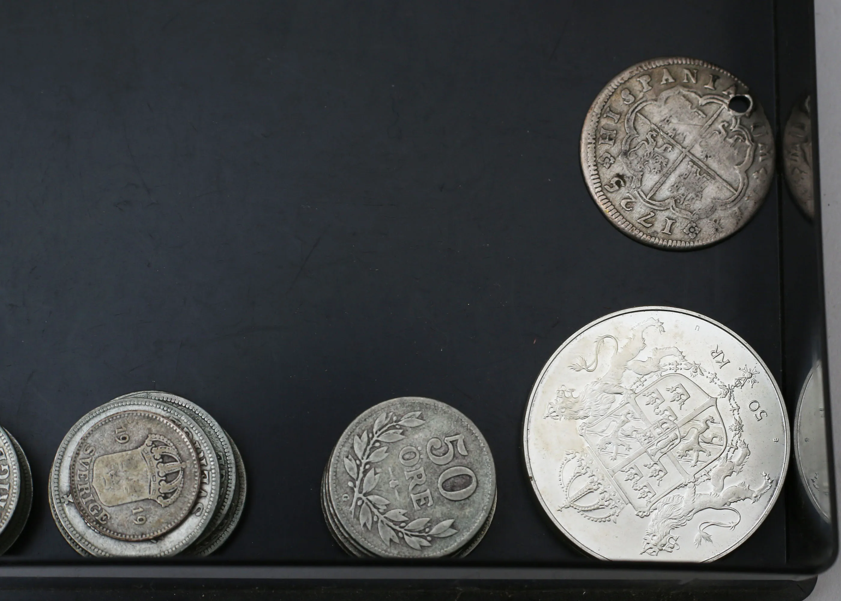 vikt: 925/1000 ca. 55 gram, 800-830/1000 ca. 157 gram, 600/1000 ca. 95 gram, 400/1000 ca. 450 gram, ett mynt 1725 (med borrat hål)