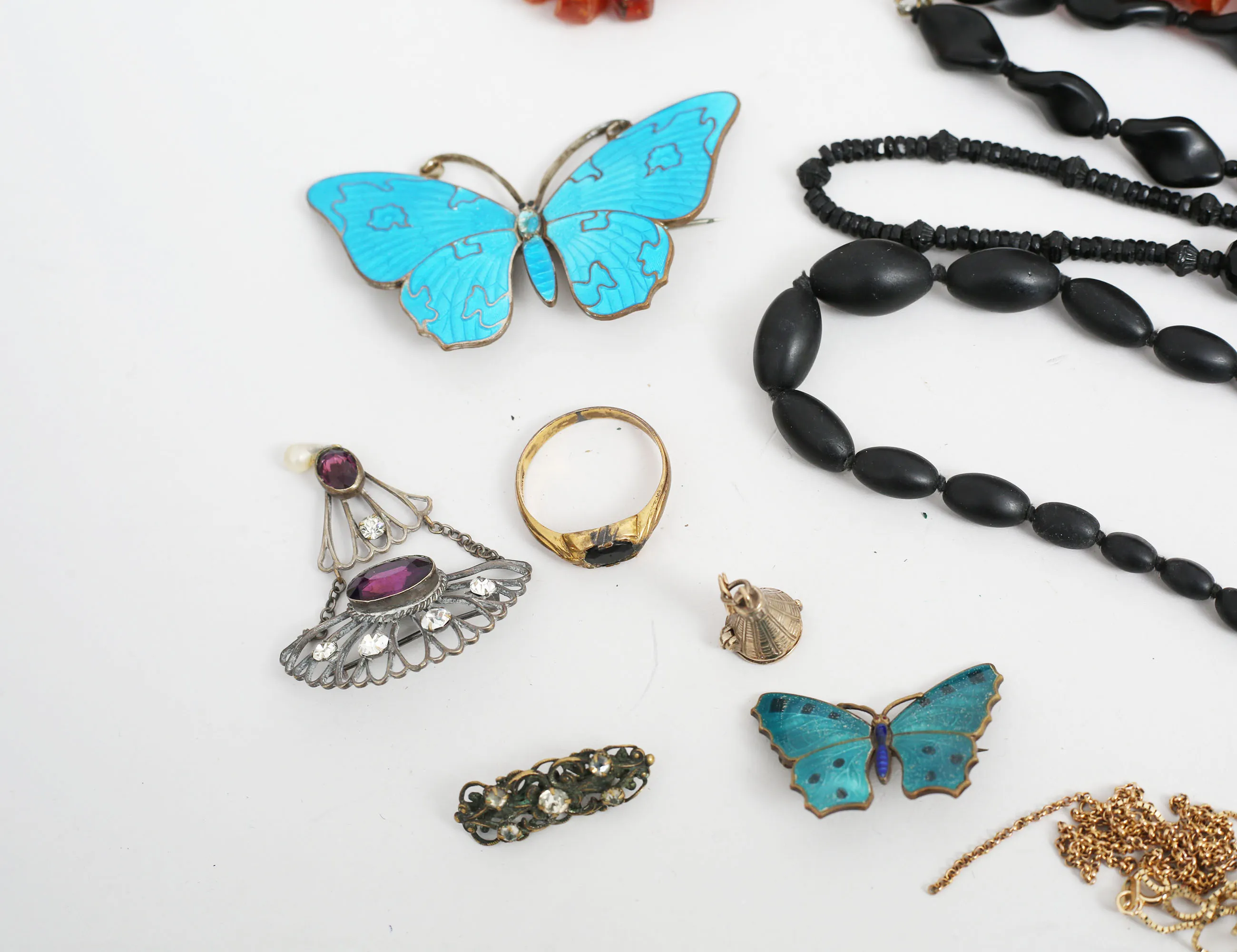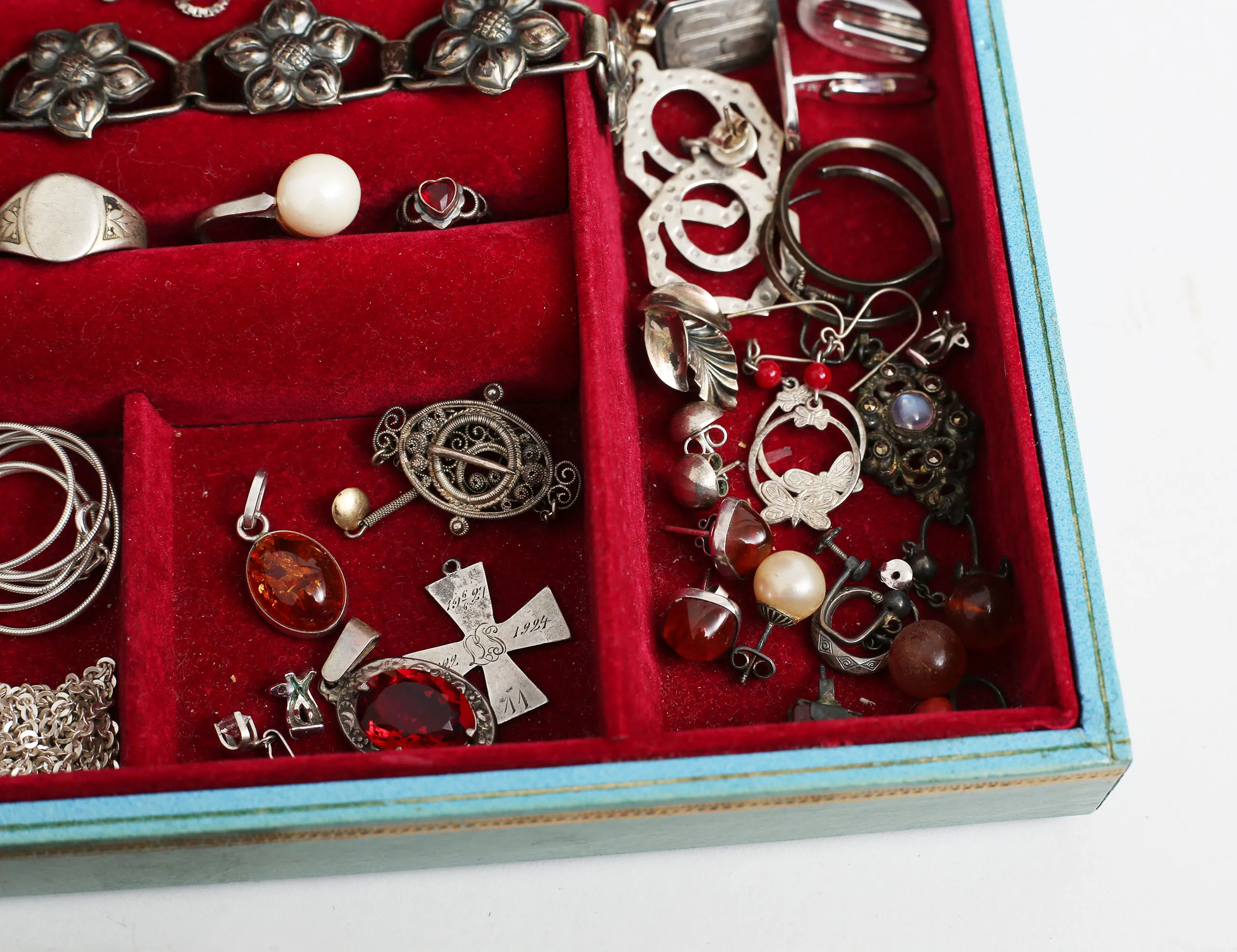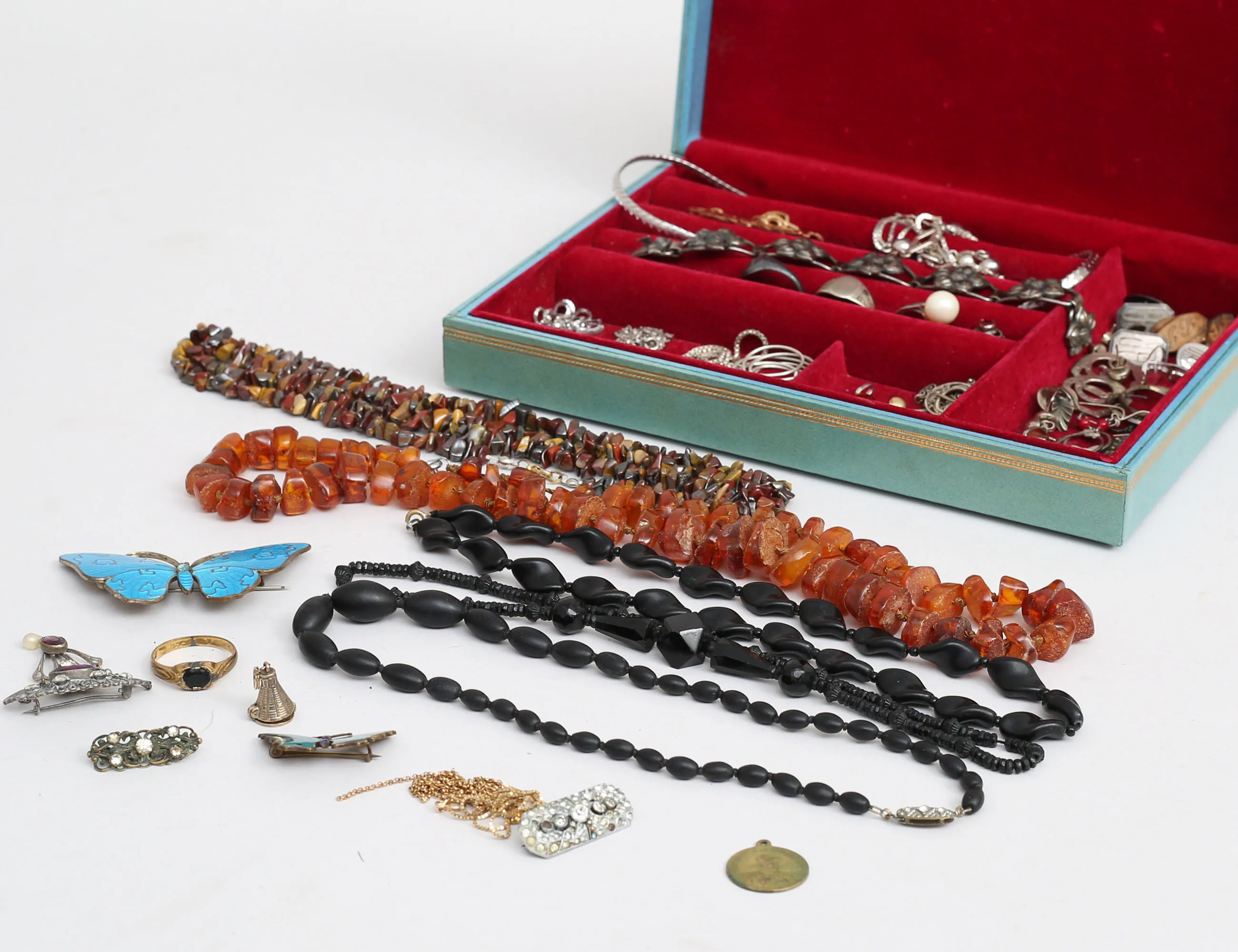 en mängd silversmycken i smyckeskrin, begravningssmycken, bärnsten, äldre bijouterier bla. 2 fjärilsbroscher med emalj