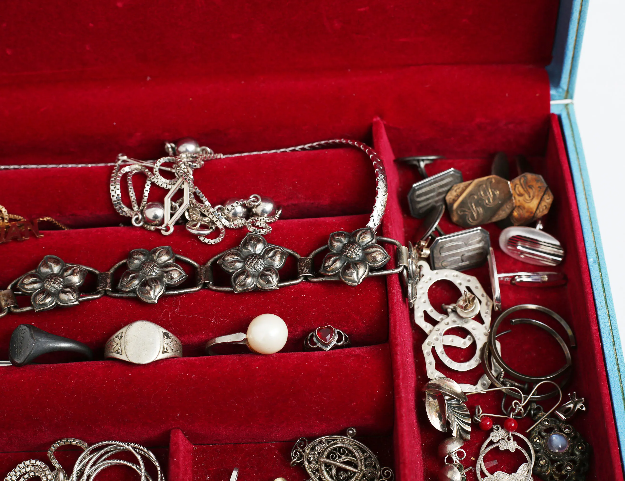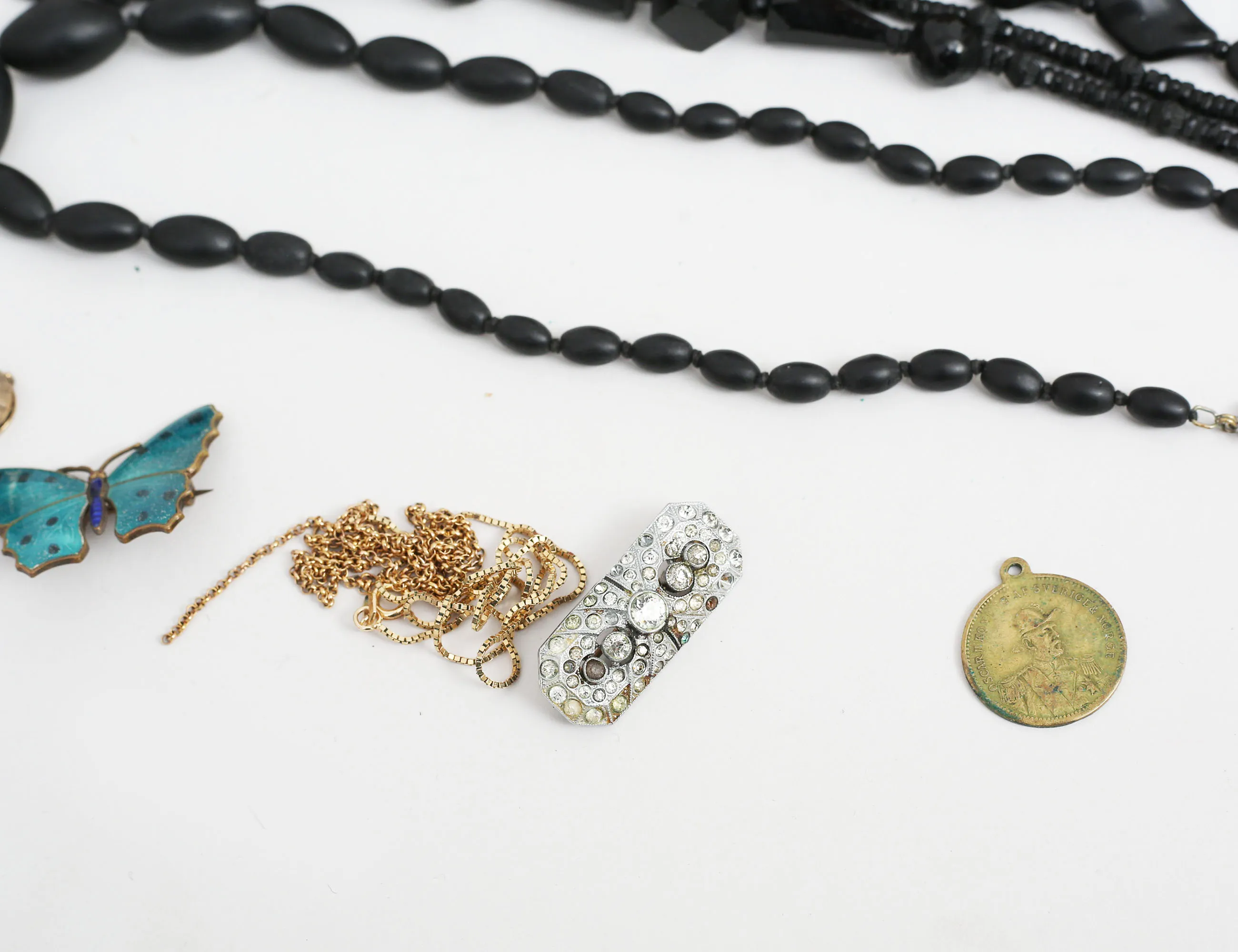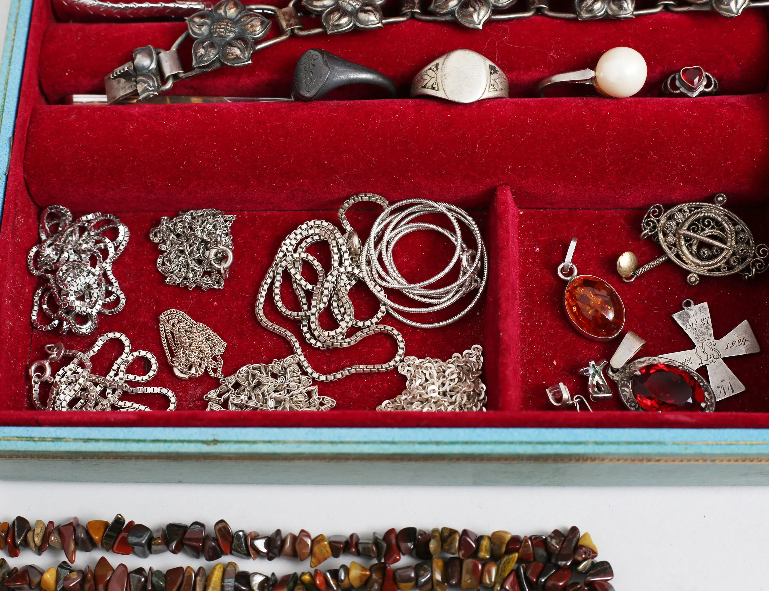en mängd silversmycken i smyckeskrin, begravningssmycken, bärnsten, äldre bijouterier bla. 2 fjärilsbroscher med emalj