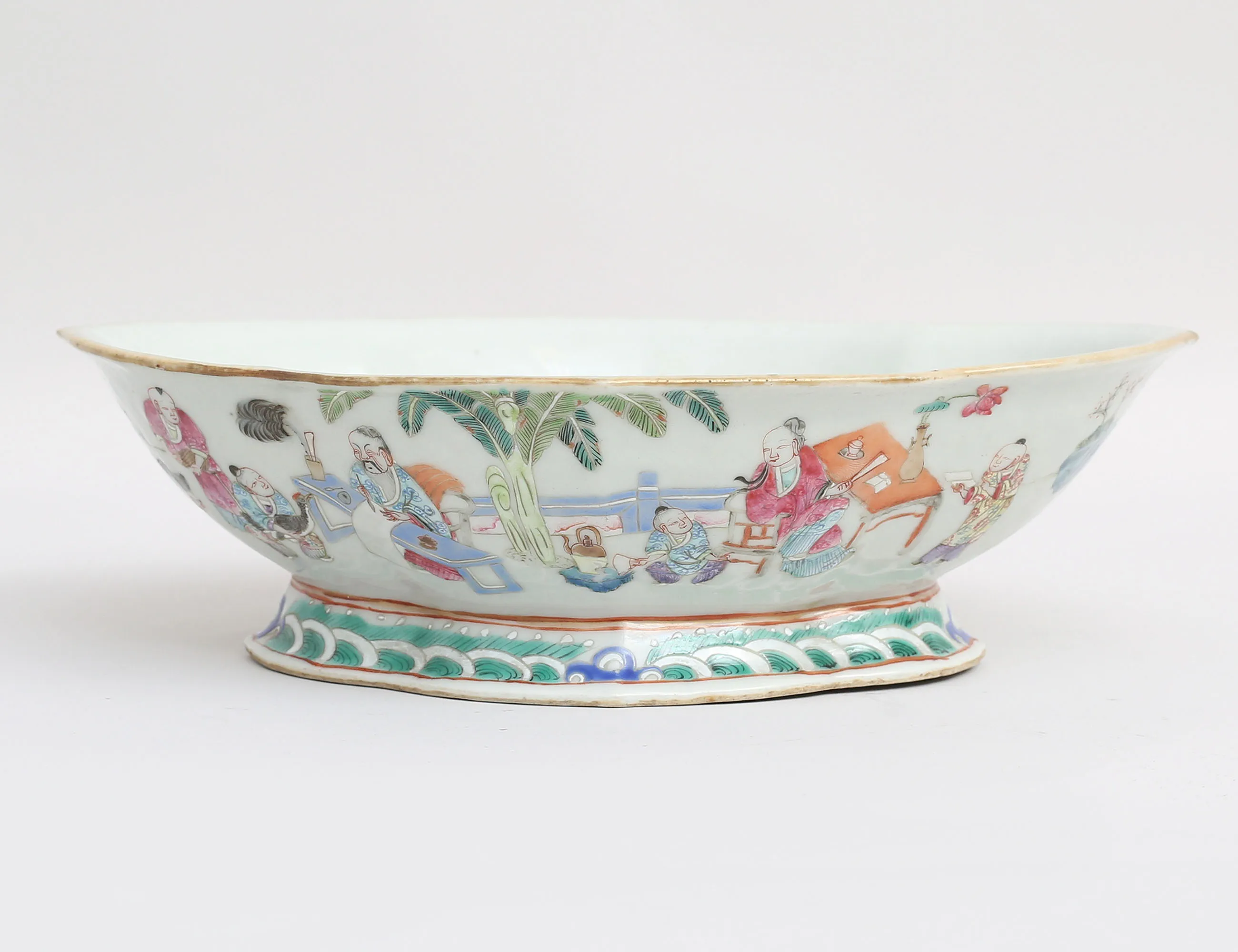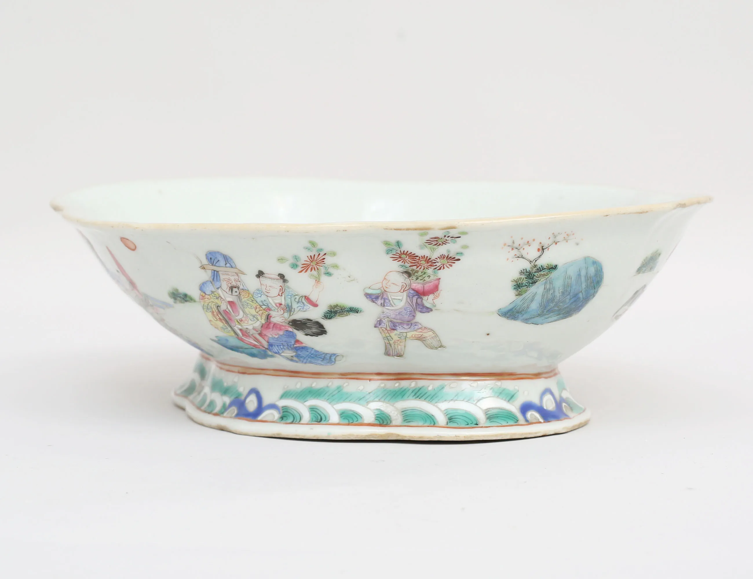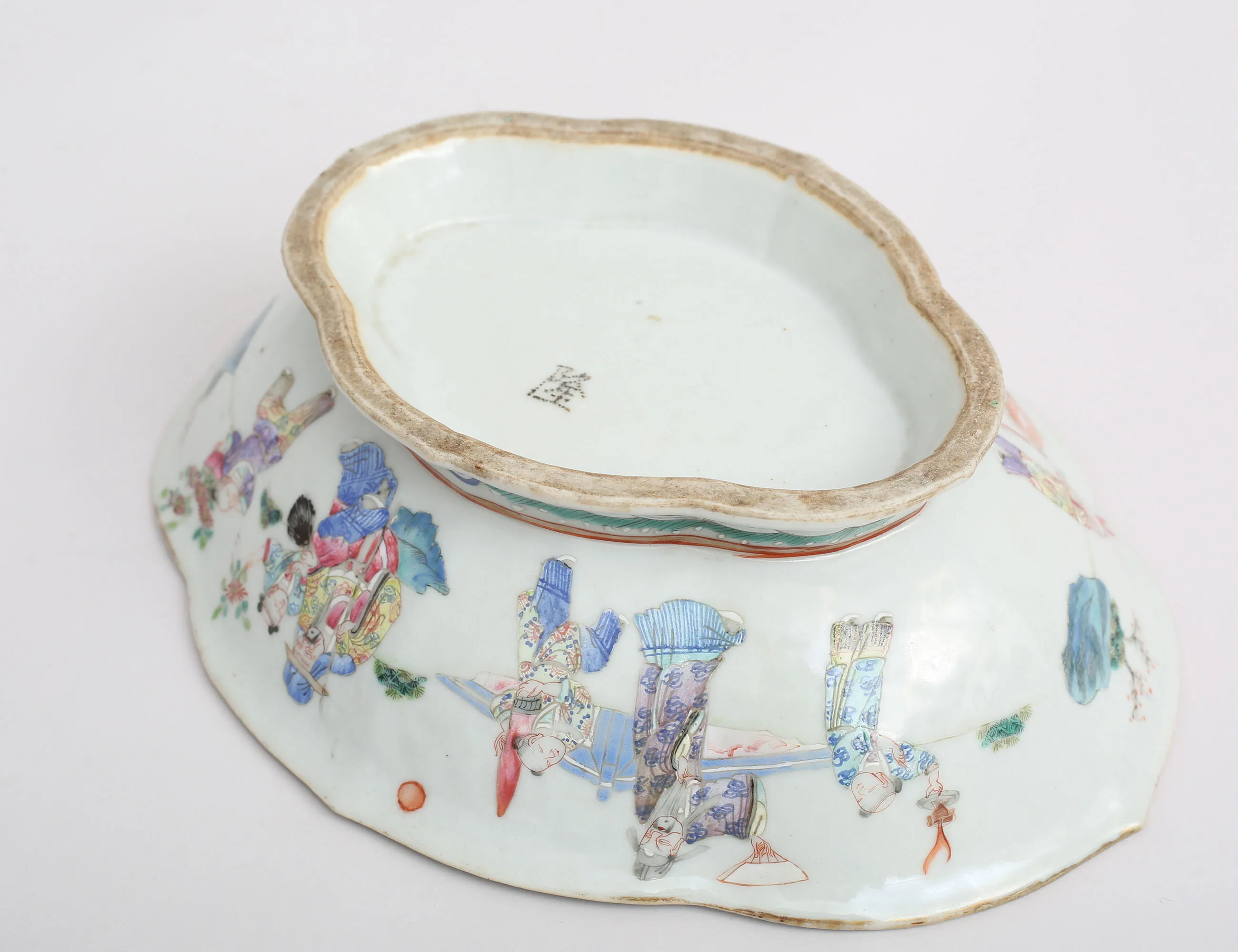 sen Qing, famille rose, polykrom emaljdekor av figurscener, profilerad kant, bottenmärke, höjd 8, bredd 27,5x21,5 (insidans botten med obetydlig tillverkningsdefekt i glasyren)